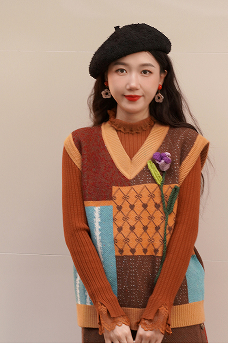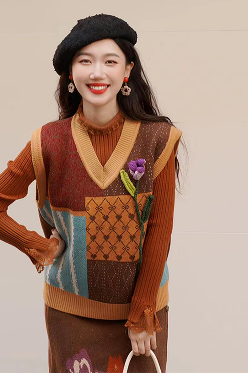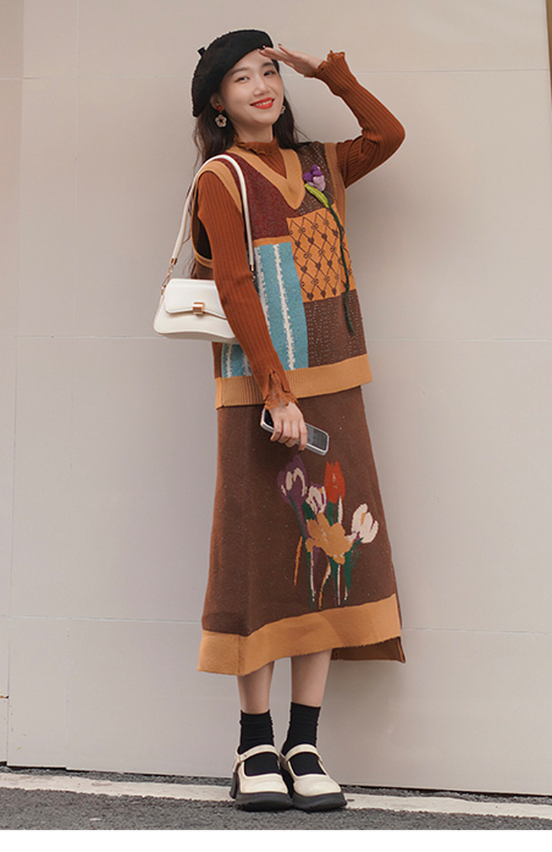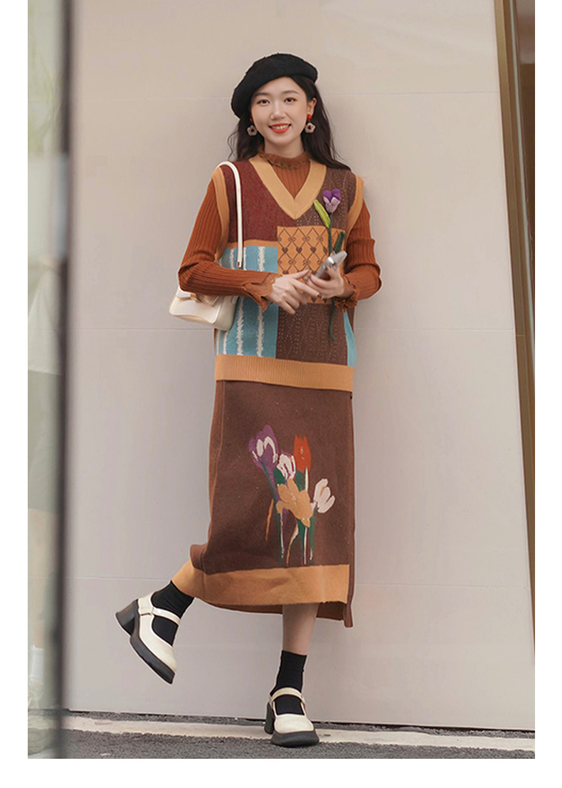 两三事梦境织语 冬季新款森女风立体花朵针织两件套女时尚套装
