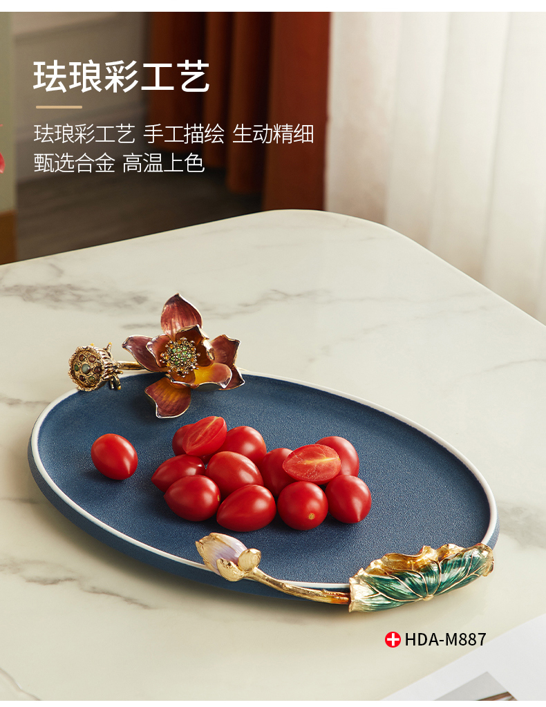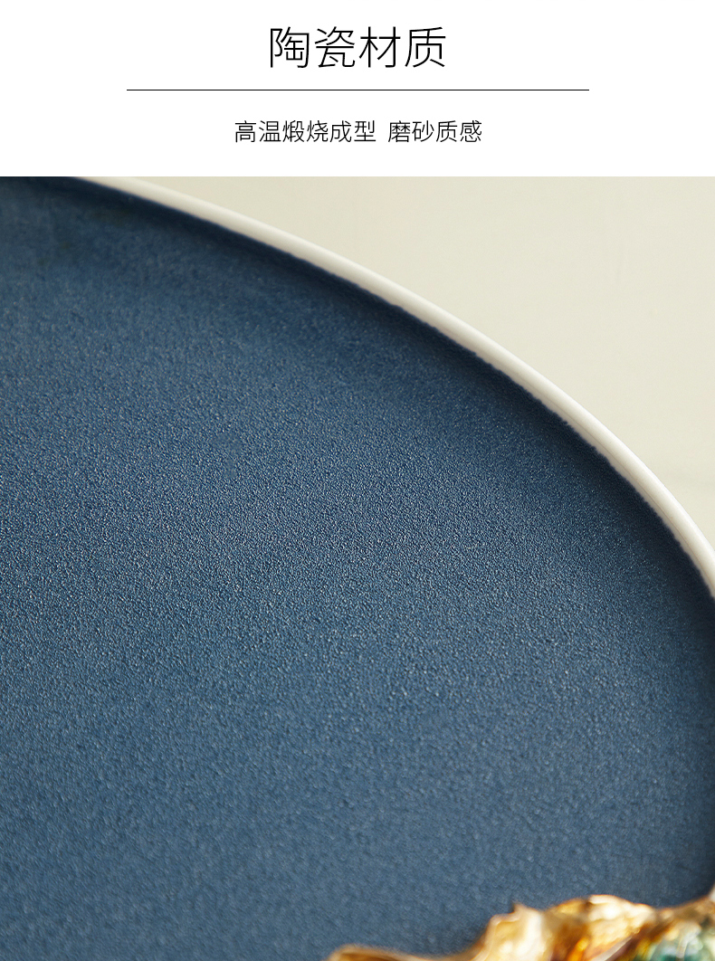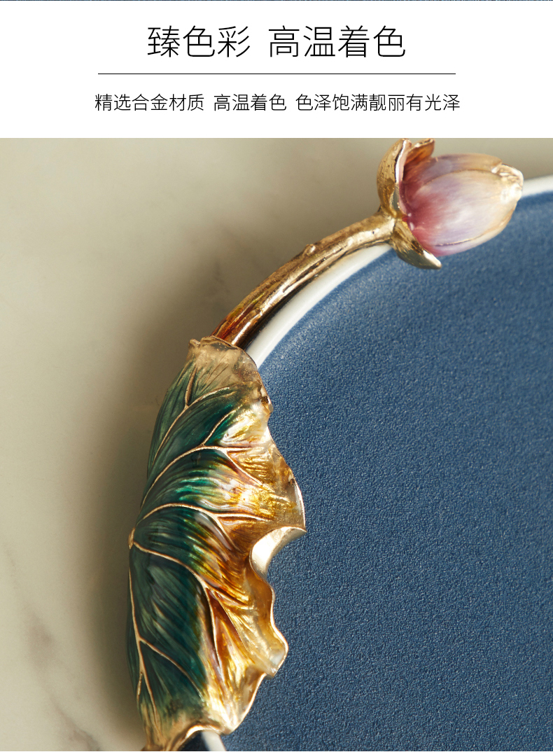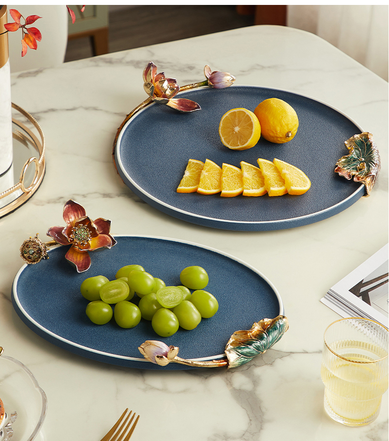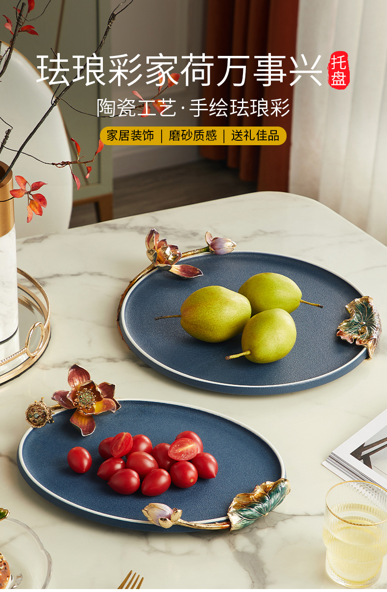 高级陶瓷果盘家用客厅茶几珐琅彩家荷万事兴欧式托盘轻奢高档中式珐琅彩蓝色圆托盘