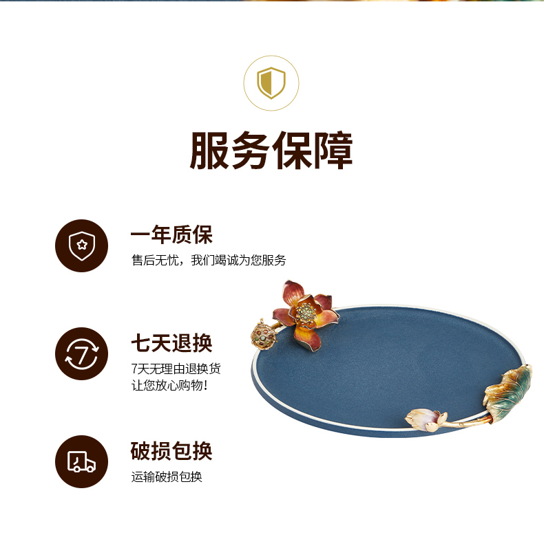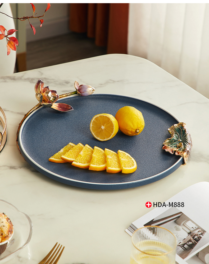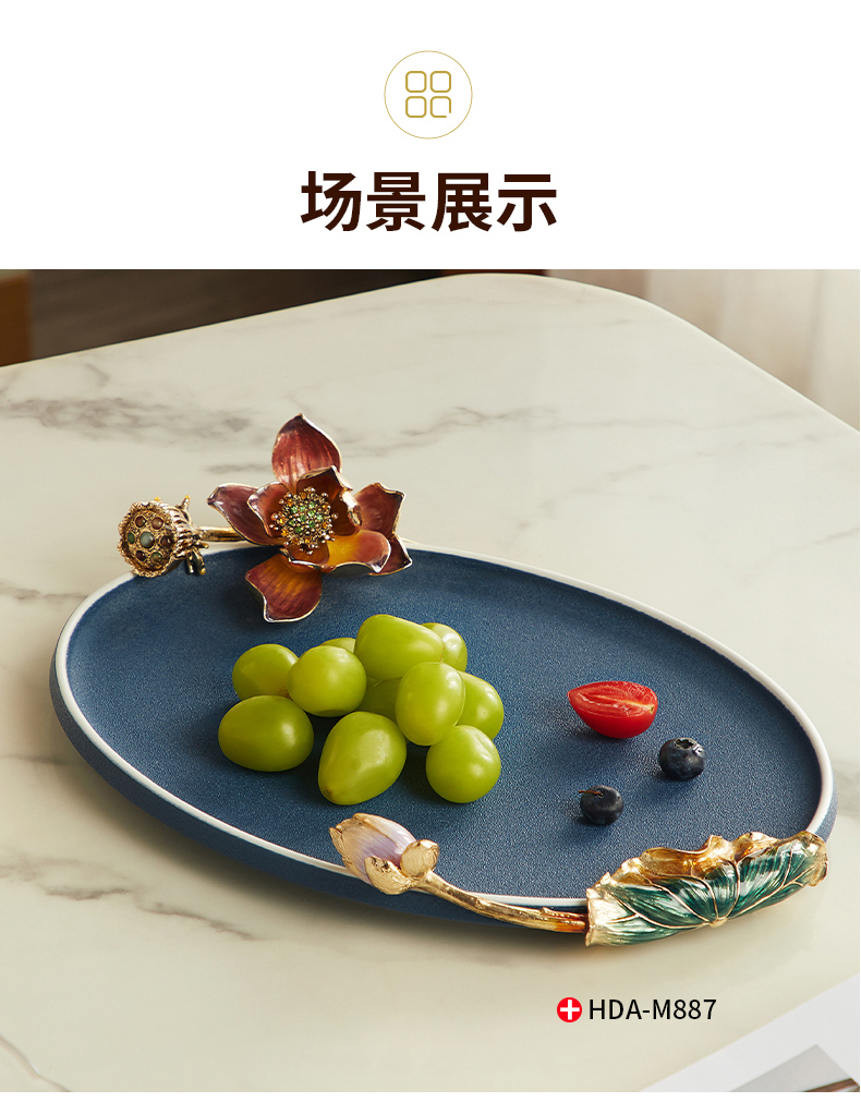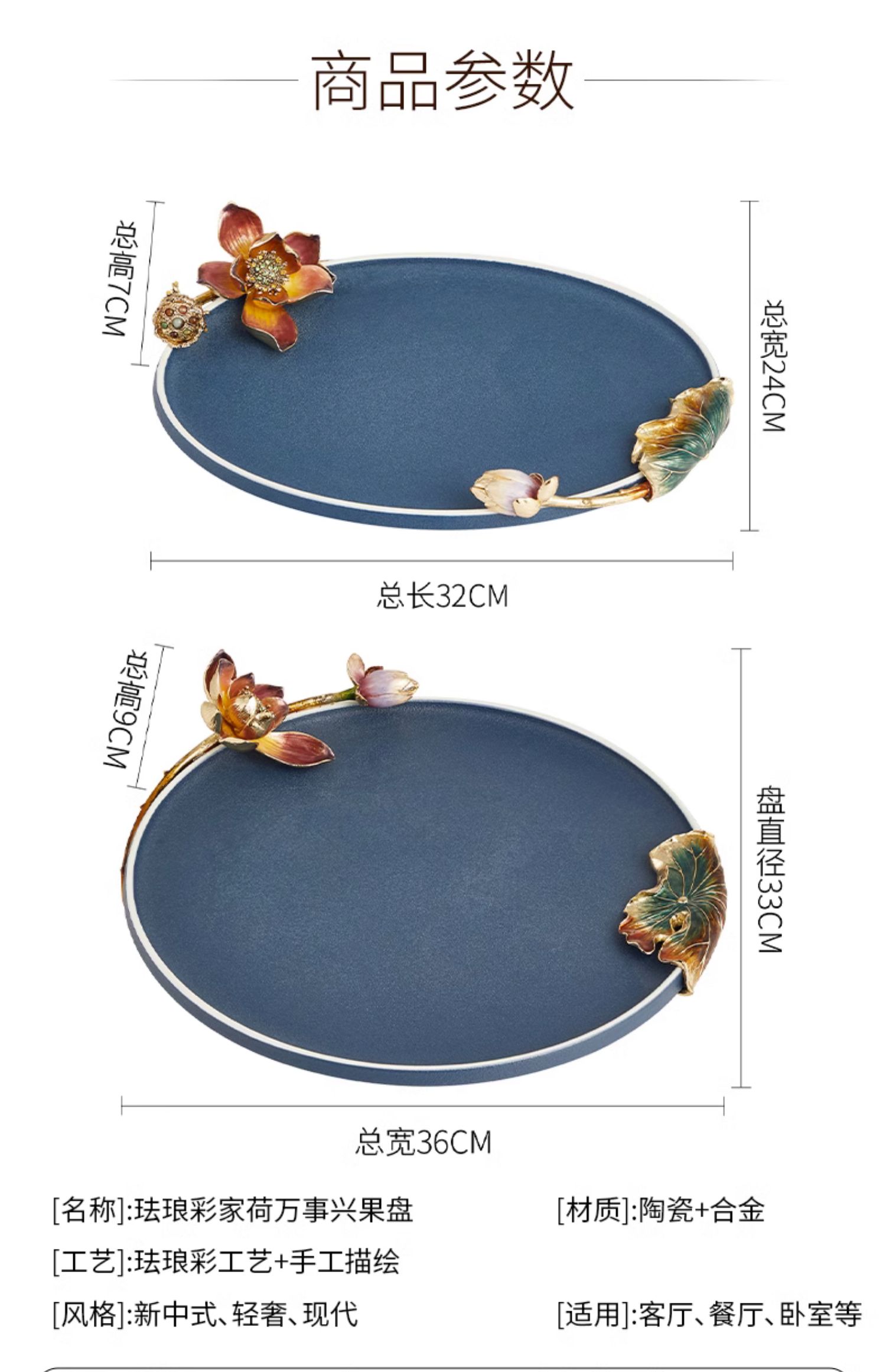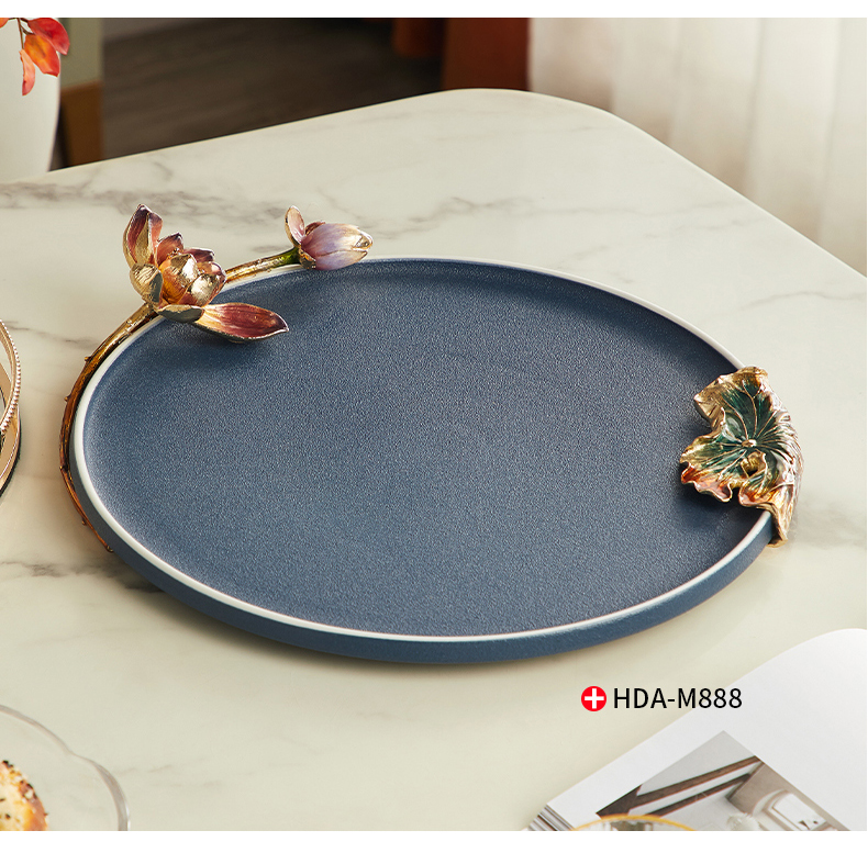 高级陶瓷果盘家用客厅茶几珐琅彩家荷万事兴欧式托盘轻奢高档中式珐琅彩蓝色圆托盘