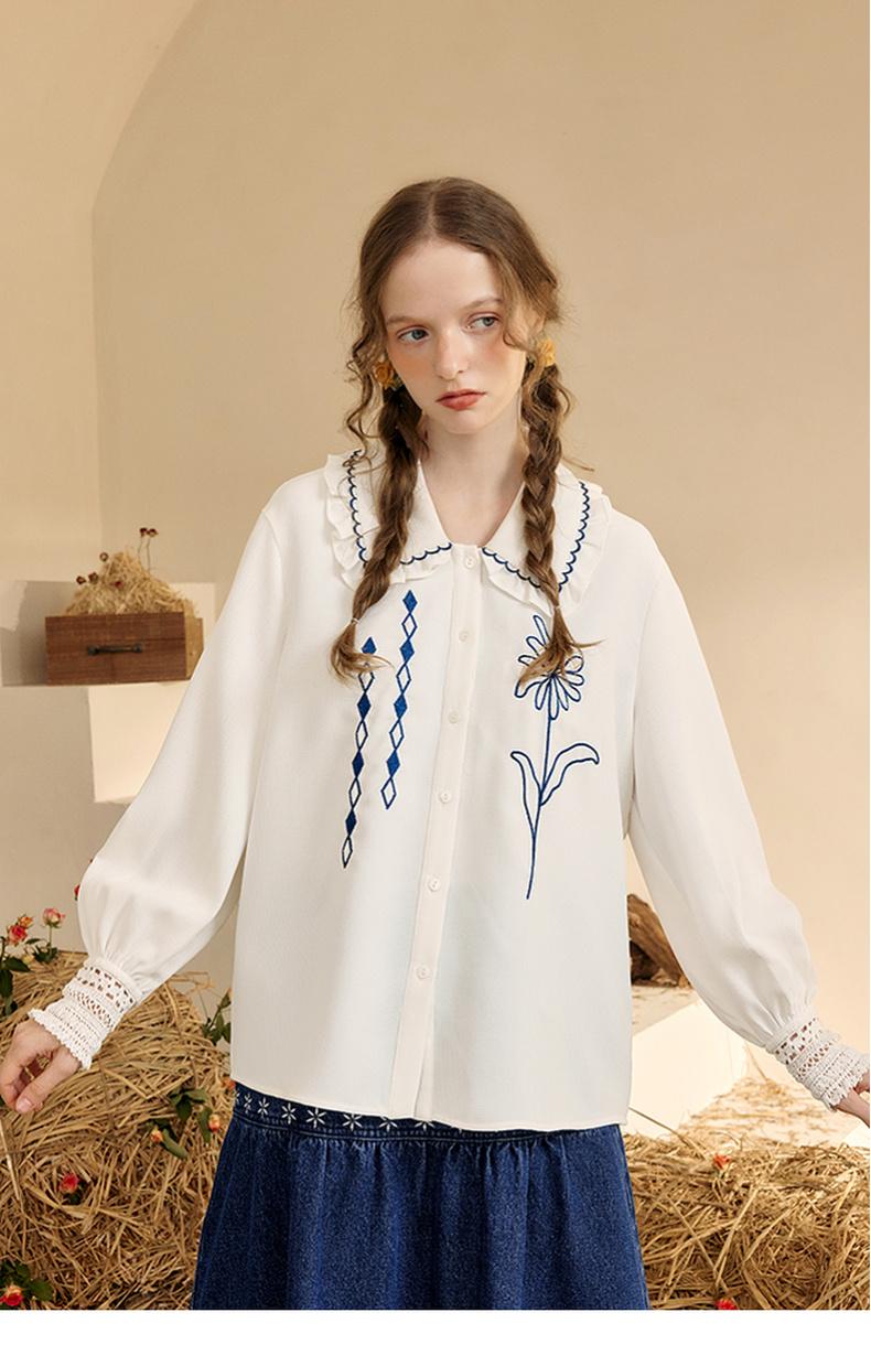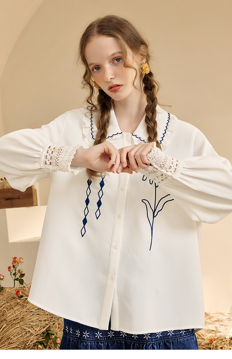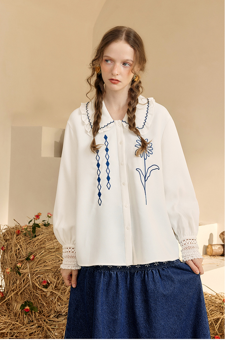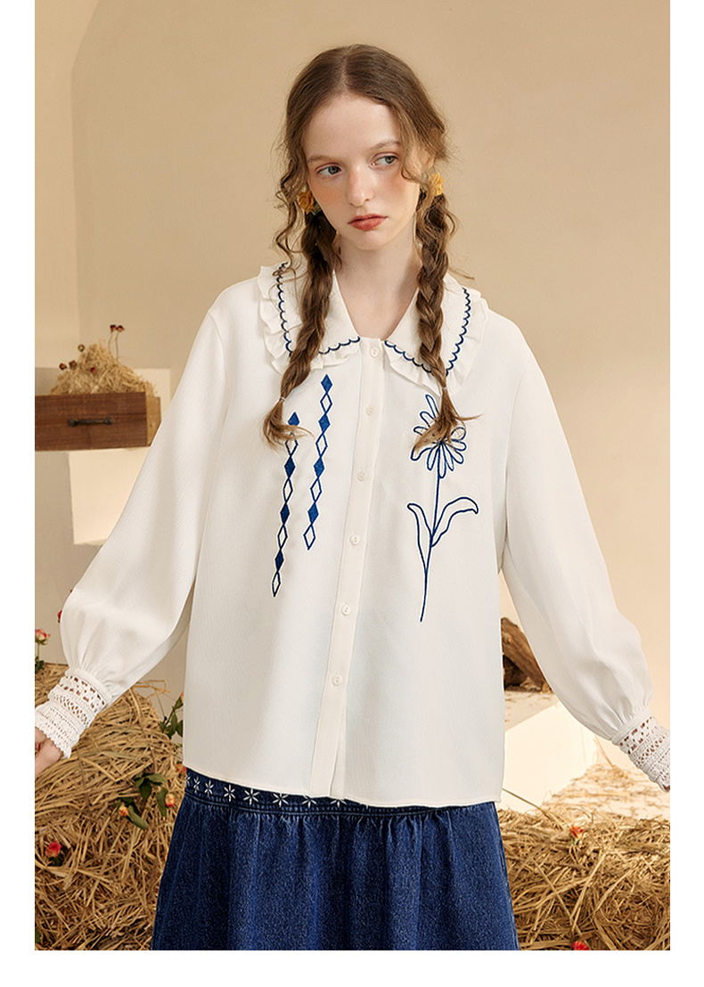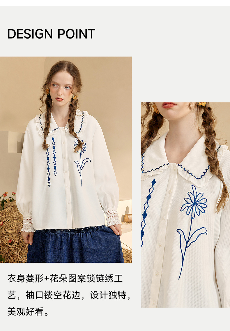 两三事舞动花魅2024秋季新款文艺风荷叶边翻领绣花长袖衬衫女宽松