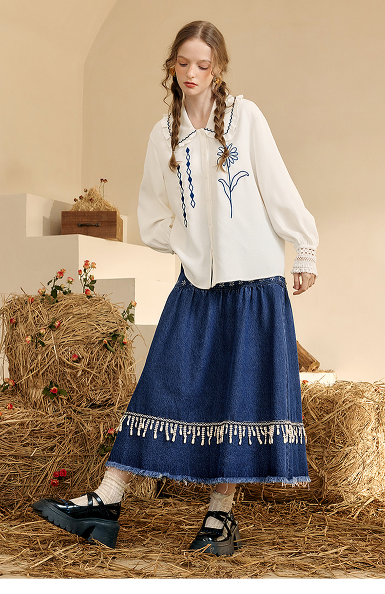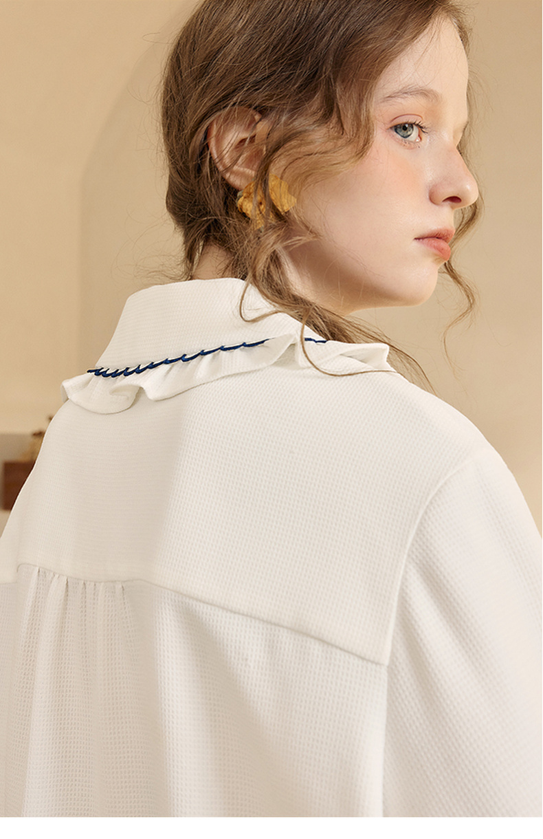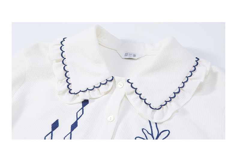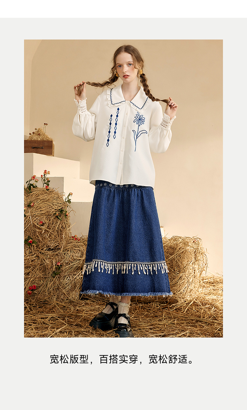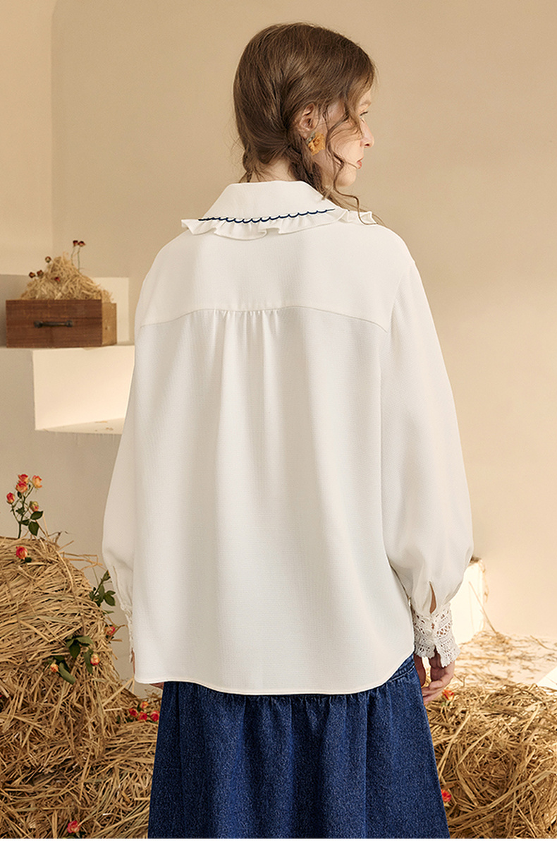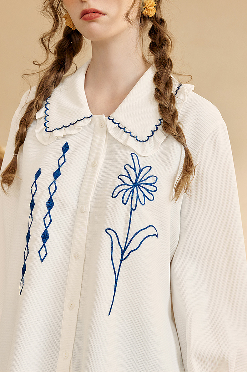两三事舞动花魅2024秋季新款文艺风荷叶边翻领绣花长袖衬衫女宽松