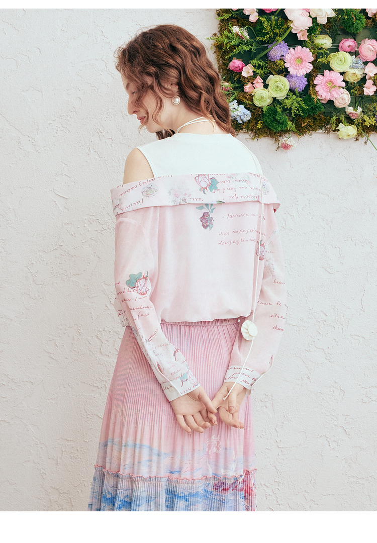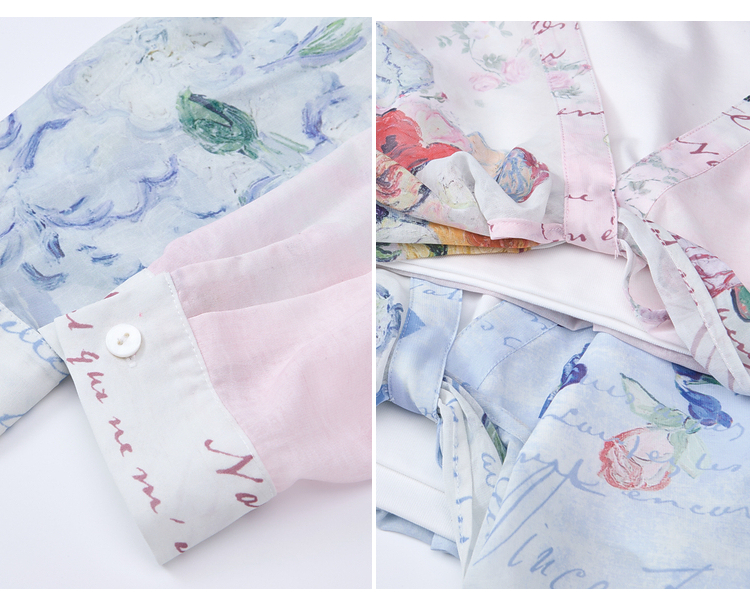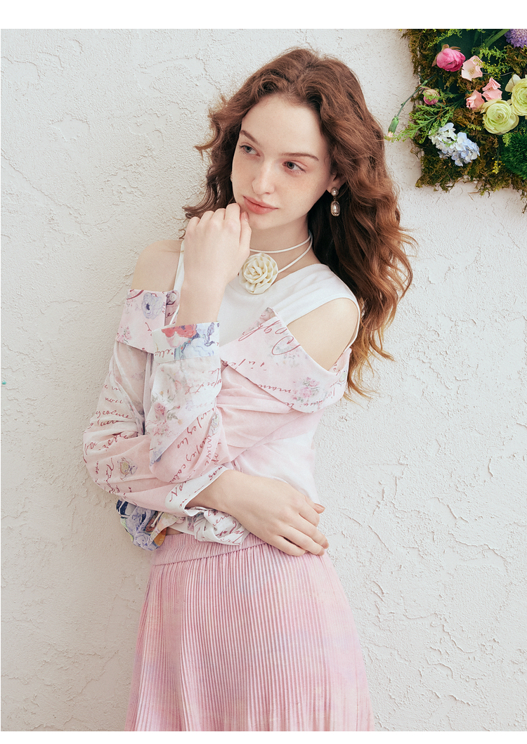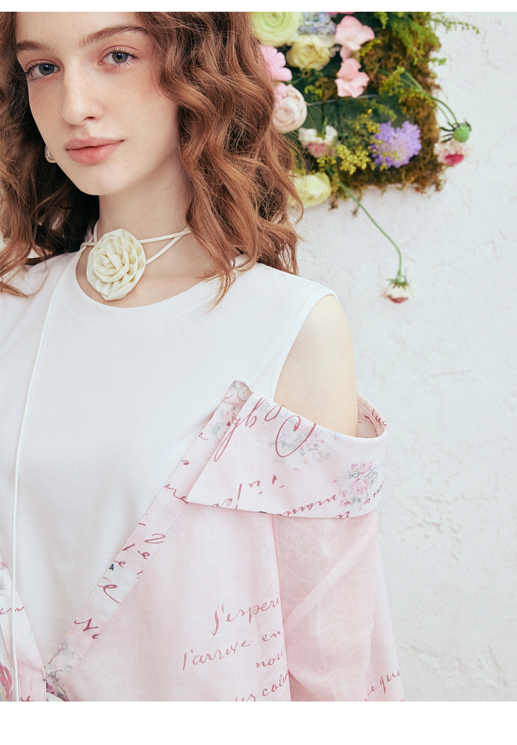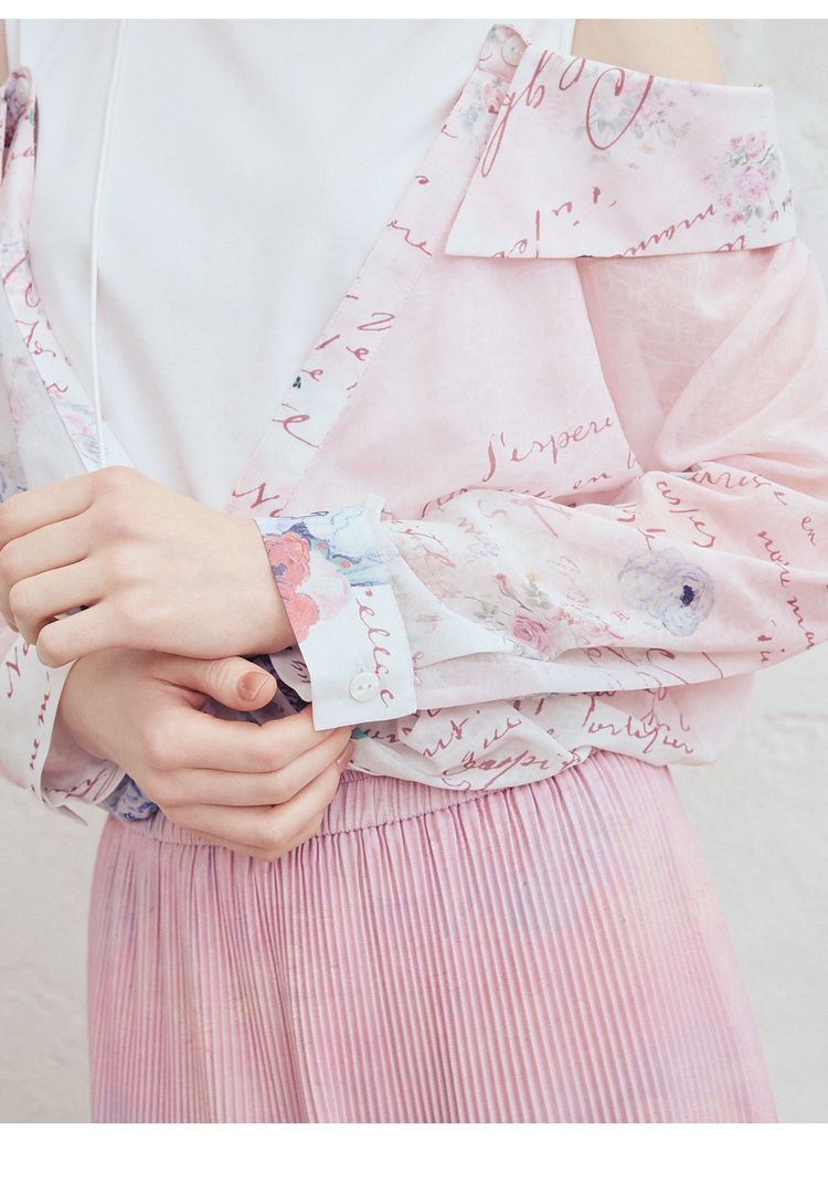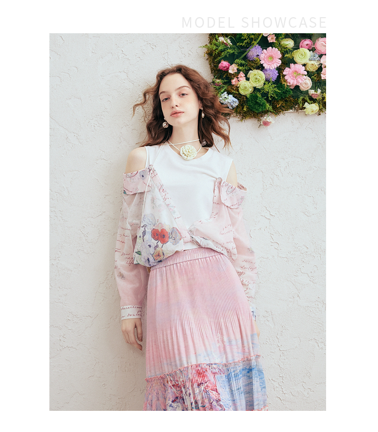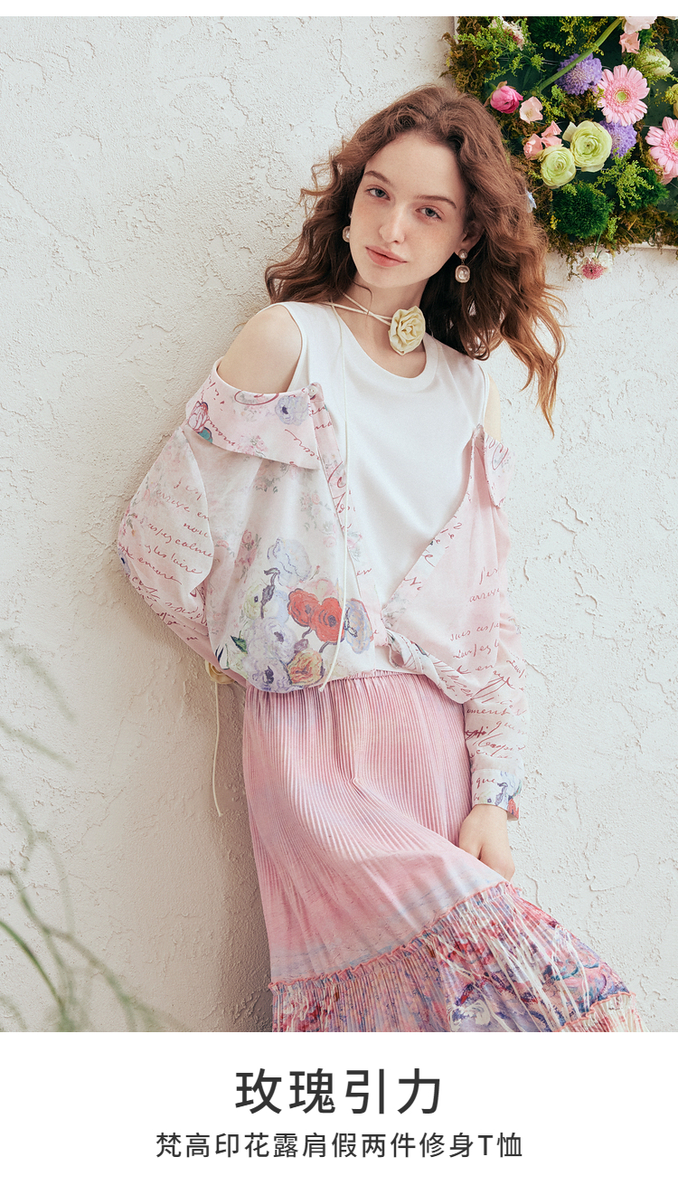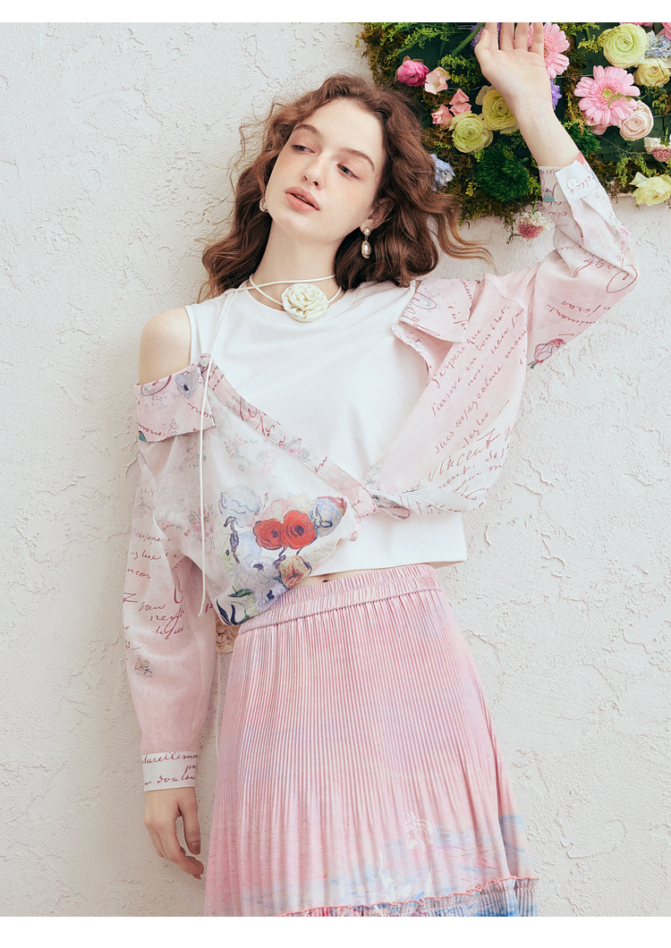 两三事梵高文艺玫瑰引力2026春新款甜美印花拼接露肩假两件衬衫女