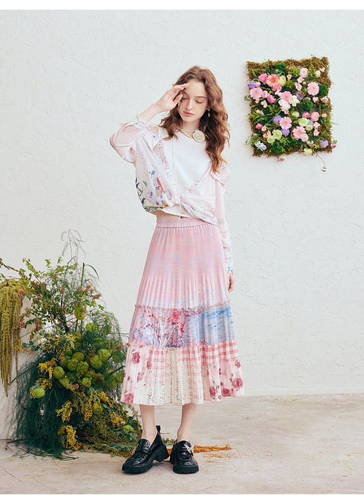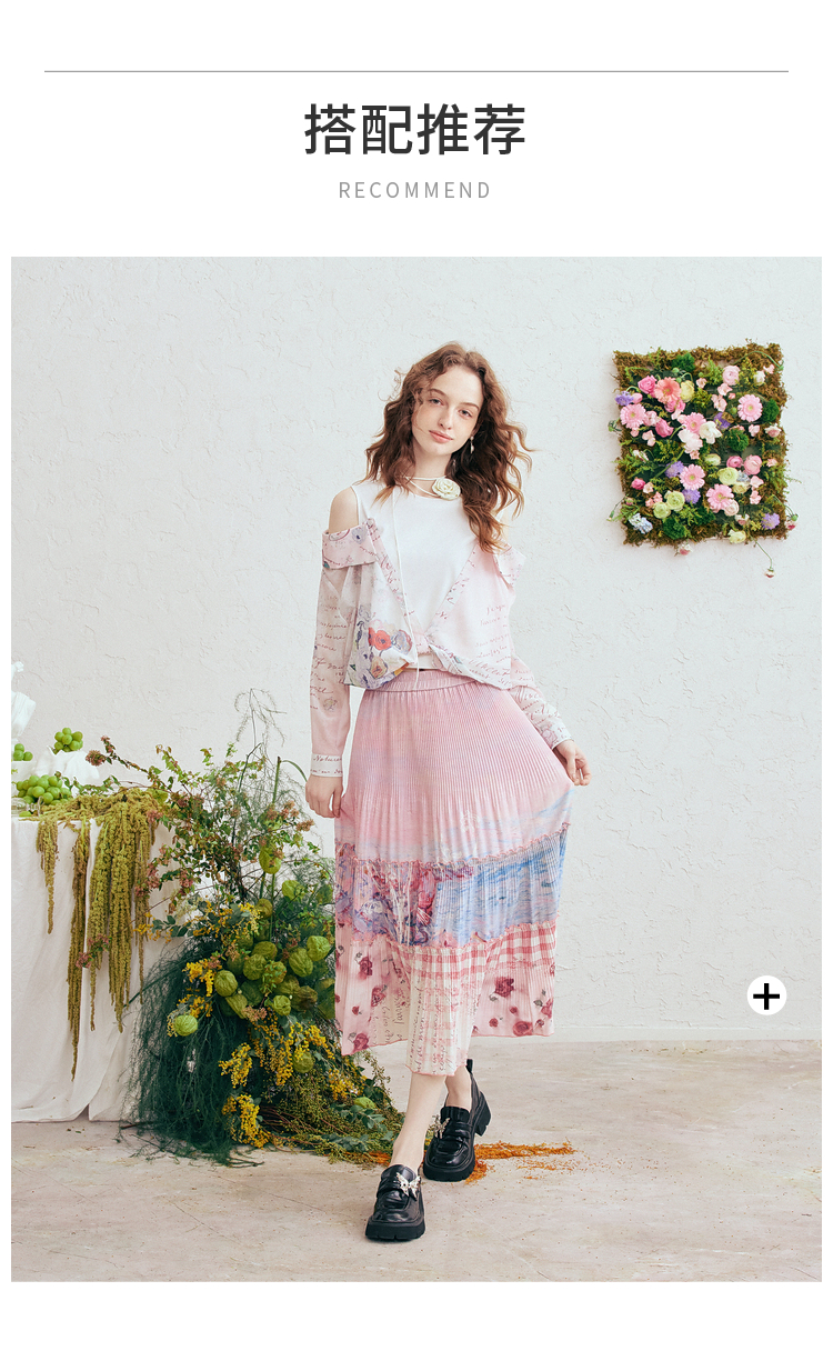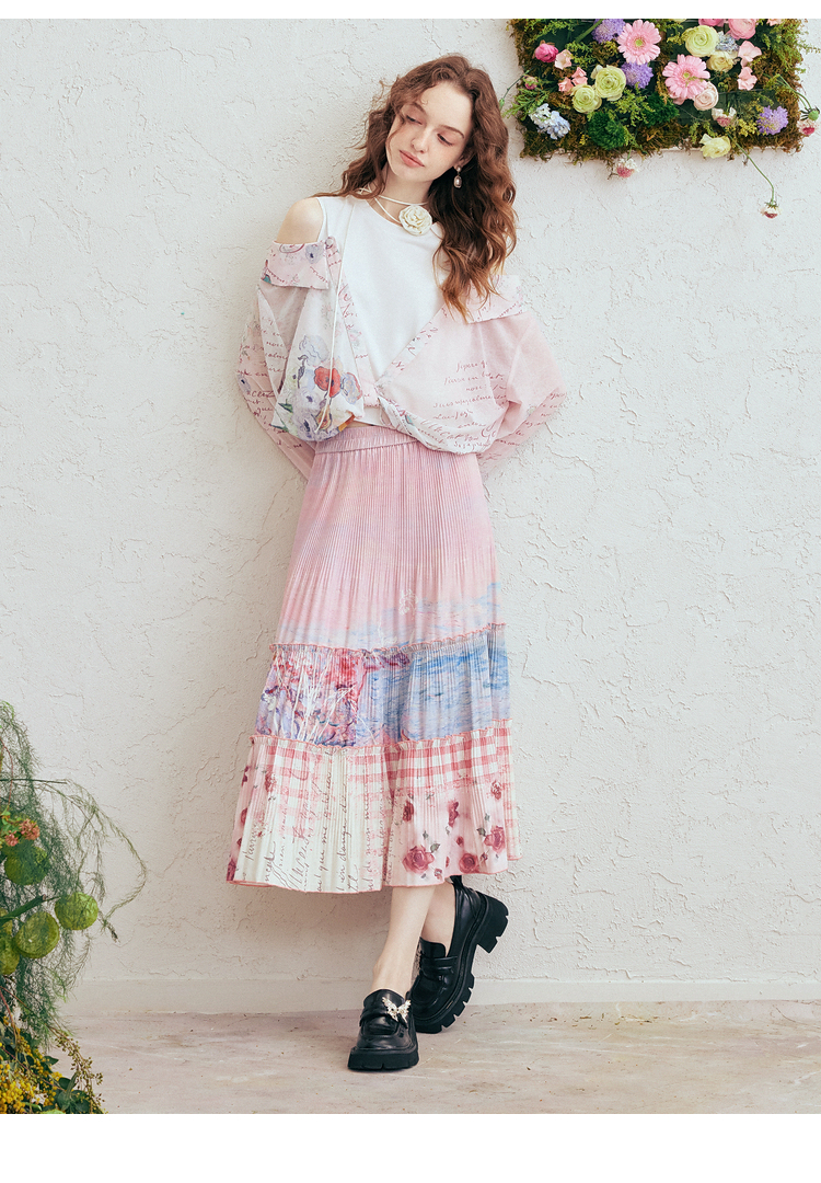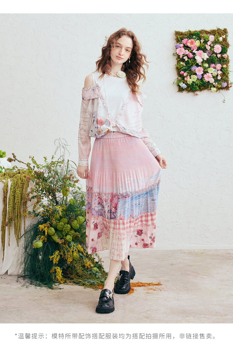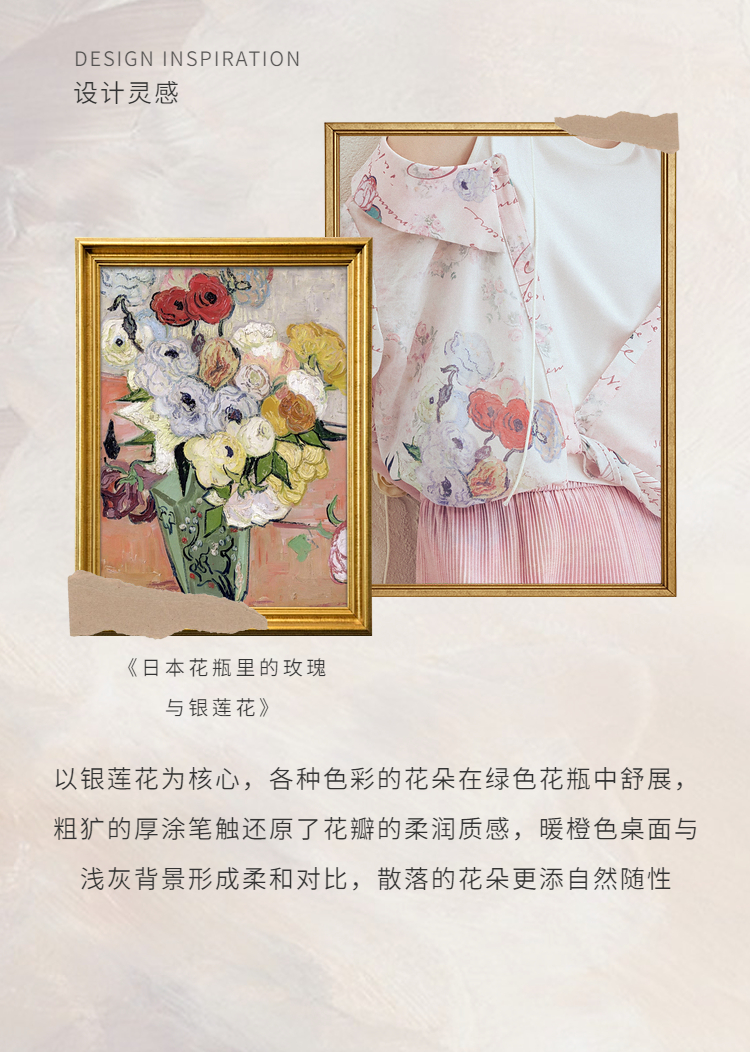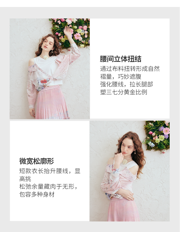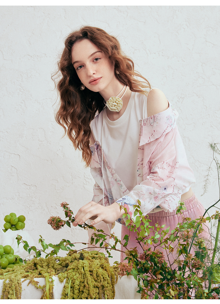 两三事梵高文艺玫瑰引力2026春新款甜美印花拼接露肩假两件衬衫女