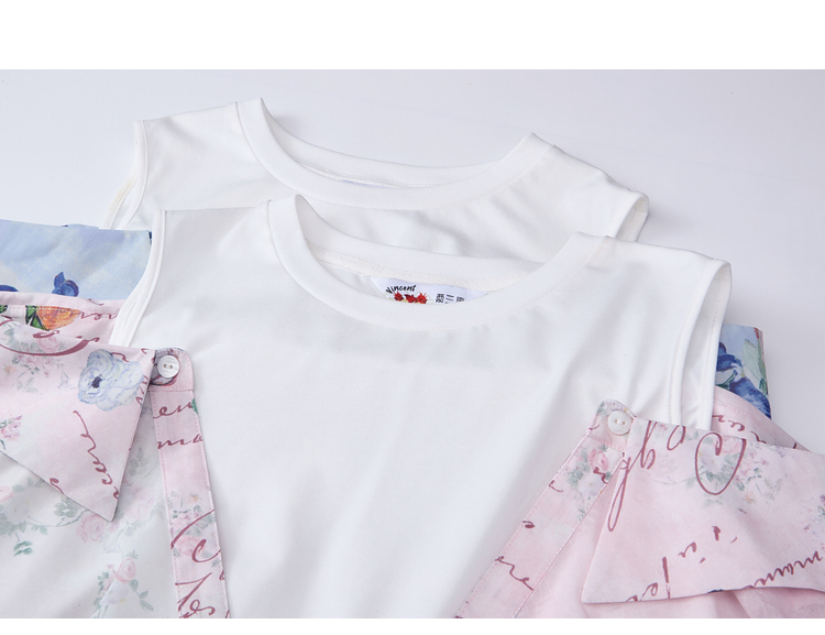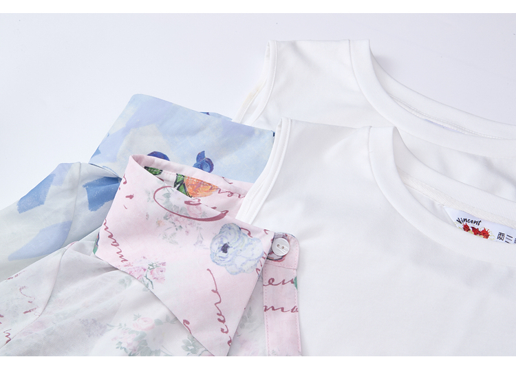 两三事2024夏季新款甜美蕾丝印花拼接假两件t恤女宽松