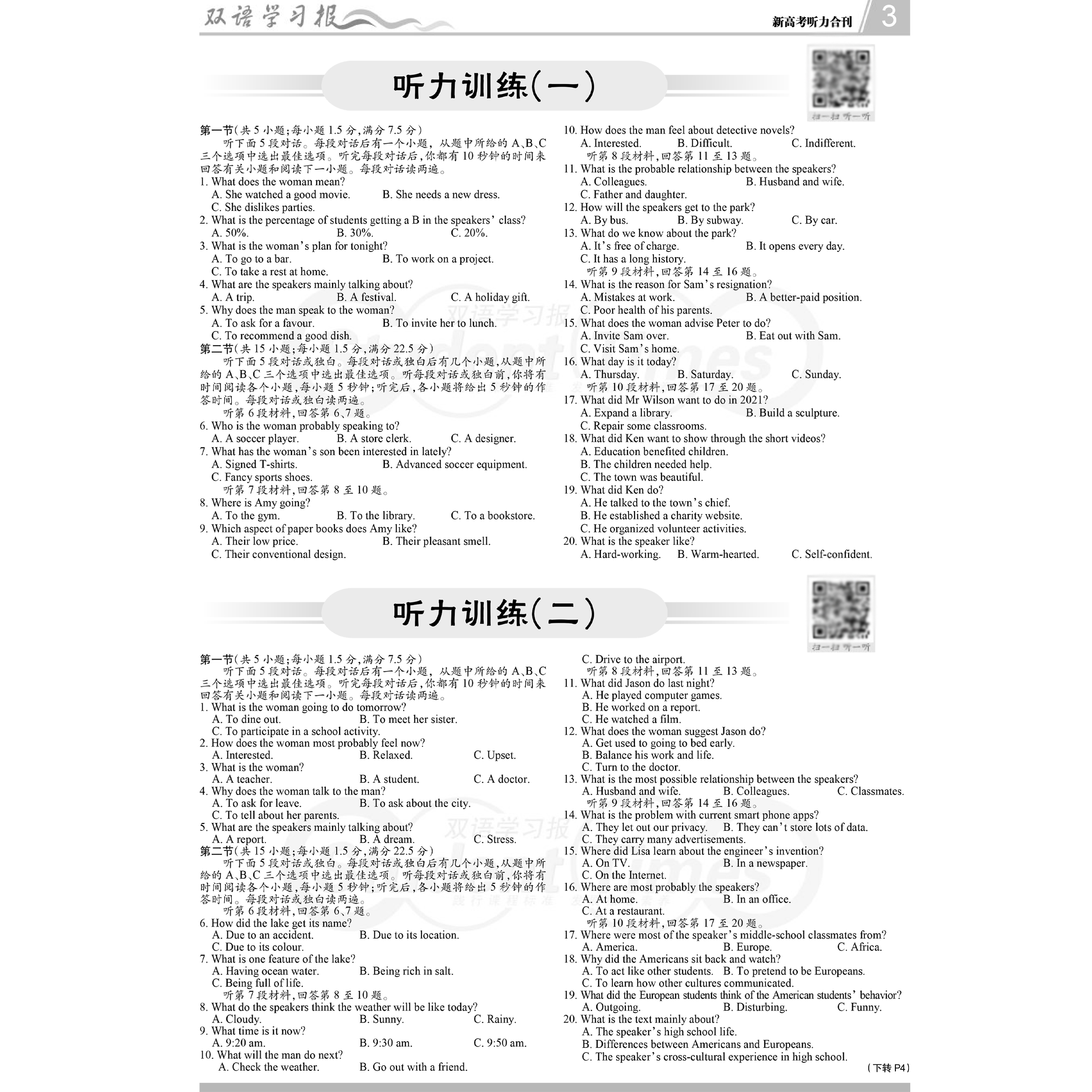 双语学习报高中合刊新高考听力合刊新版听力提升扫码听音实战演练