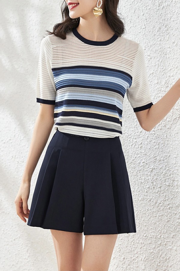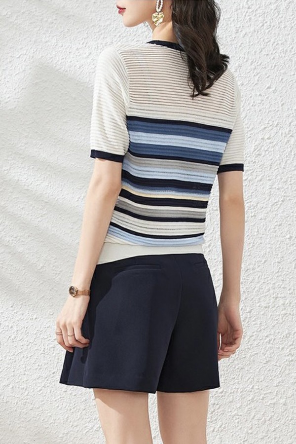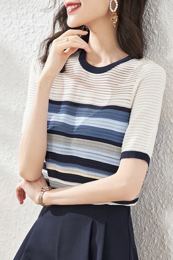 OSA欧莎 圆领清爽条纹针织上衣 12668
