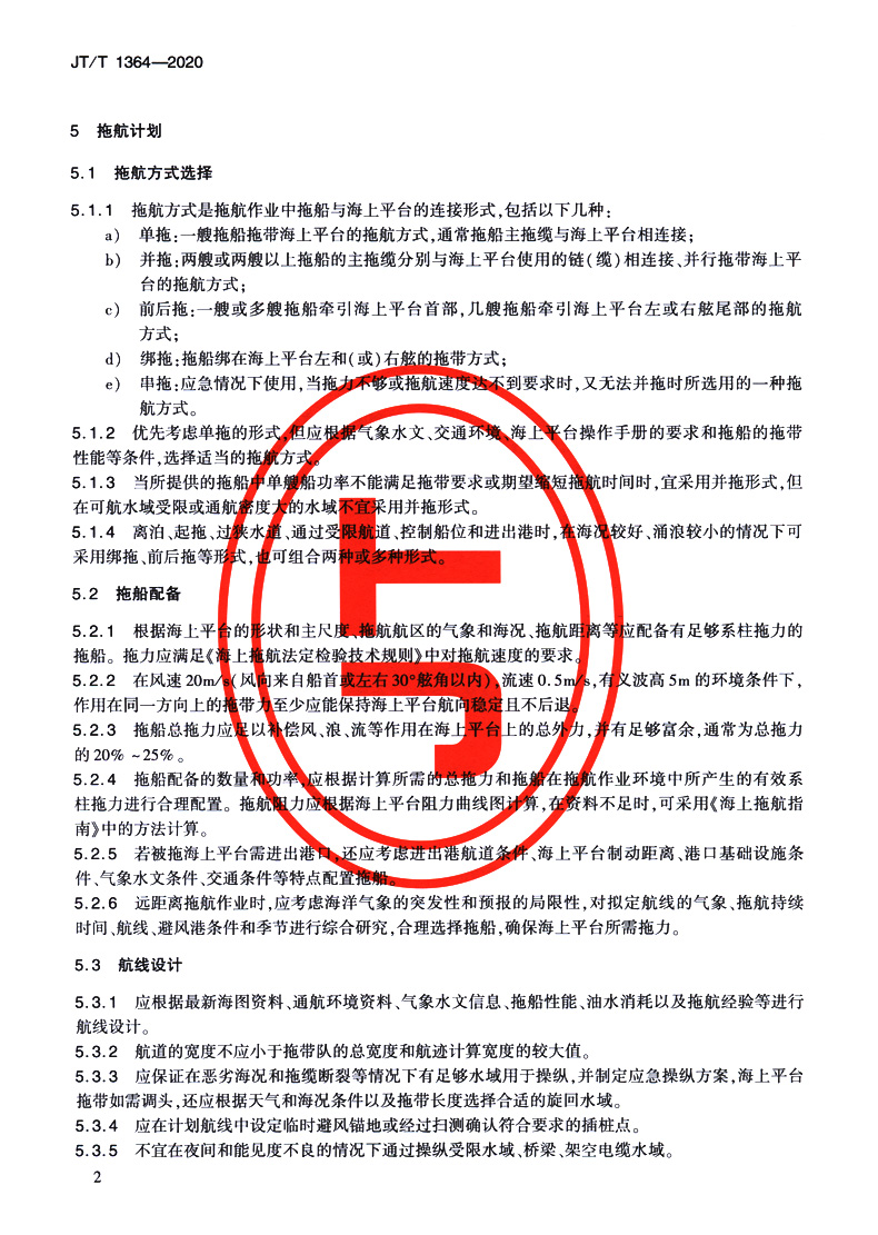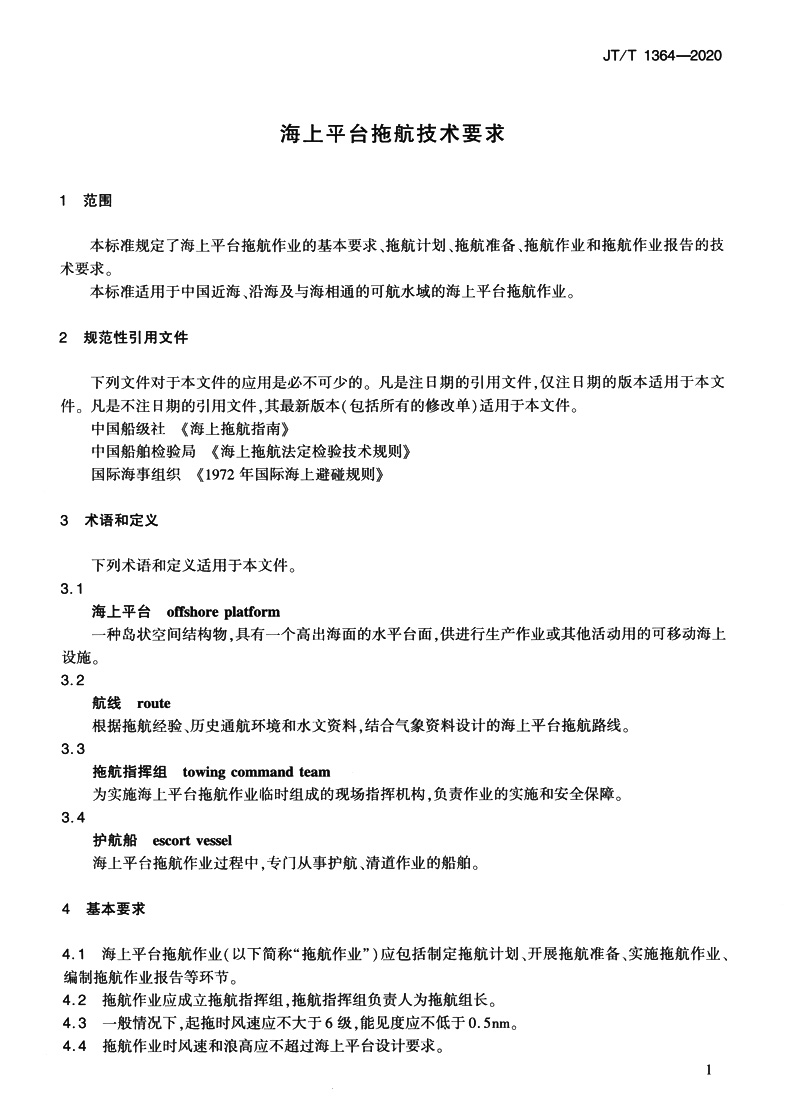 | 海上平台拖航技术要求(JT/T 1364—2020) | ||