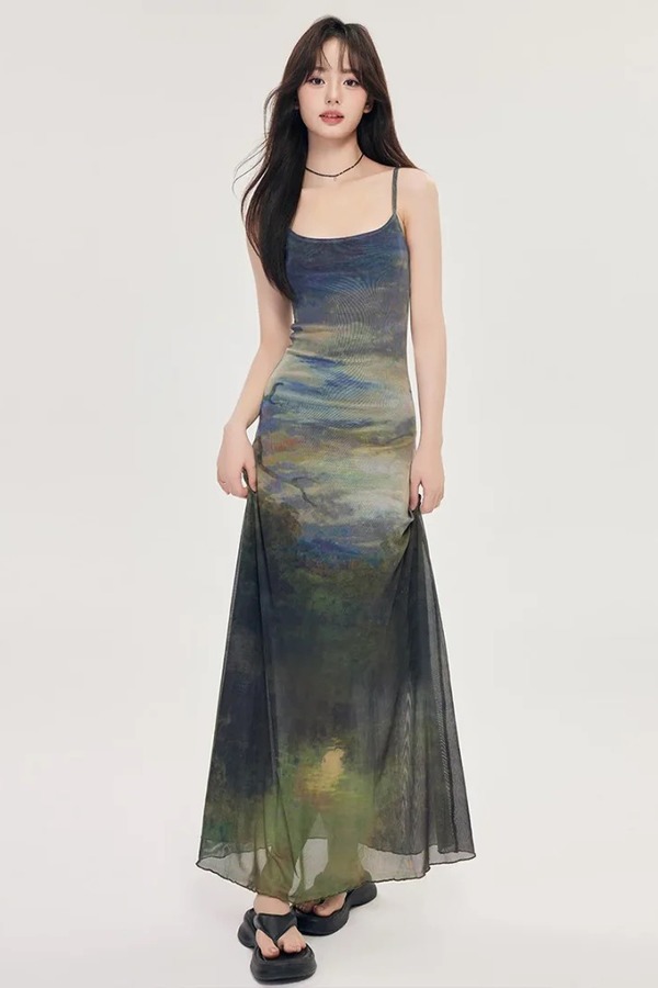 ergei/尔给 度假风情抽象水墨画收腰吊带连衣裙 21670