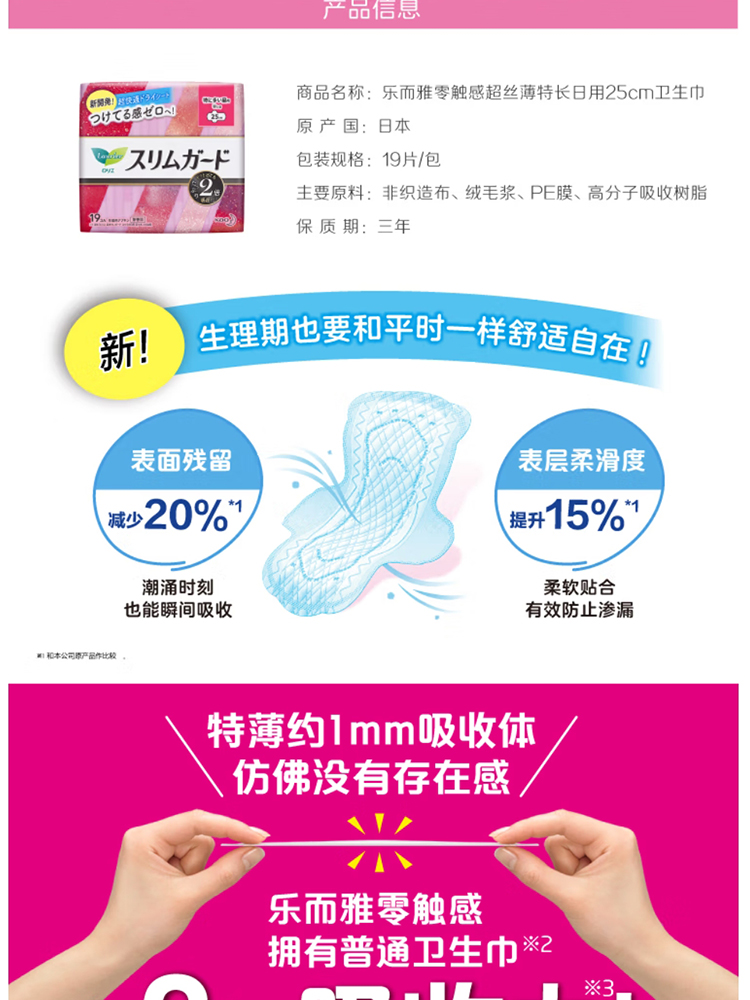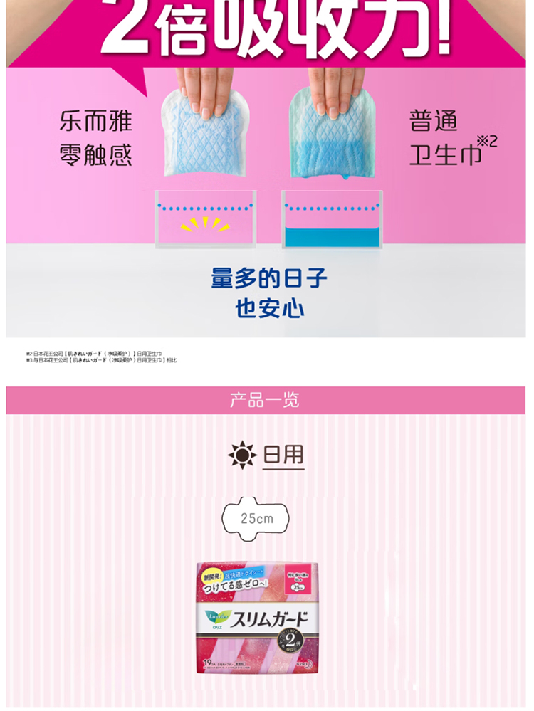 花王乐而雅(laurier)进口零触感特薄超长量特多日用卫生巾25cm 19片(日本原装进口)*2