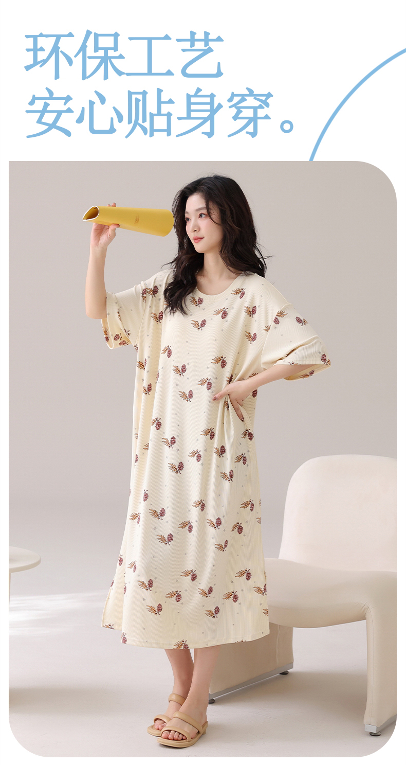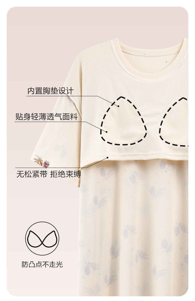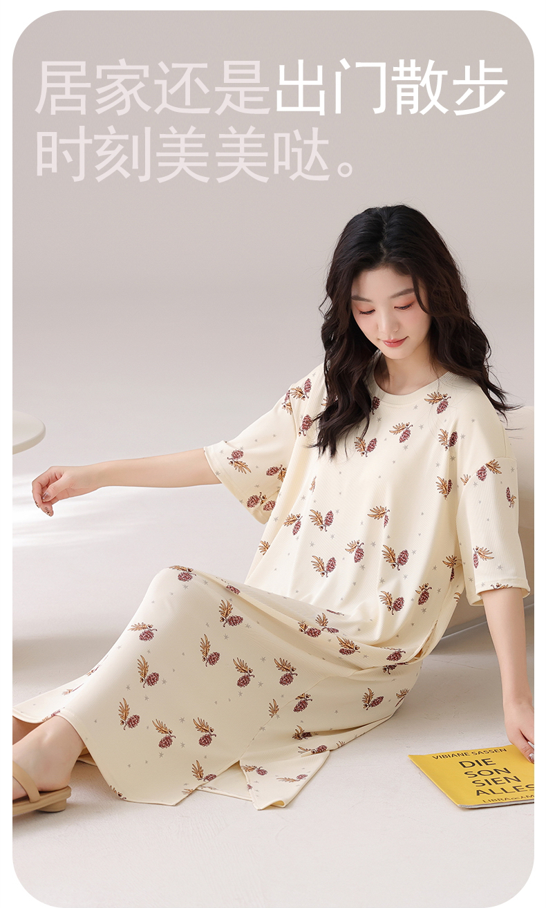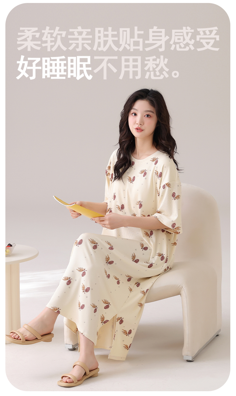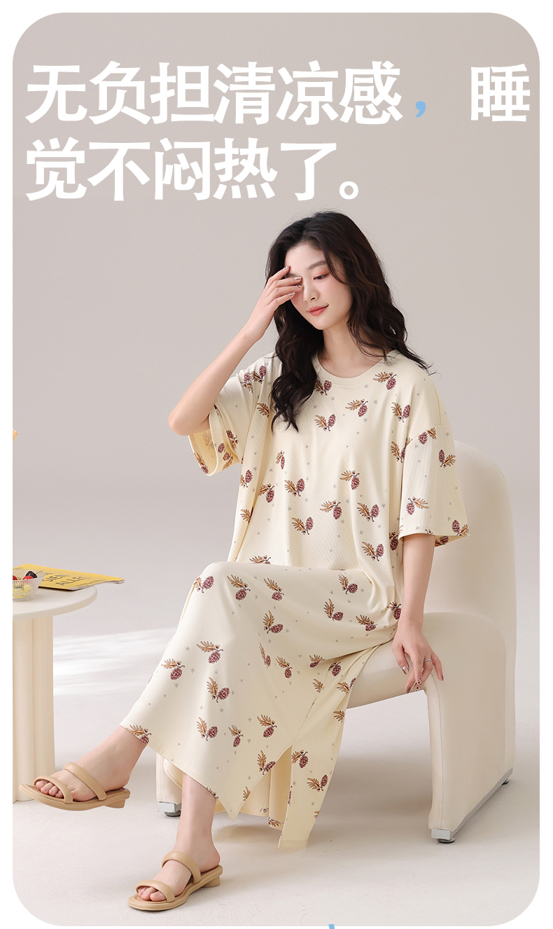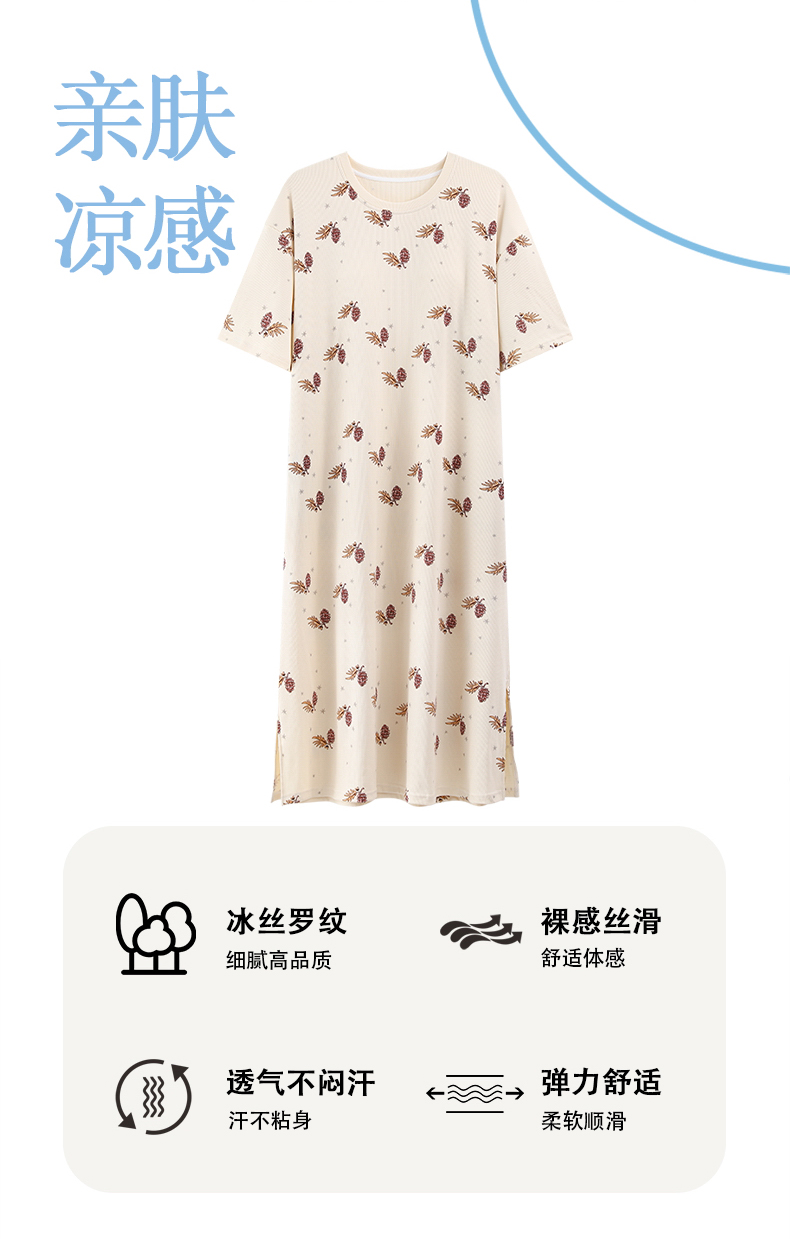 自然醒月半夏季(带胸垫)韩版中长款冰丝睡裙女款短袖连衣裙家居服可外穿QH
