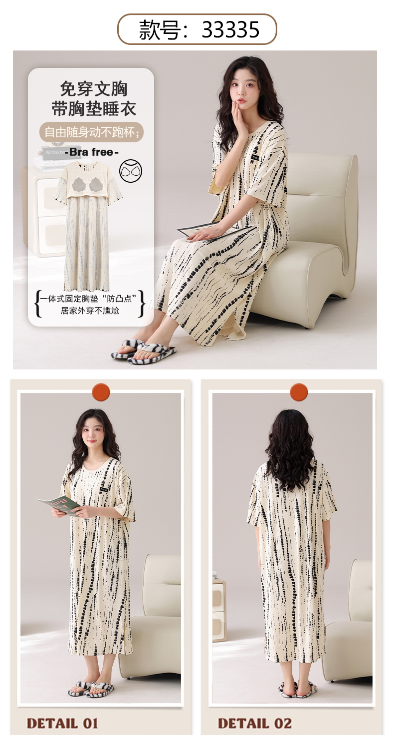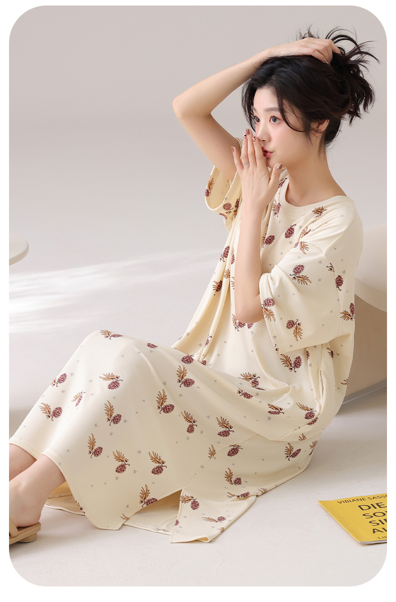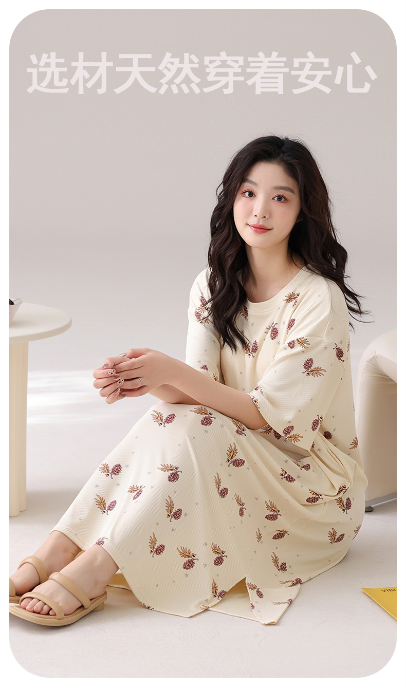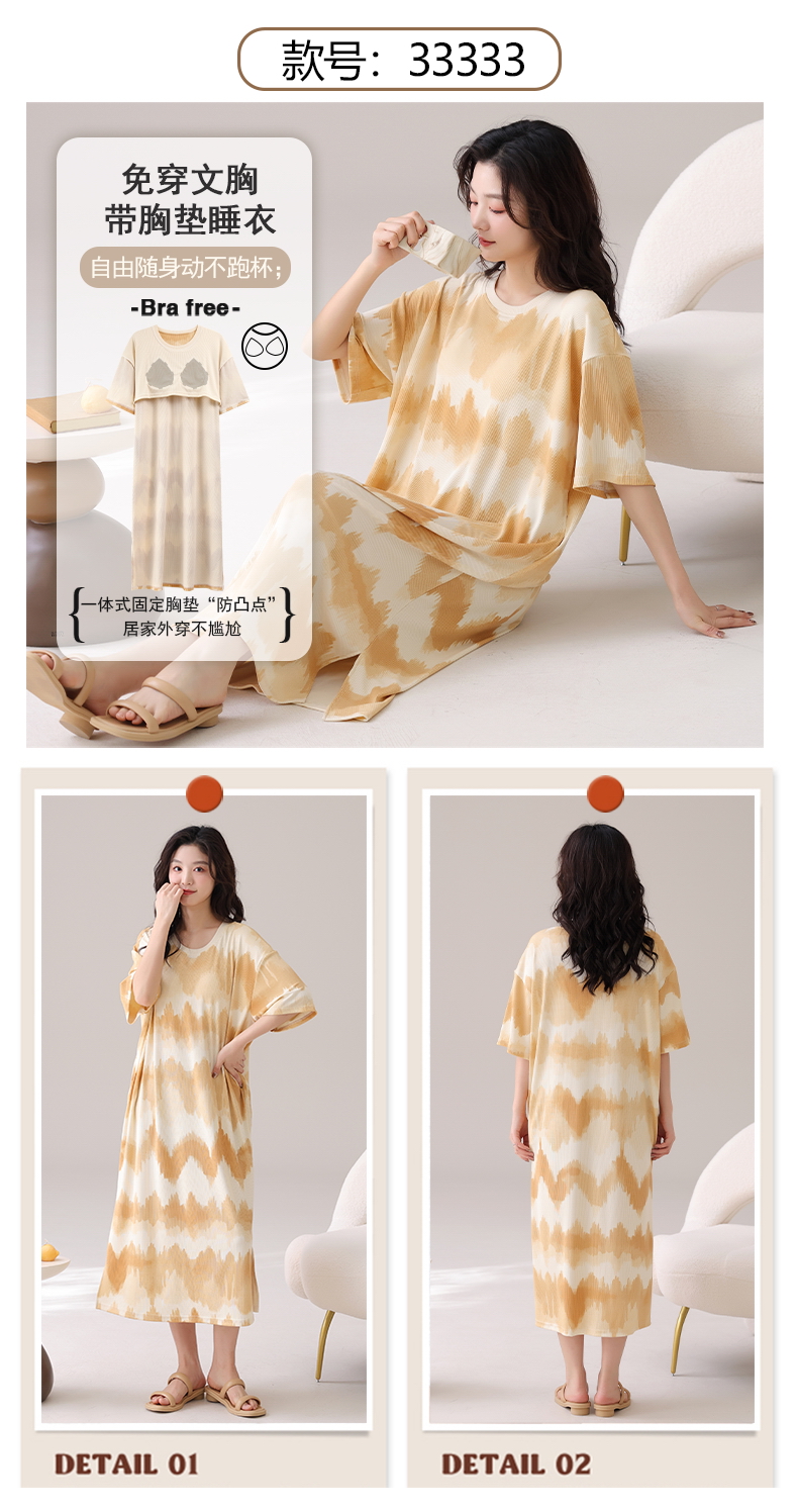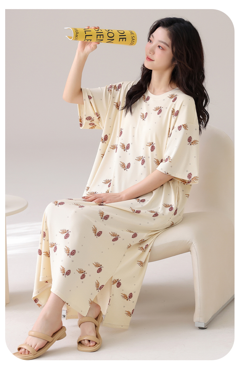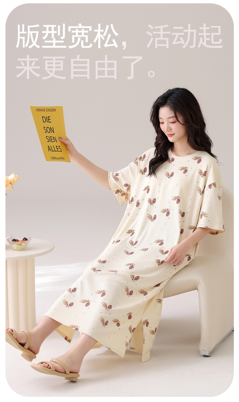 自然醒月半夏季(带胸垫)韩版中长款冰丝睡裙女款短袖连衣裙家居服可外穿QH