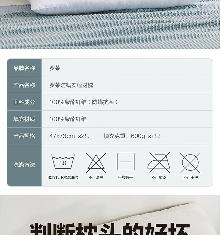 【多样屋专柜】罗莱防螨安睡对枕 颈椎枕五星酒店枕舒眠安睡柔丝枕头47*73cm