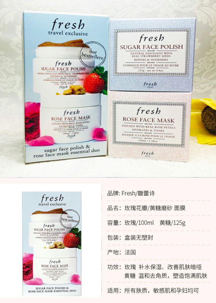 法国 FRESH馥蕾诗 黄糖磨砂去角质面膜125g+玫瑰润泽面膜100ml套装