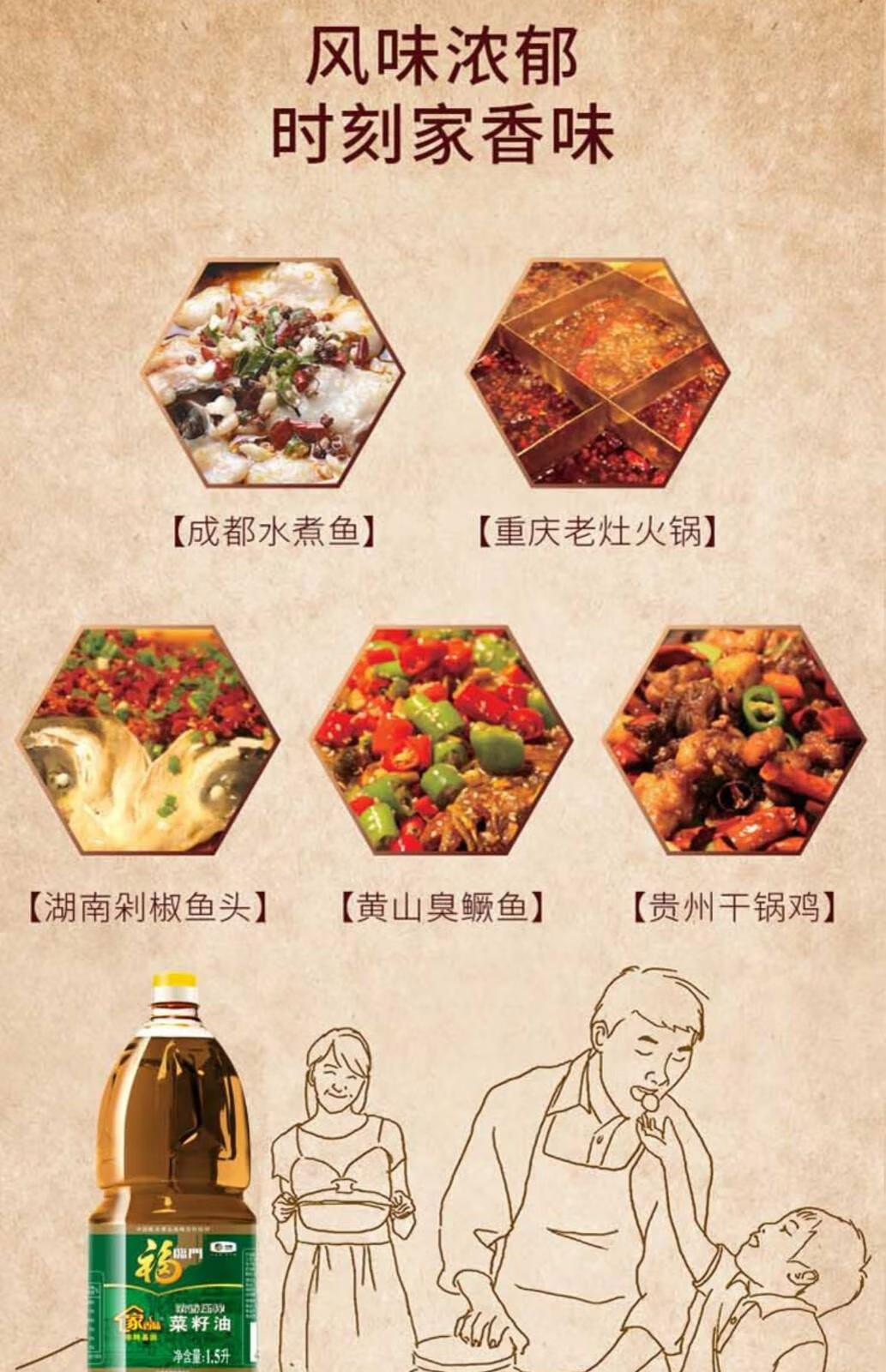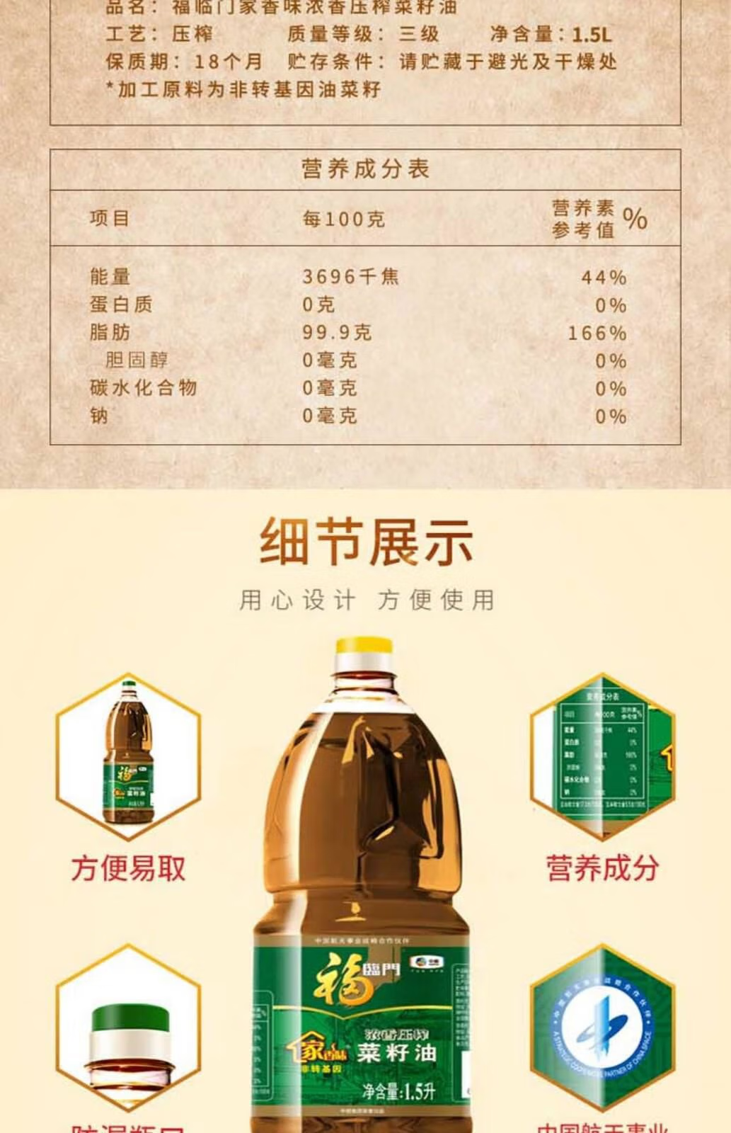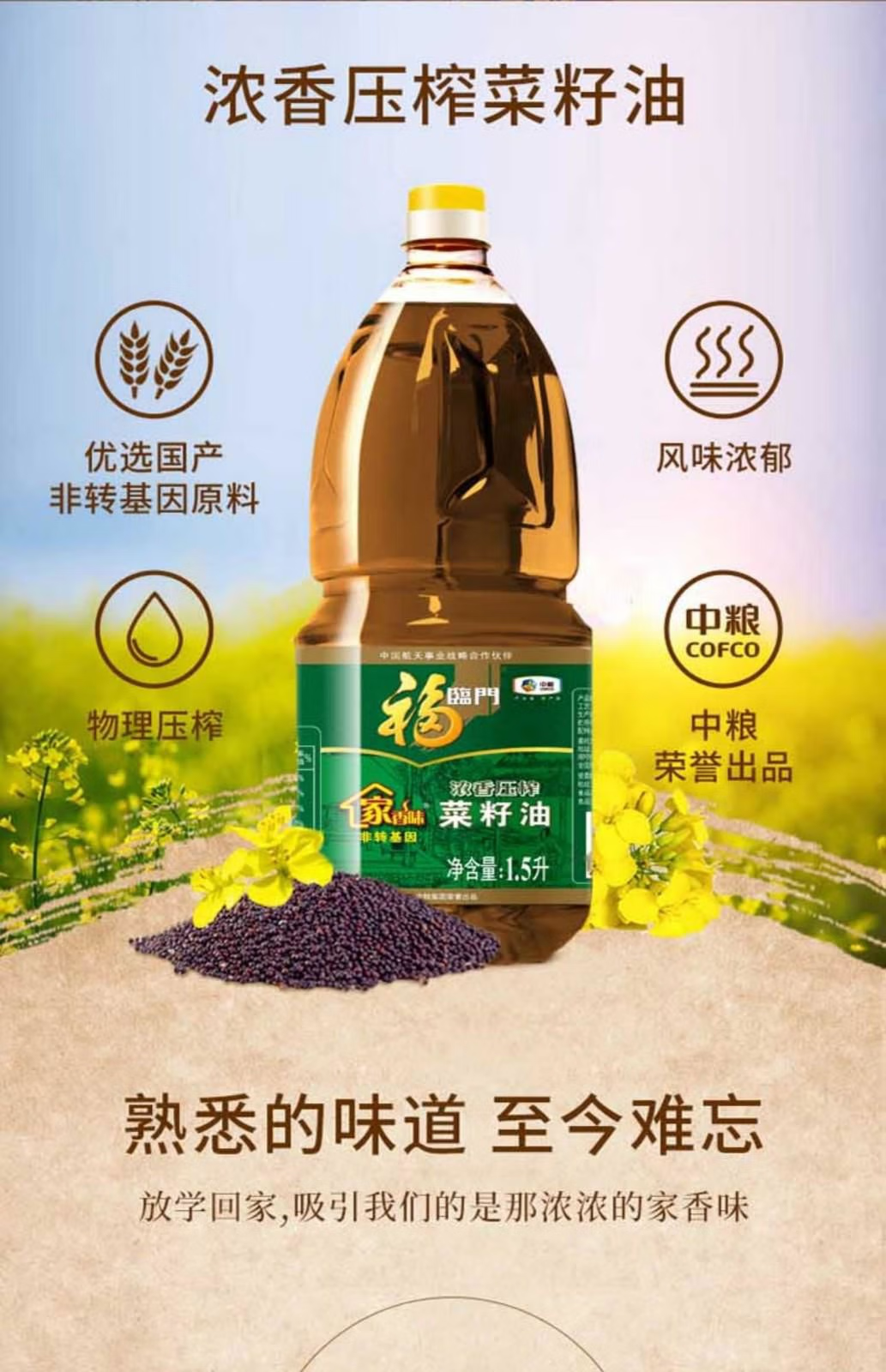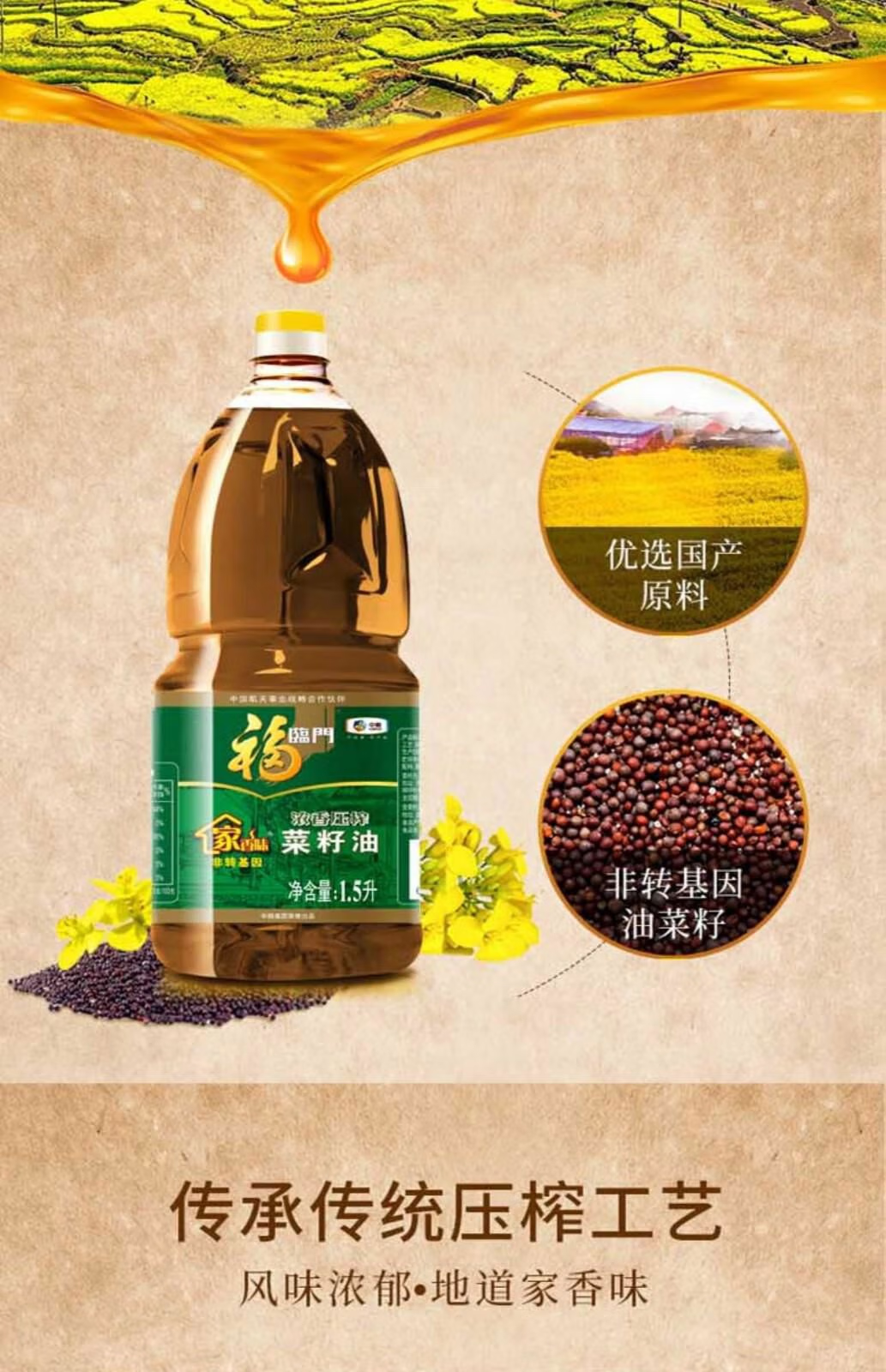 福临门家香味低芥酸浓香压榨菜籽油1.5L