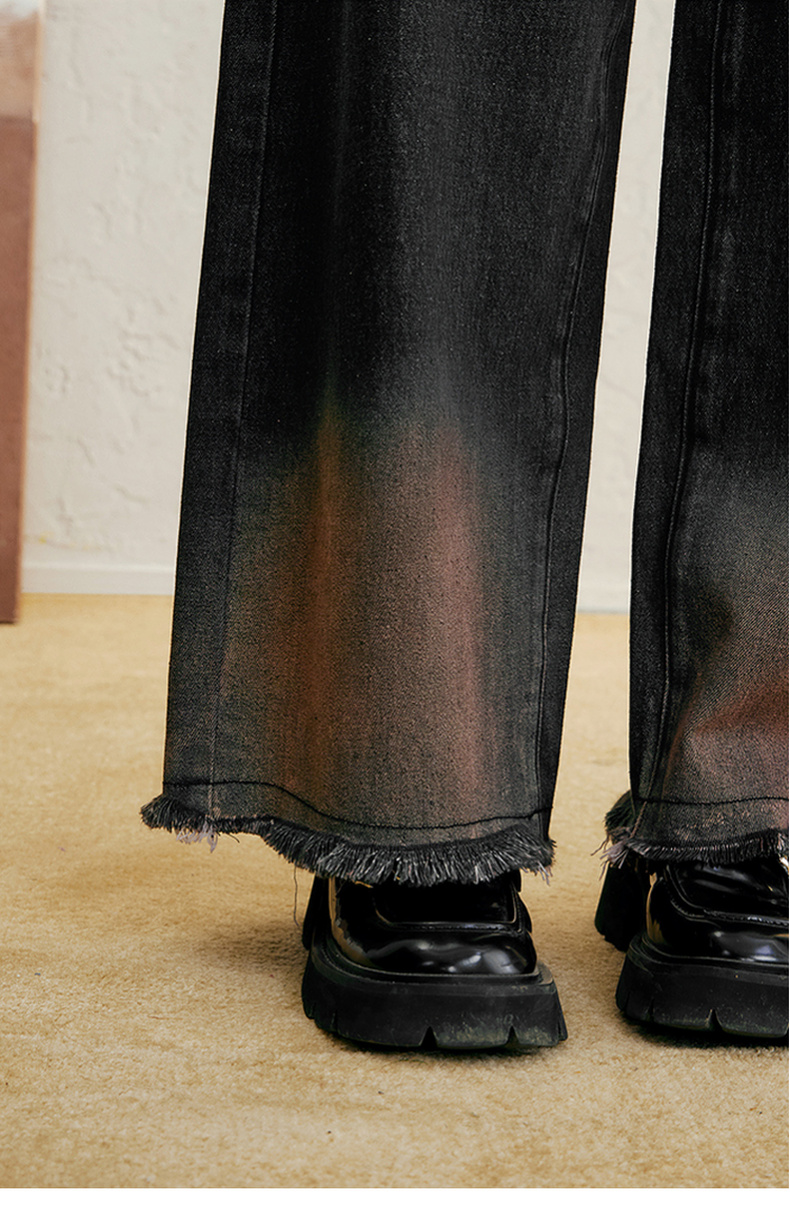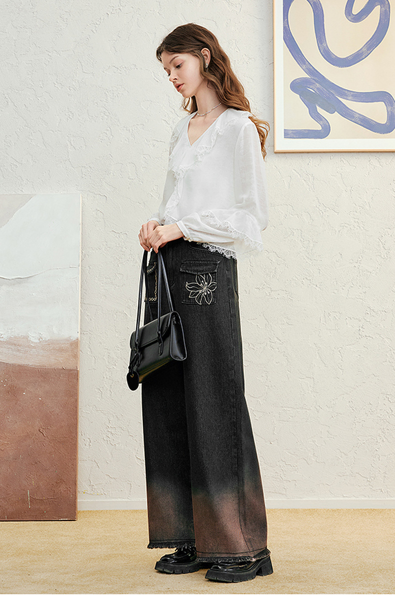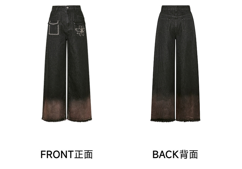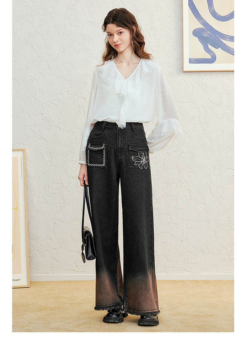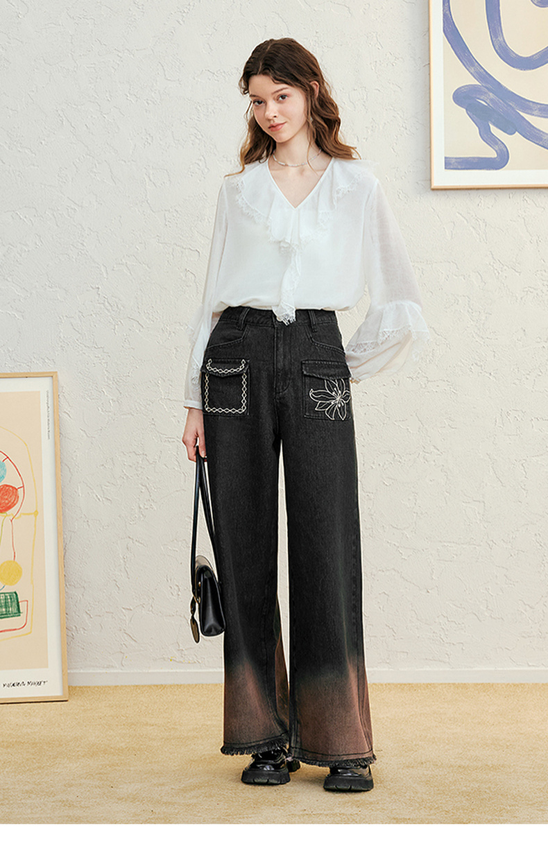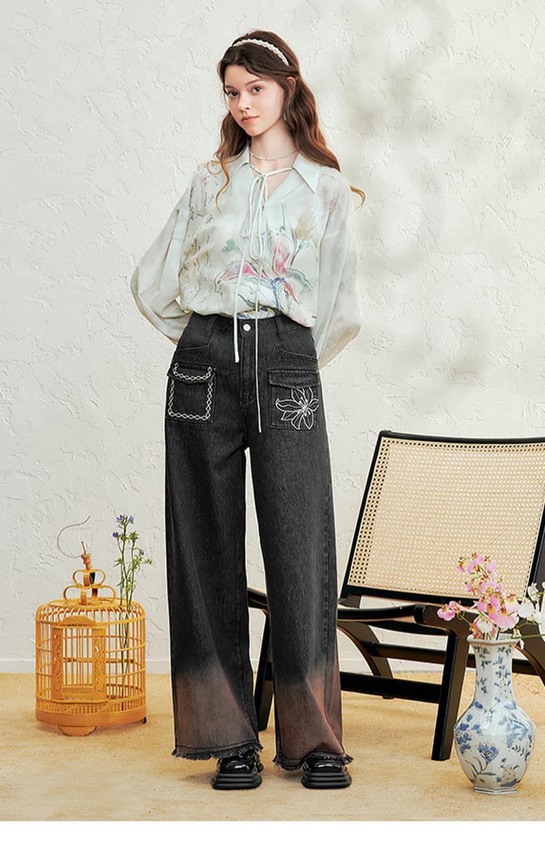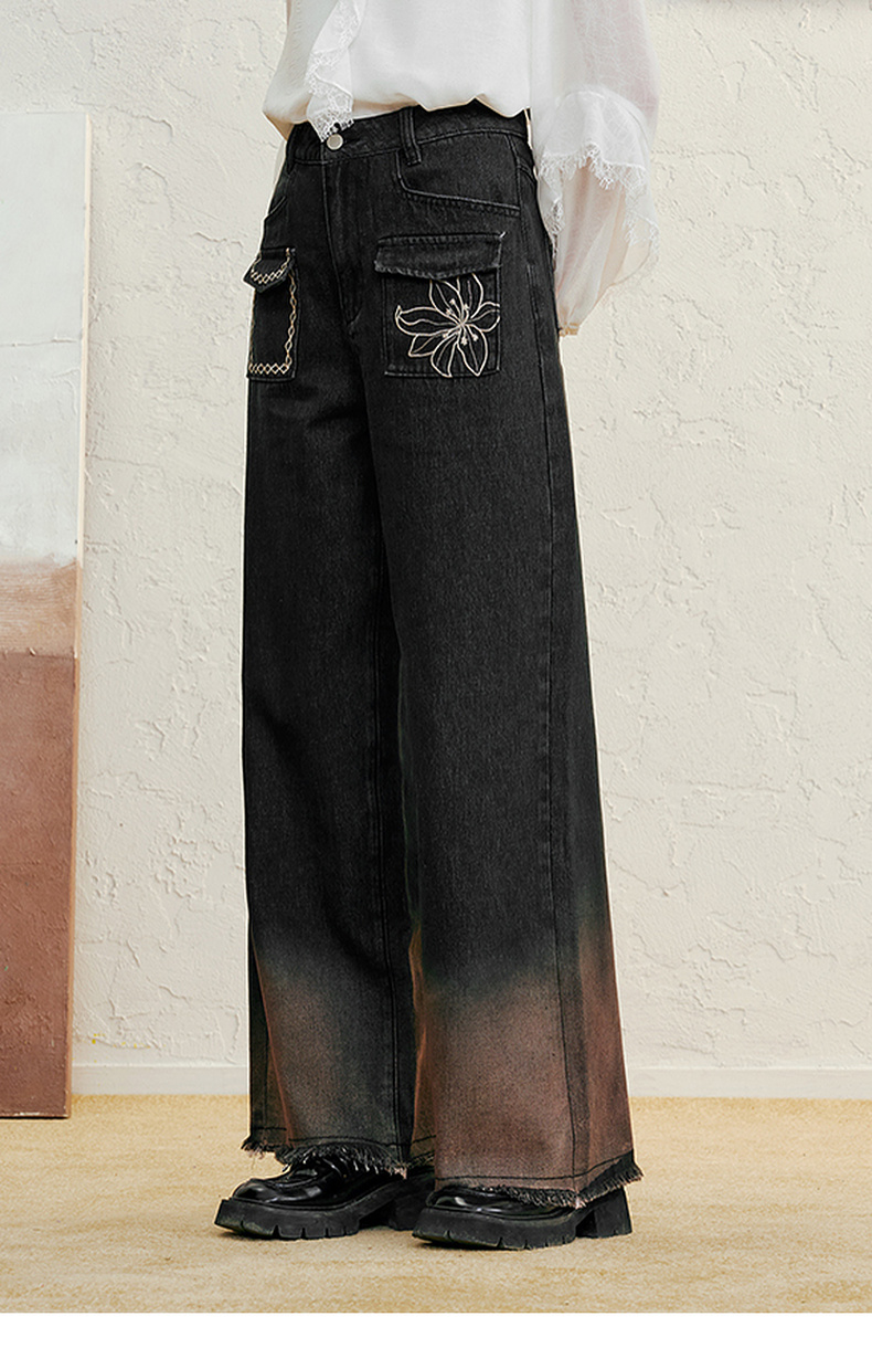 两三事愈花古道2025春季新款复古绣花渐变毛边裤脚口阔腿牛仔裤女