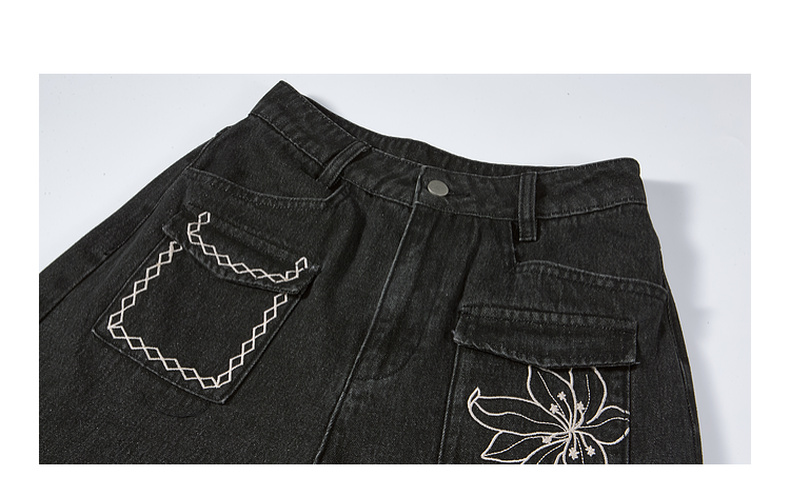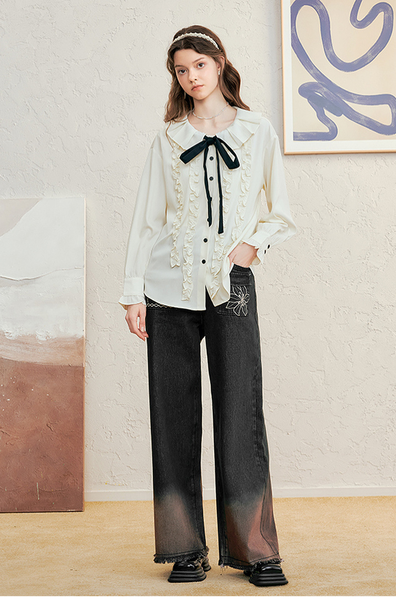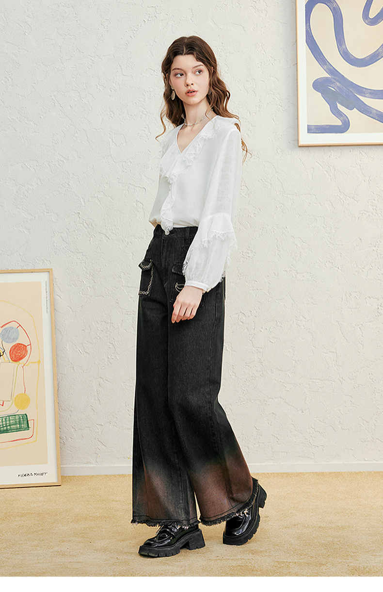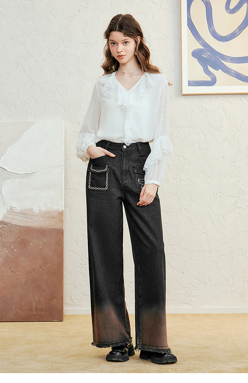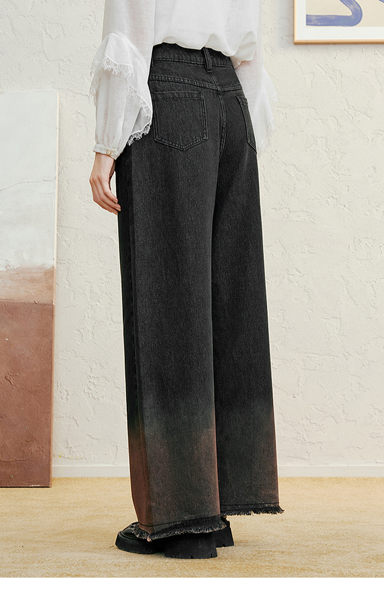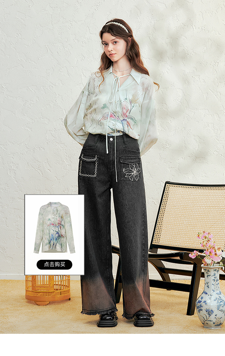 两三事愈花古道2025春季新款复古绣花渐变毛边裤脚口阔腿牛仔裤女