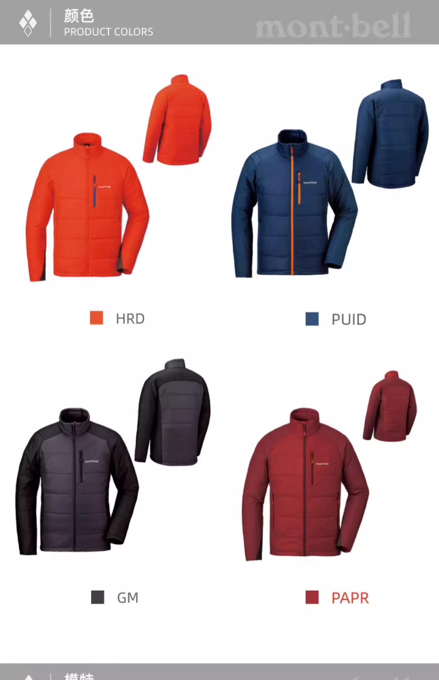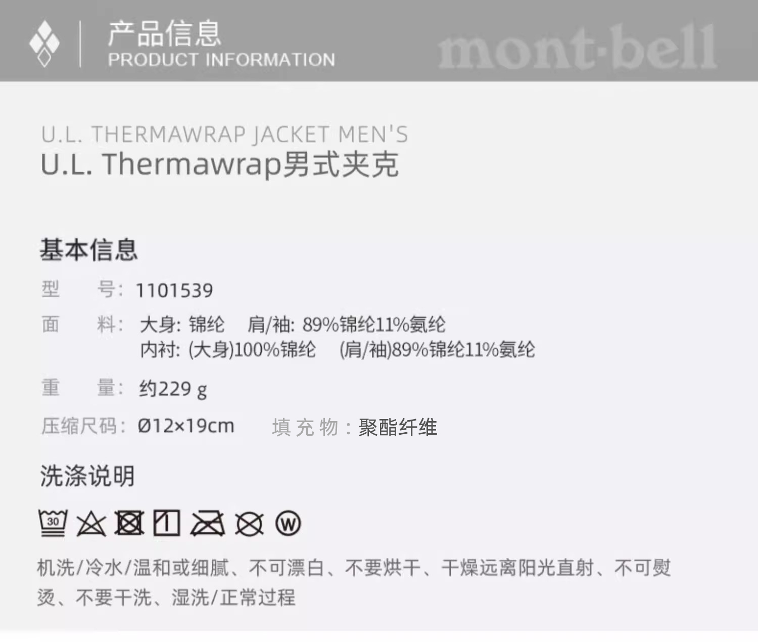 MONTBELL户外秋冬男轻量立领U.L棉服保暖时尚外套内胆1101539