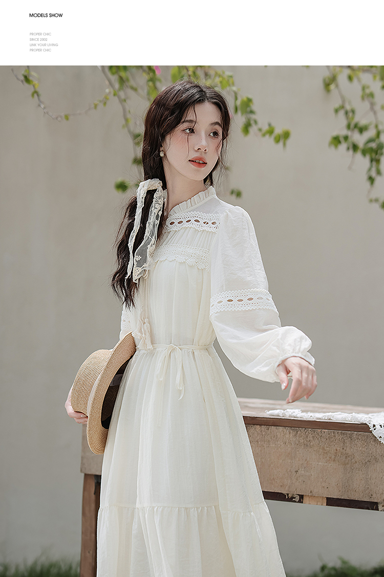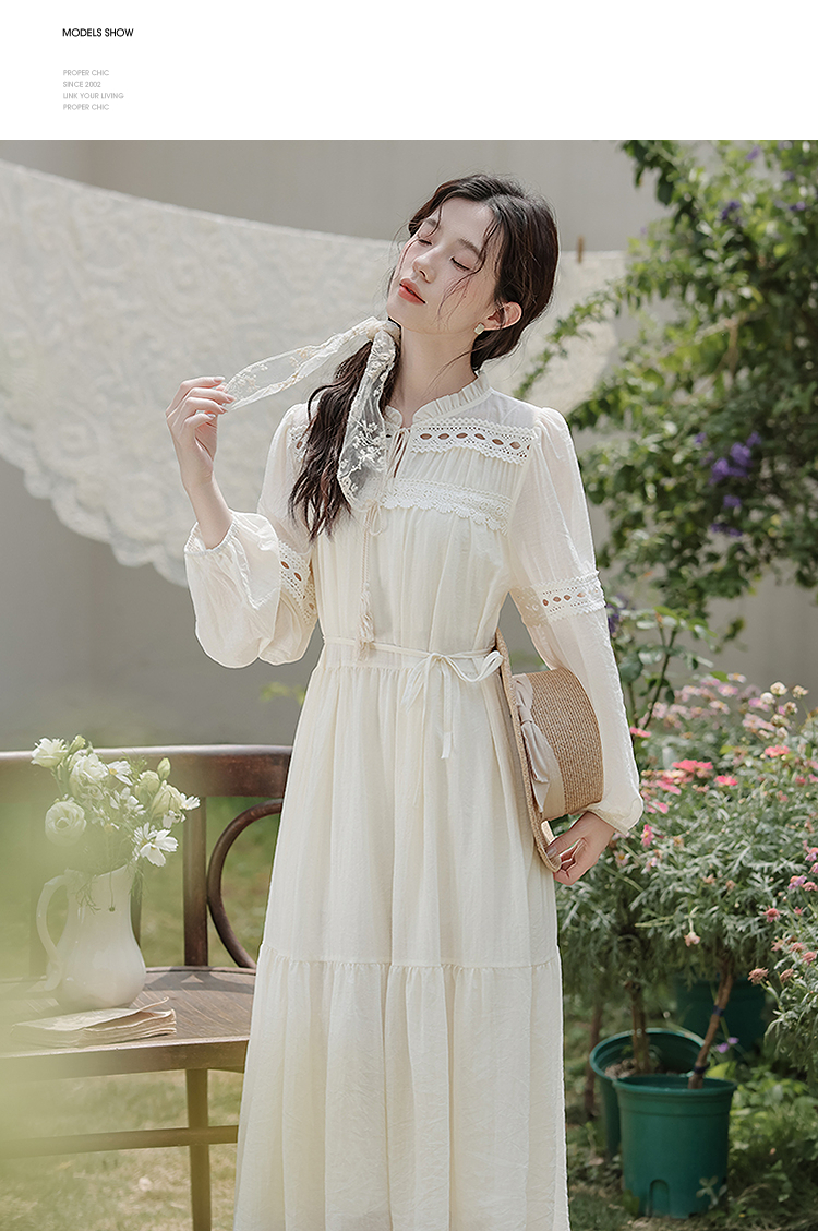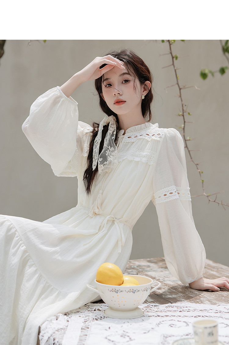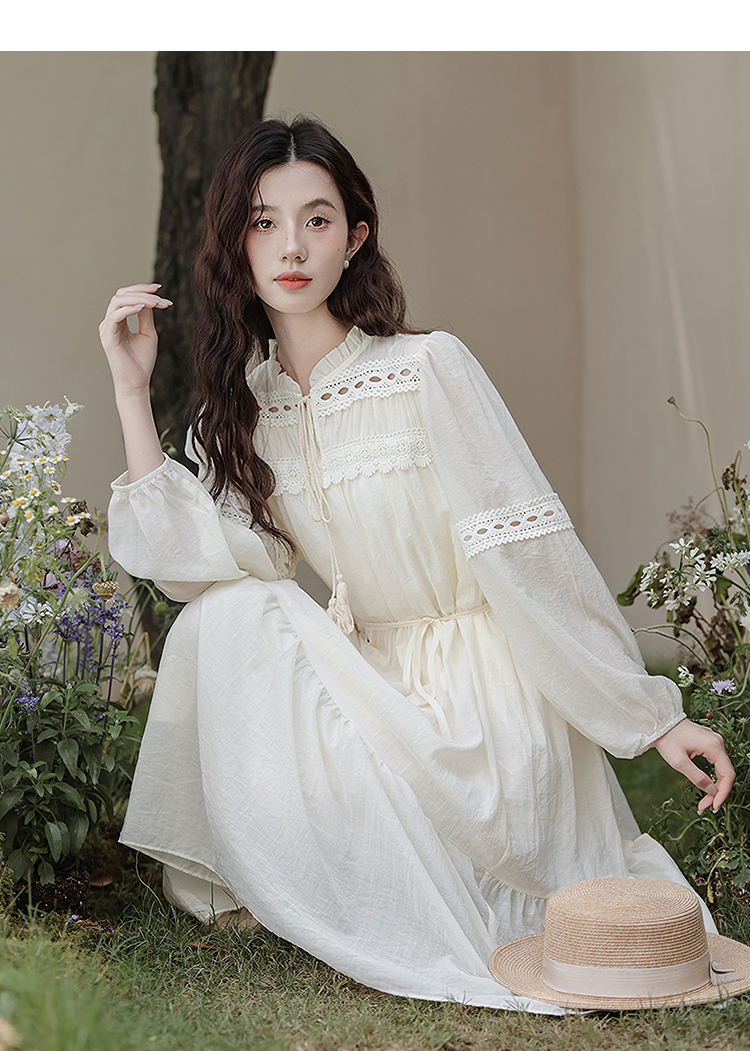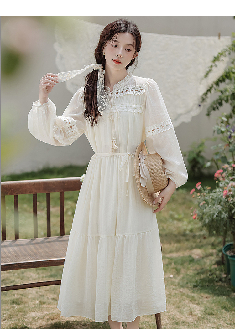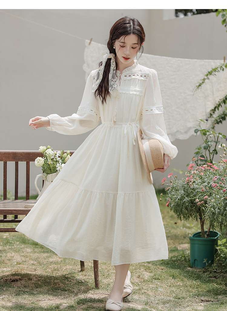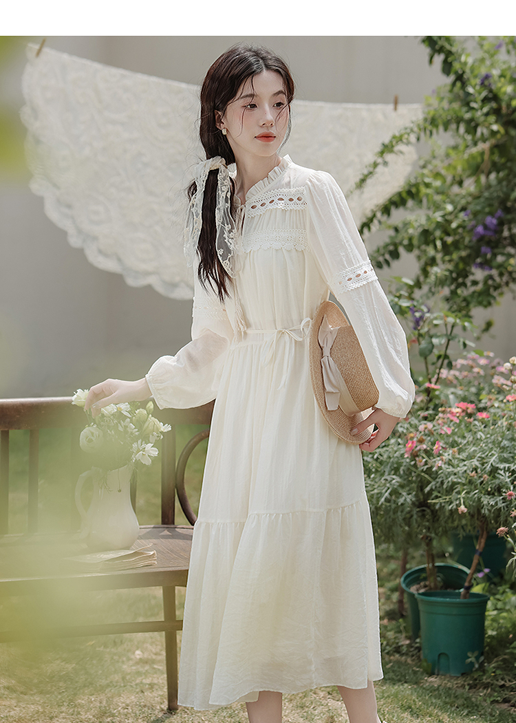 西遇民族风白色长袖连衣裙女2026年春季新款收腰波西米亚大摆长裙SS060231