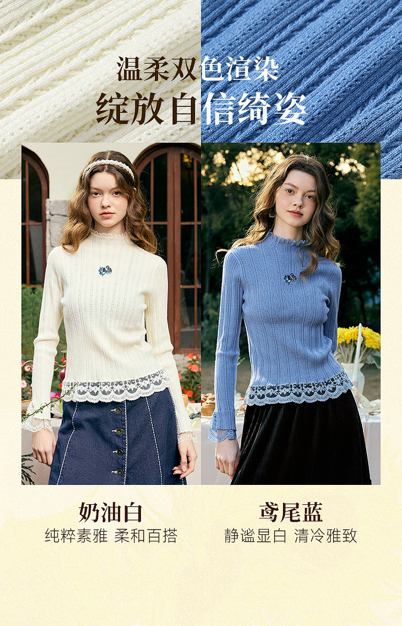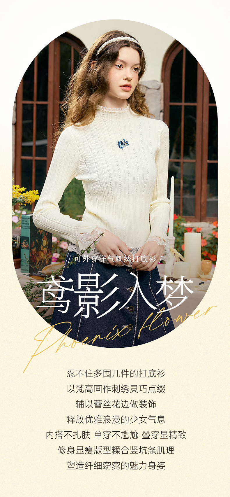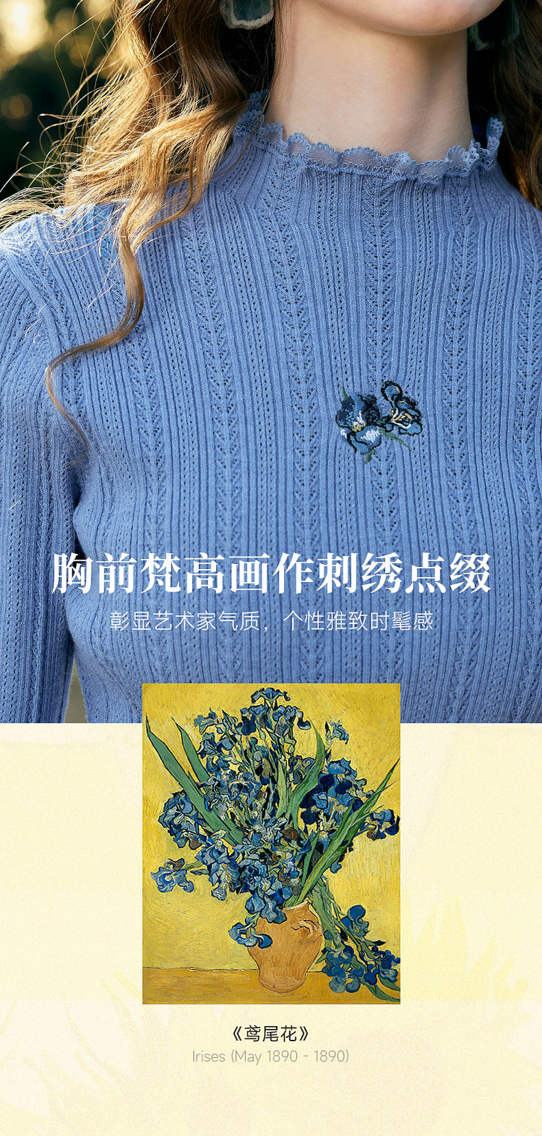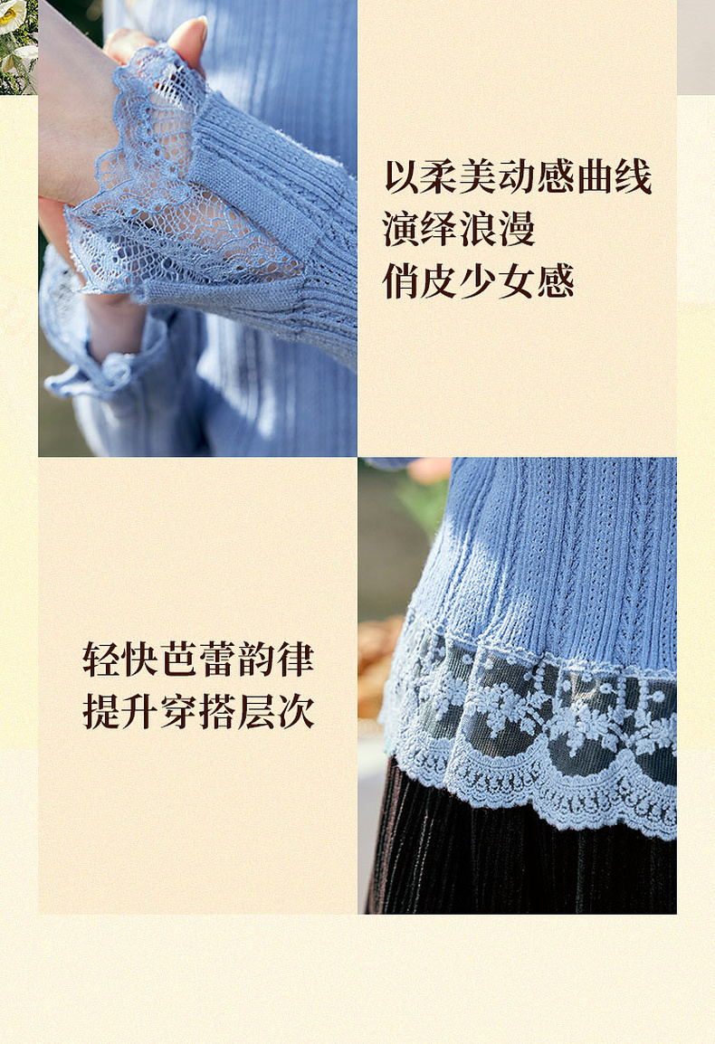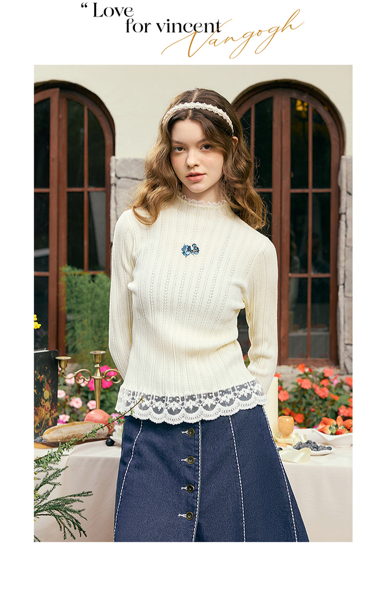 两三事梵高文艺鸢影入梦2025春季新款绣花蕾丝拼接打底衫女针织衫