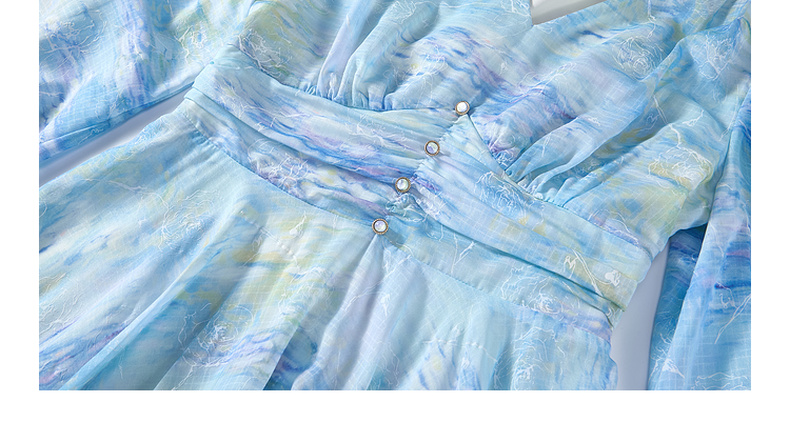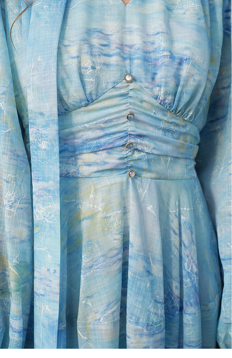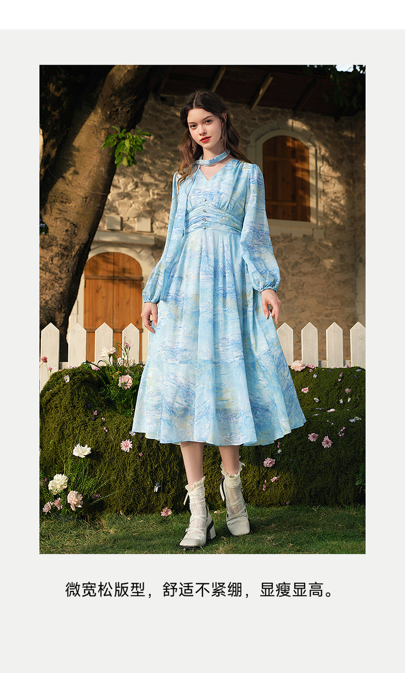两三事 仙韵花海 2025春季新款优雅印花v领绑带a字连衣裙气质长裙