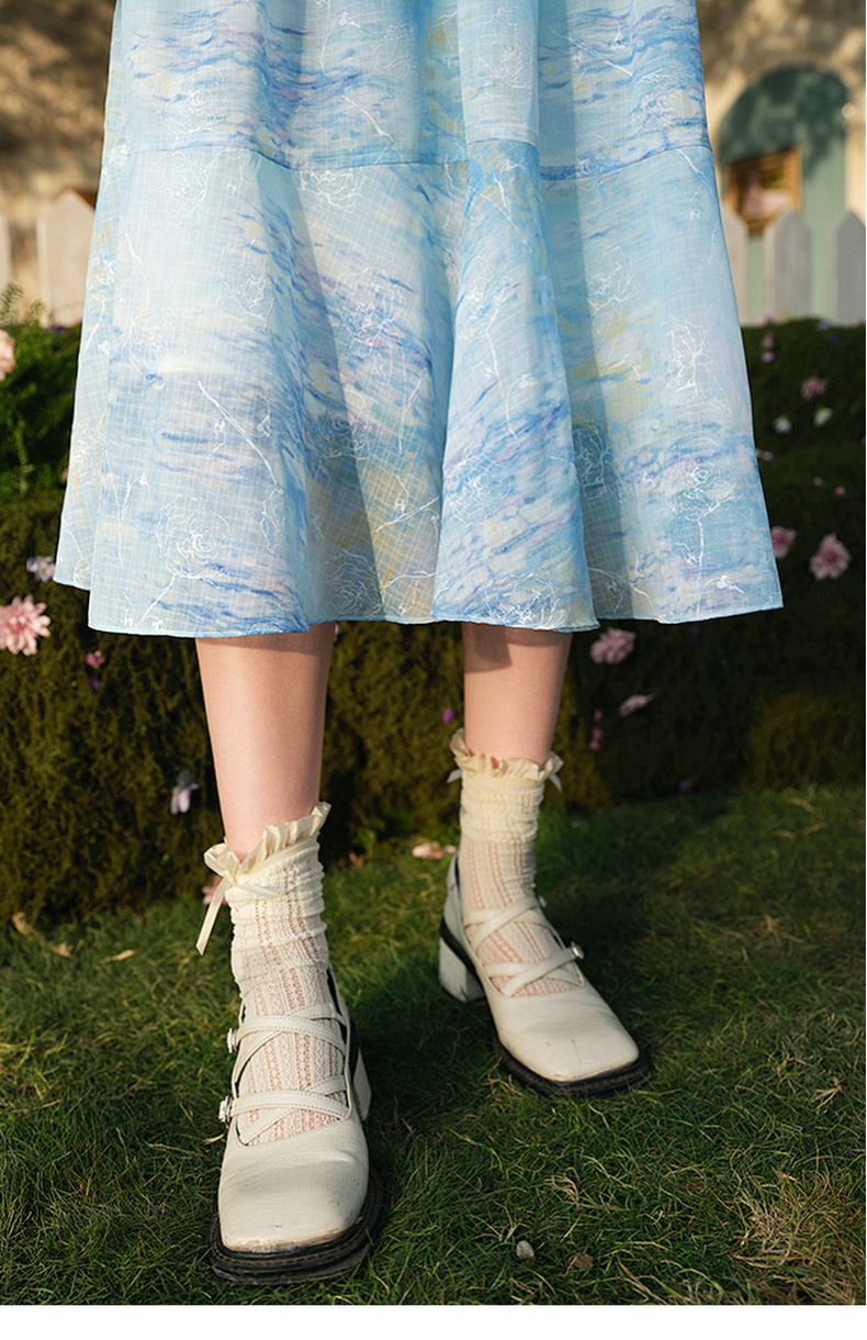 两三事梵高文艺 花屿捕梦 2025夏季新款拼布印花荷叶边吊带连衣裙