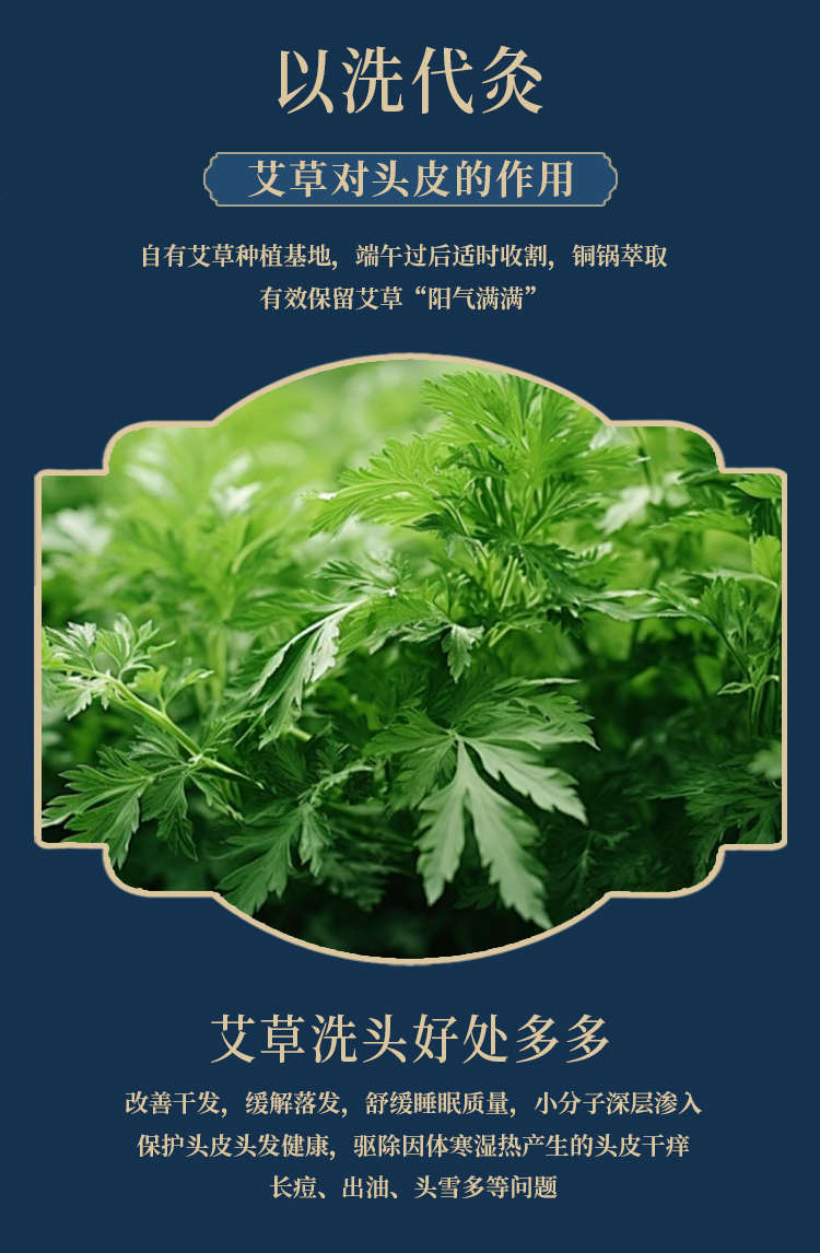 特点:无硅油、无香精、纯氨基酸起泡、无科技狠货。60%中药基底,加艾草纯露做水向,没有放一滴净水,都是用艾草纯露替代,满满的诚意。富含艾草精油。