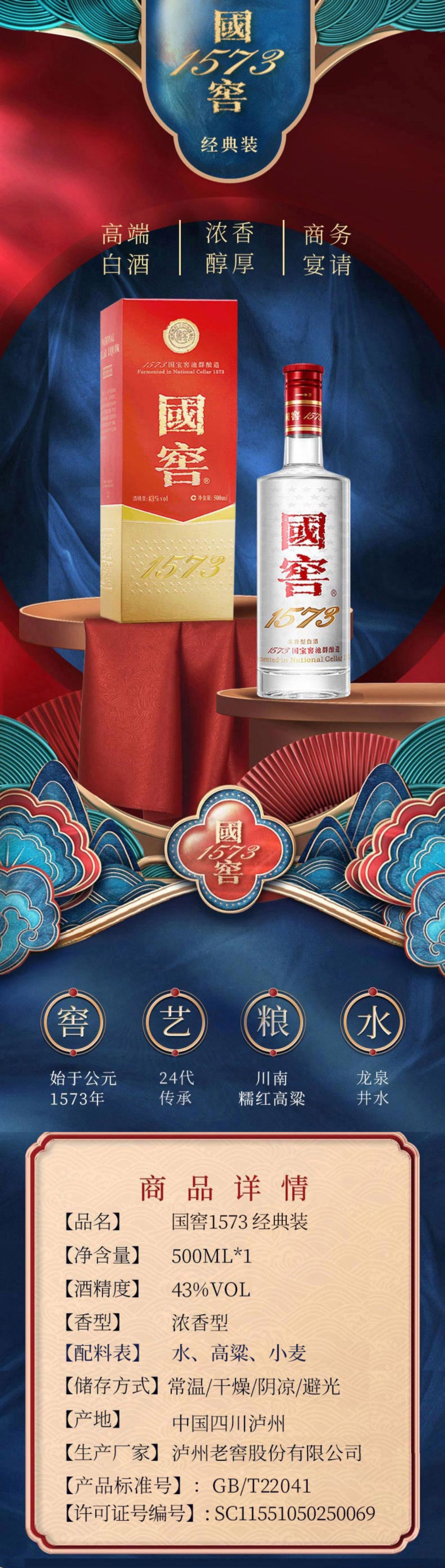【泸州老窖官方形象店】43度国窖1573经典装 500ml 浓香型白酒 泸州老窖官方形象店