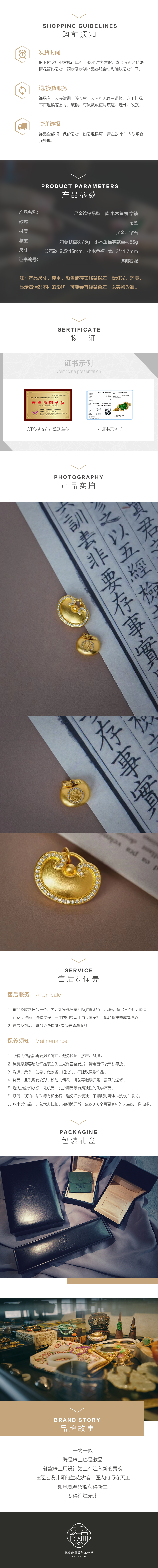 古法黄金点钻系列 二款足金镶钻吊坠 小木鱼/如意锁