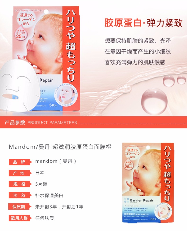 MANDOM曼丹 16版超滋润胶原蛋白面膜 5片 橙色 日本