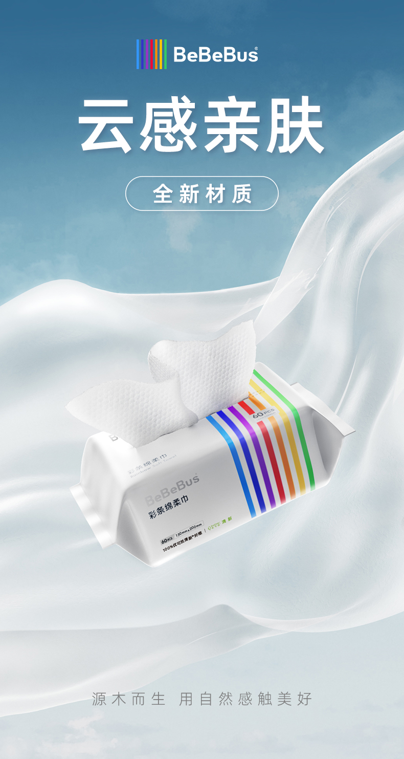 彩条绵柔巾 100%植物纤维 云柔触感 婴幼儿手口专用-60抽/包 6包起更划算