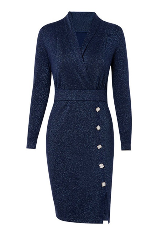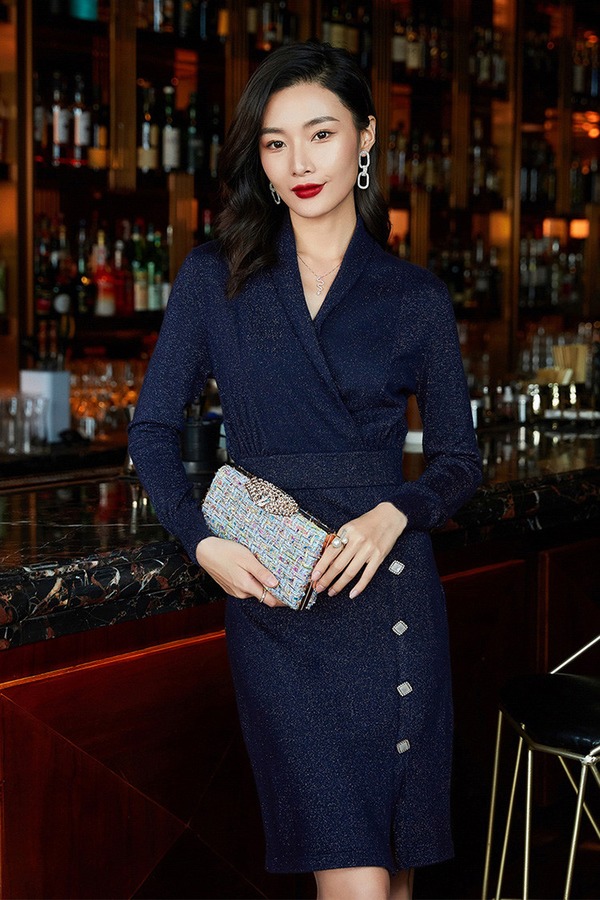 Fleur Wood V领显瘦开衩蓝色连衣裙 11668