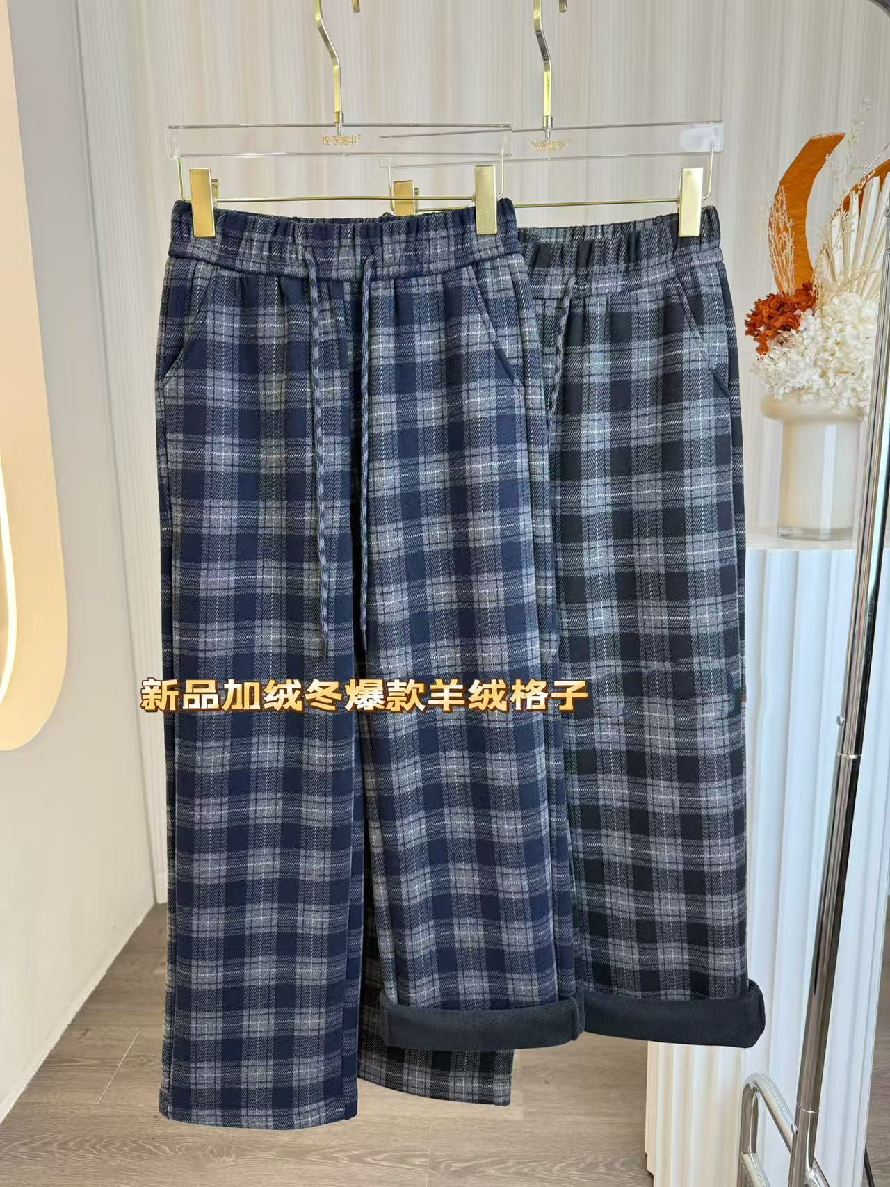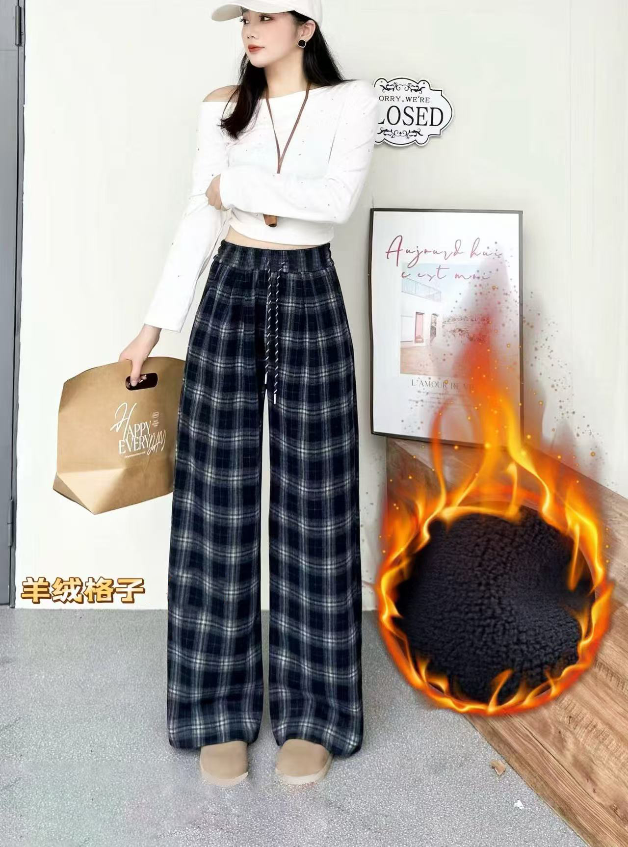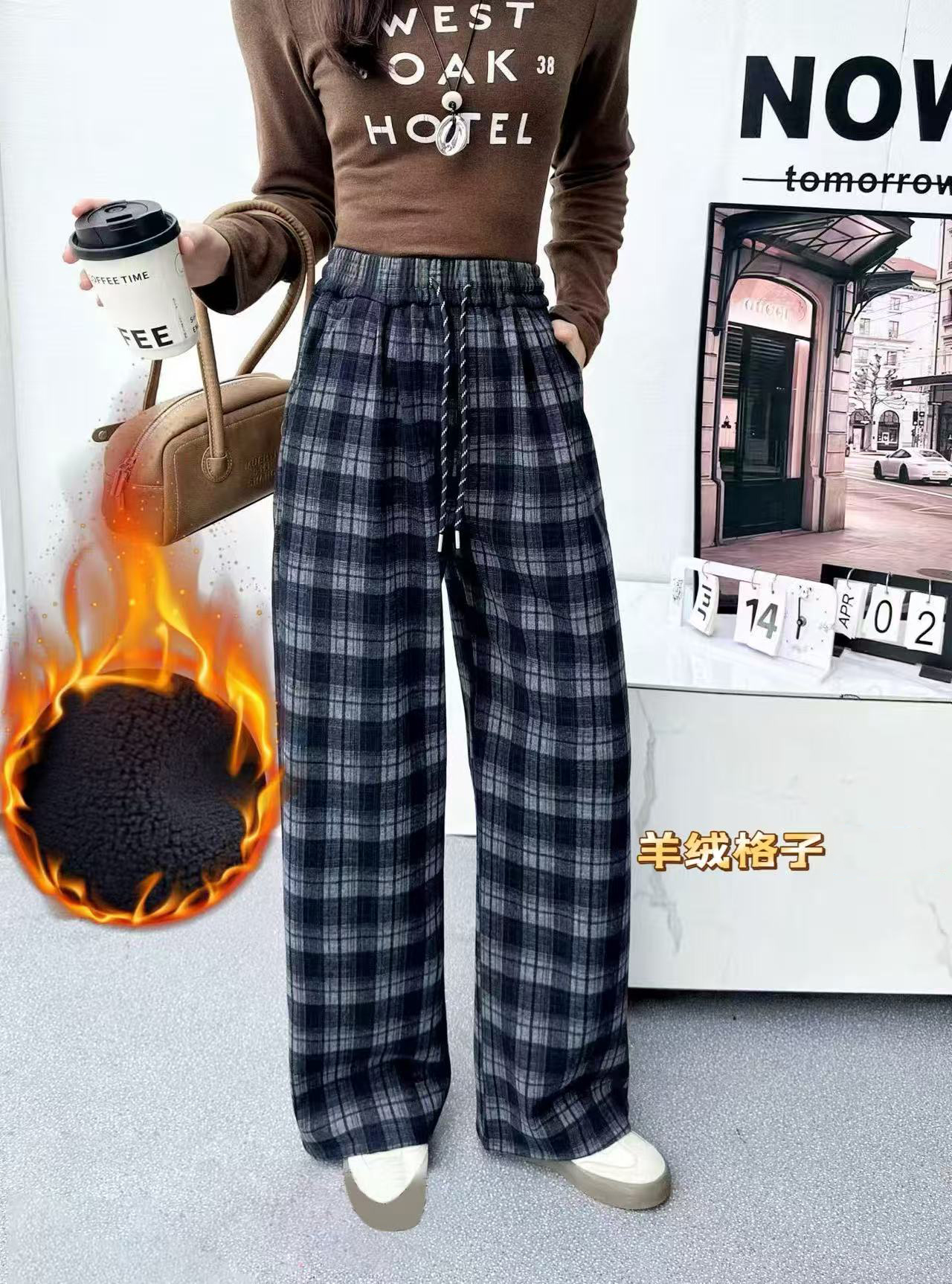 女士格子加绒长裤子阔腿裤冬季女裤【FD25330】