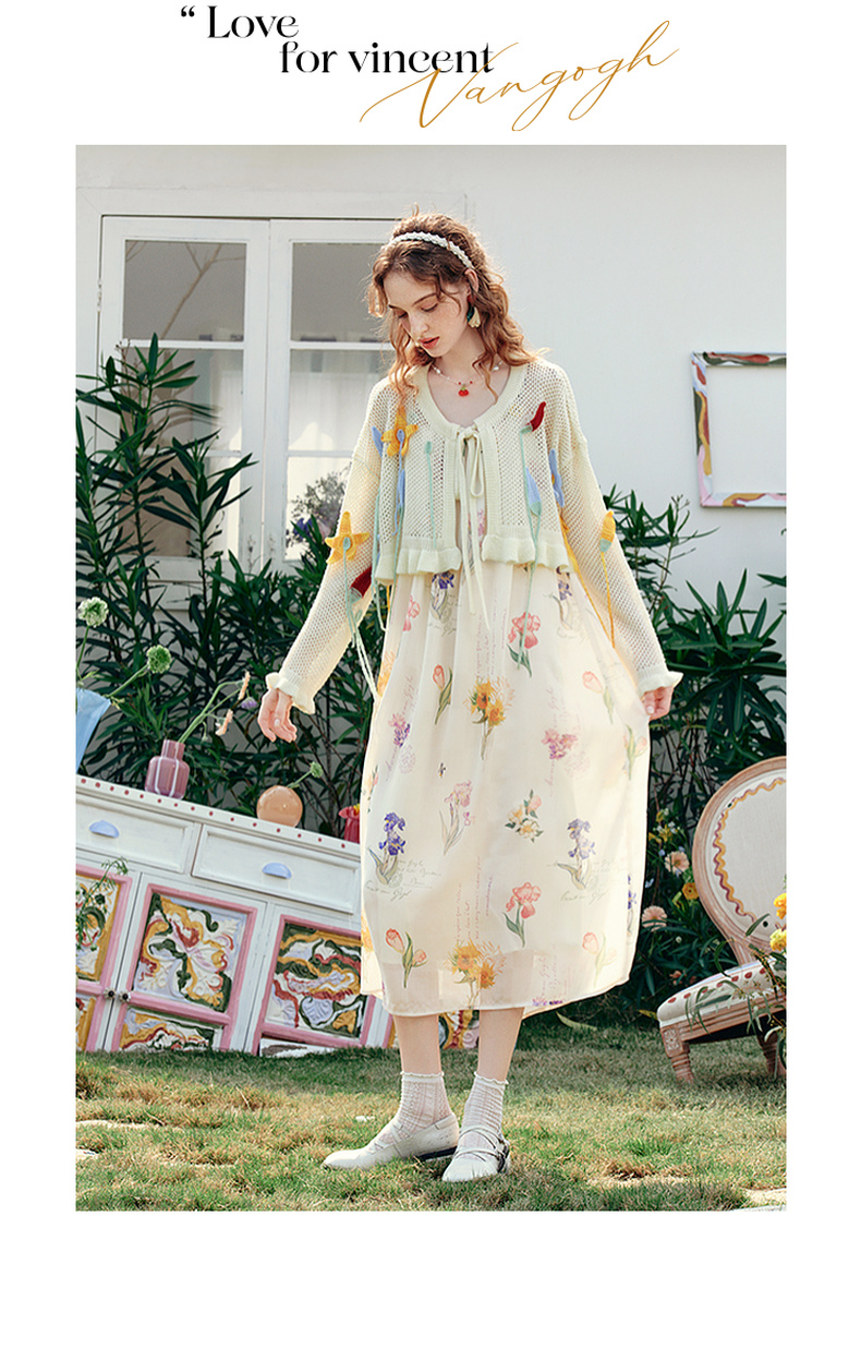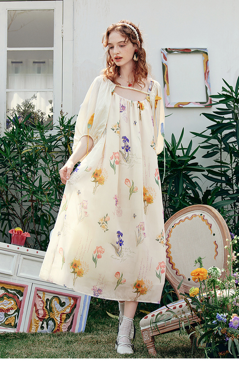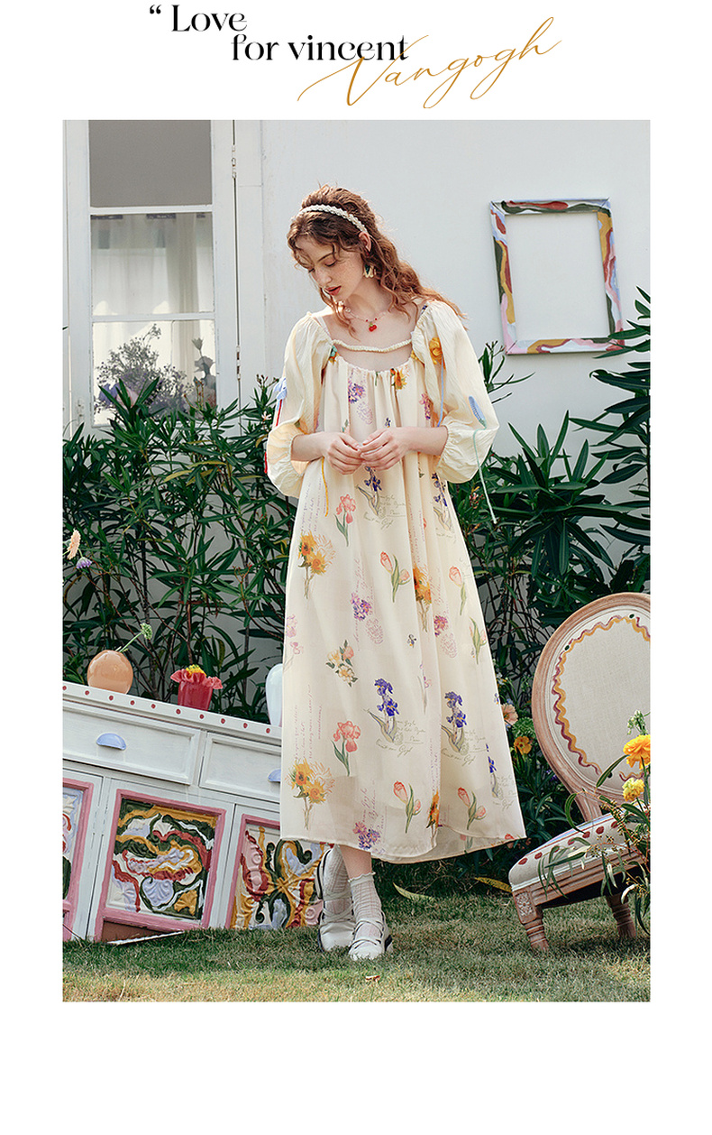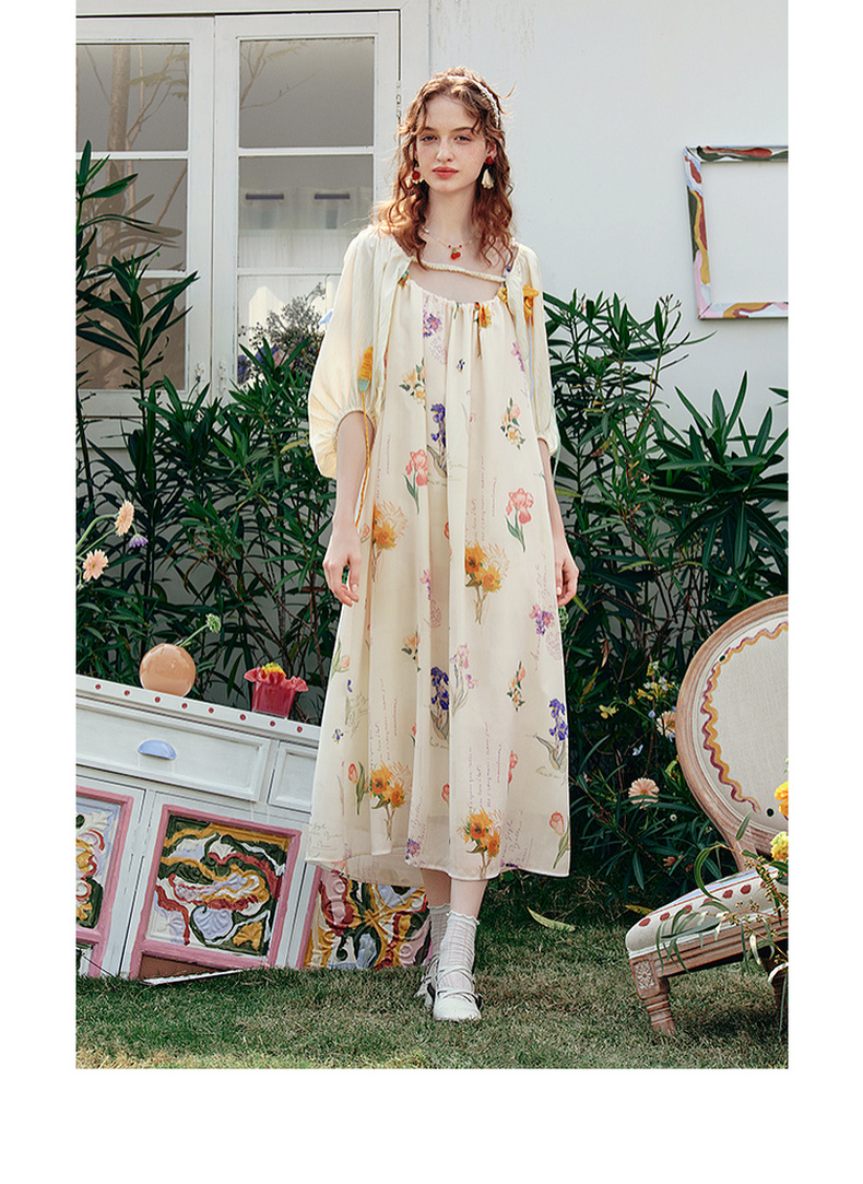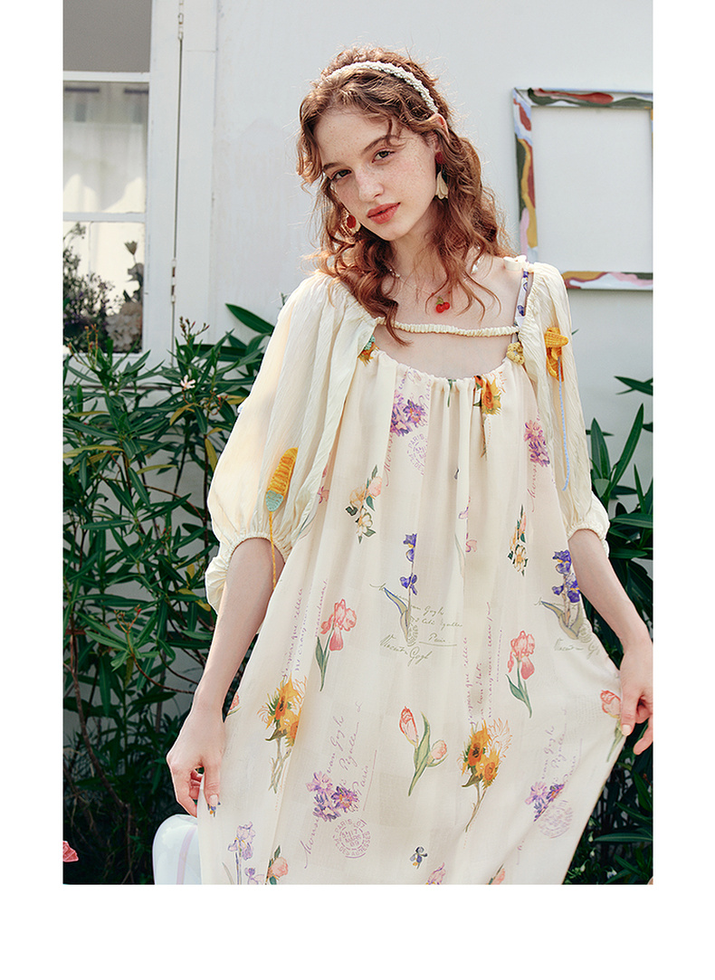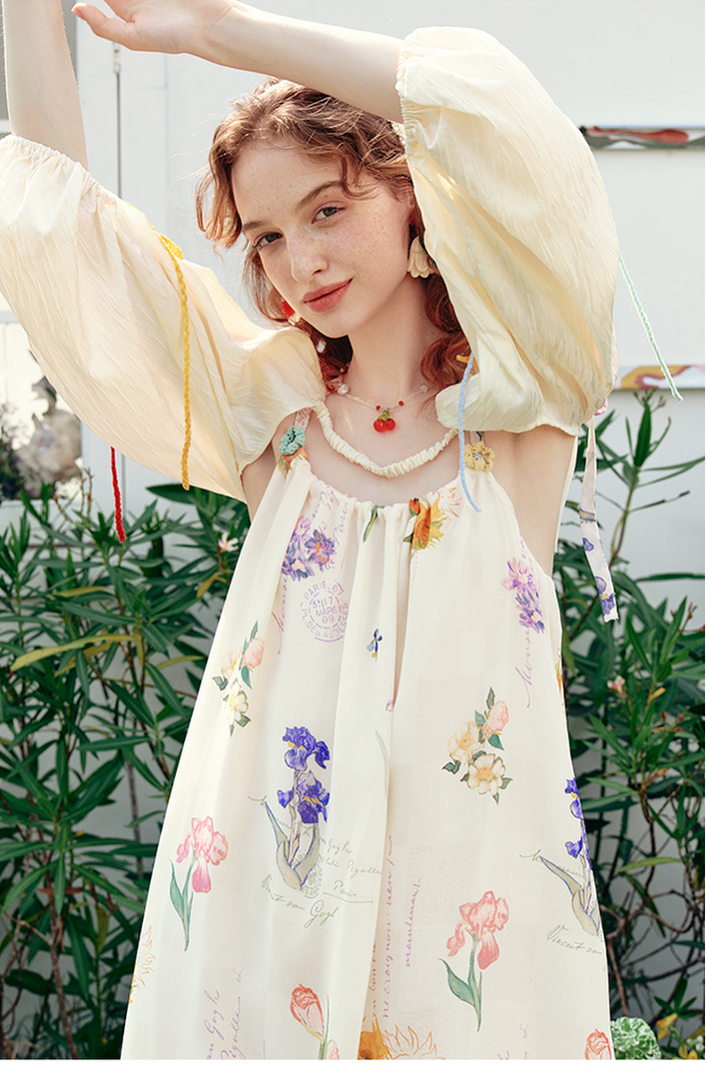 两三事梵高文艺 绻夏微光 2025夏季新款甜美印花泡泡袖两穿连衣裙
