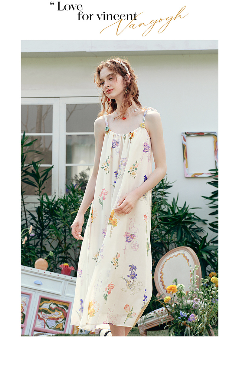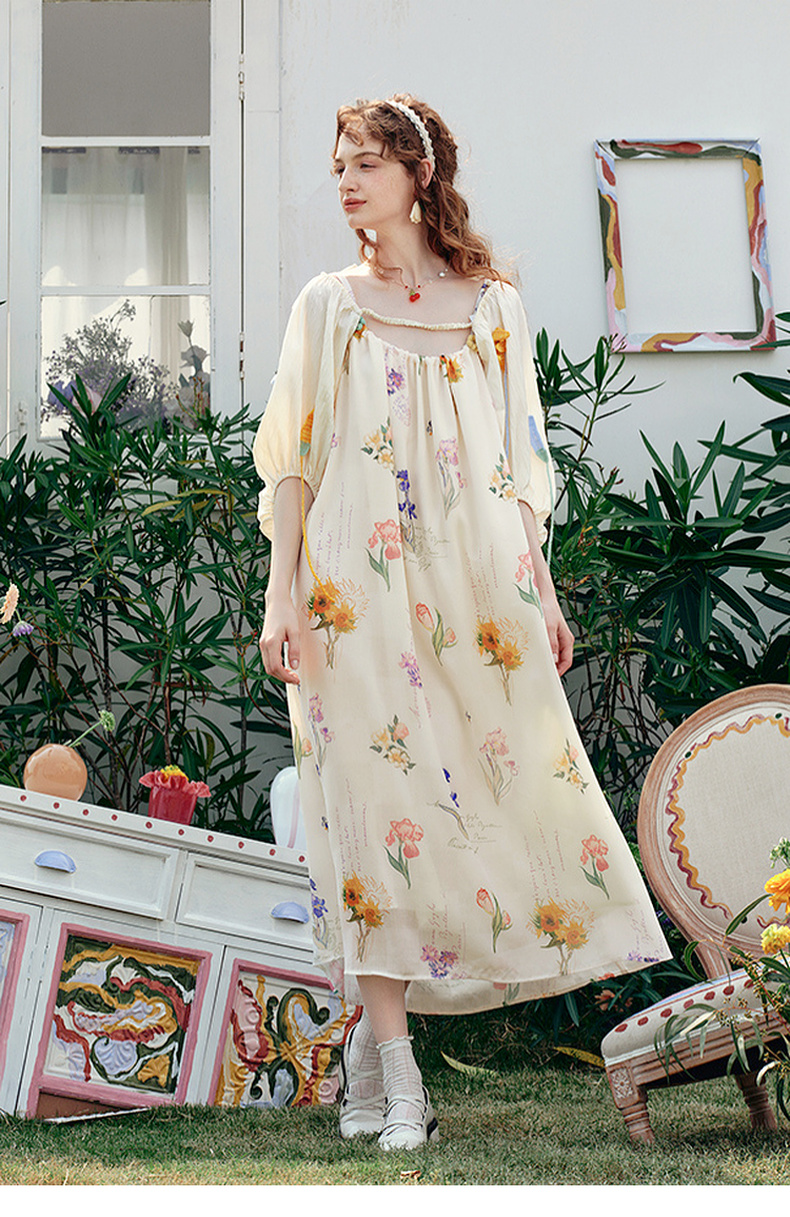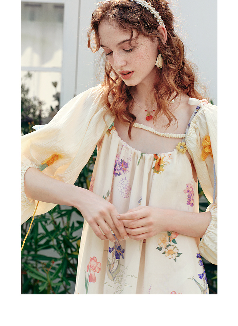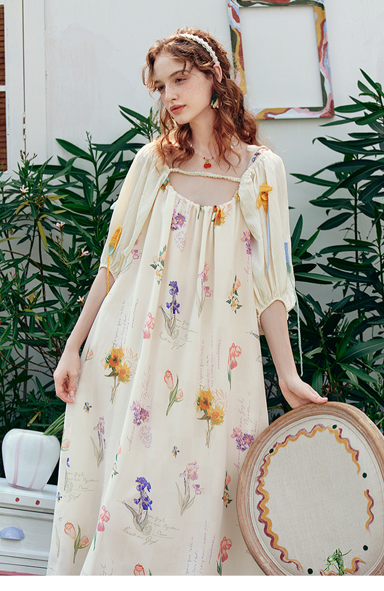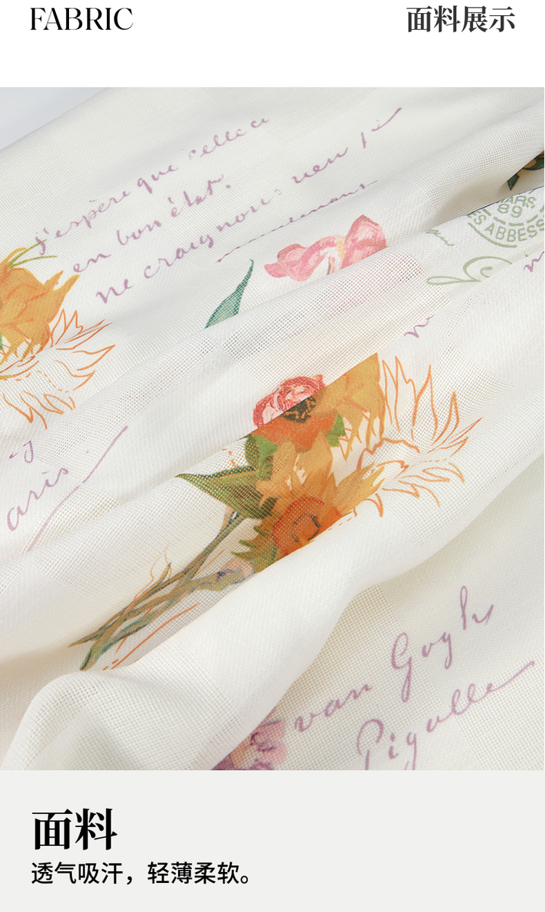 两三事梵高文艺 绻夏微光 2025夏季新款甜美印花泡泡袖两穿连衣裙