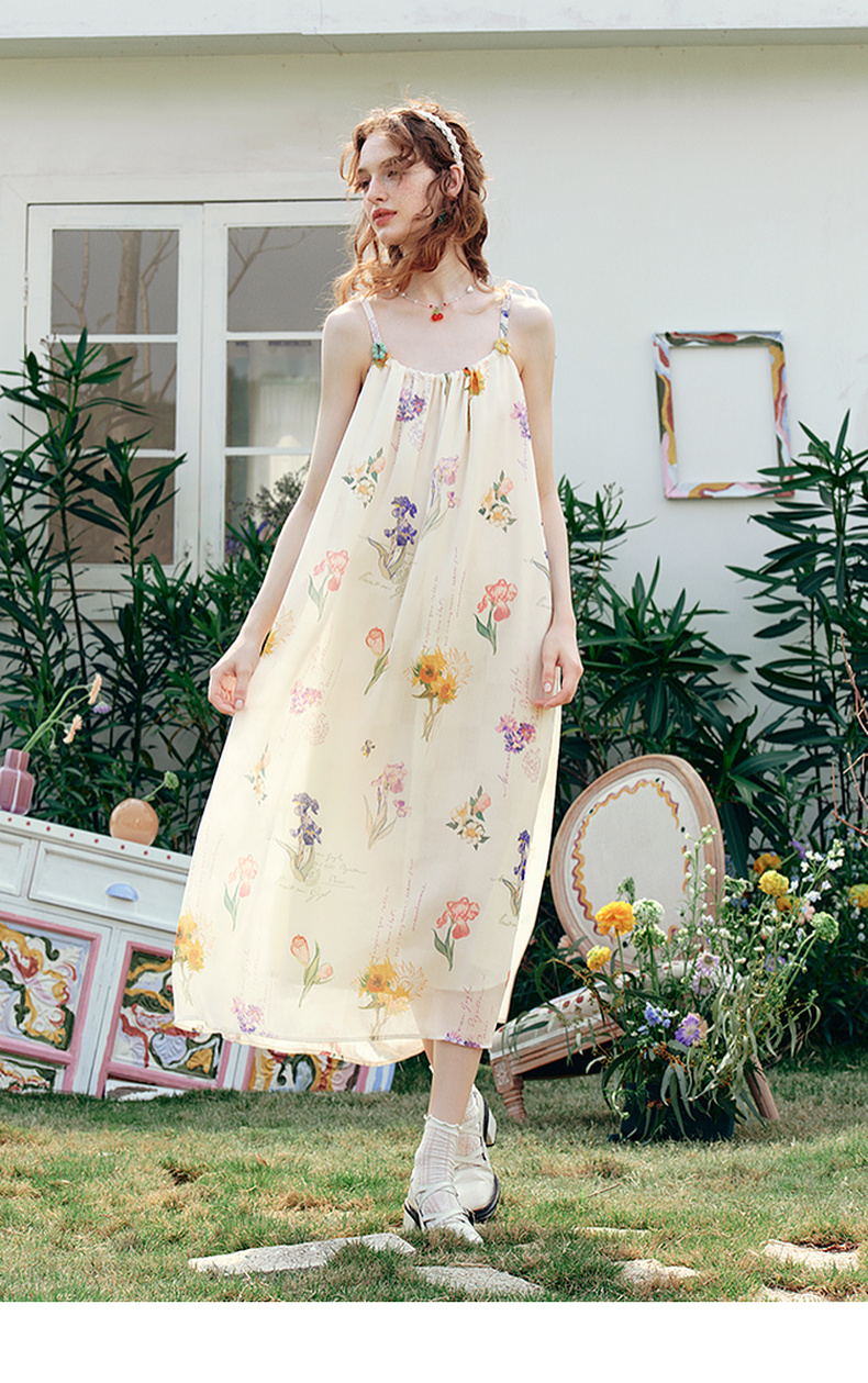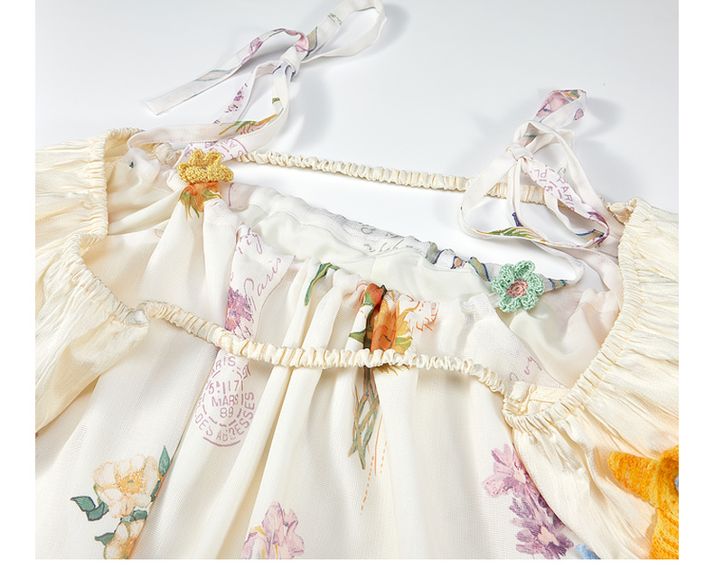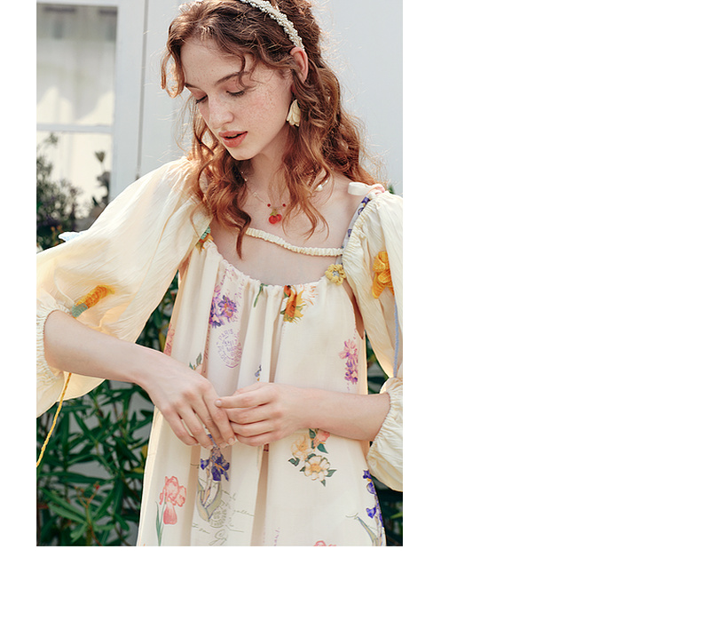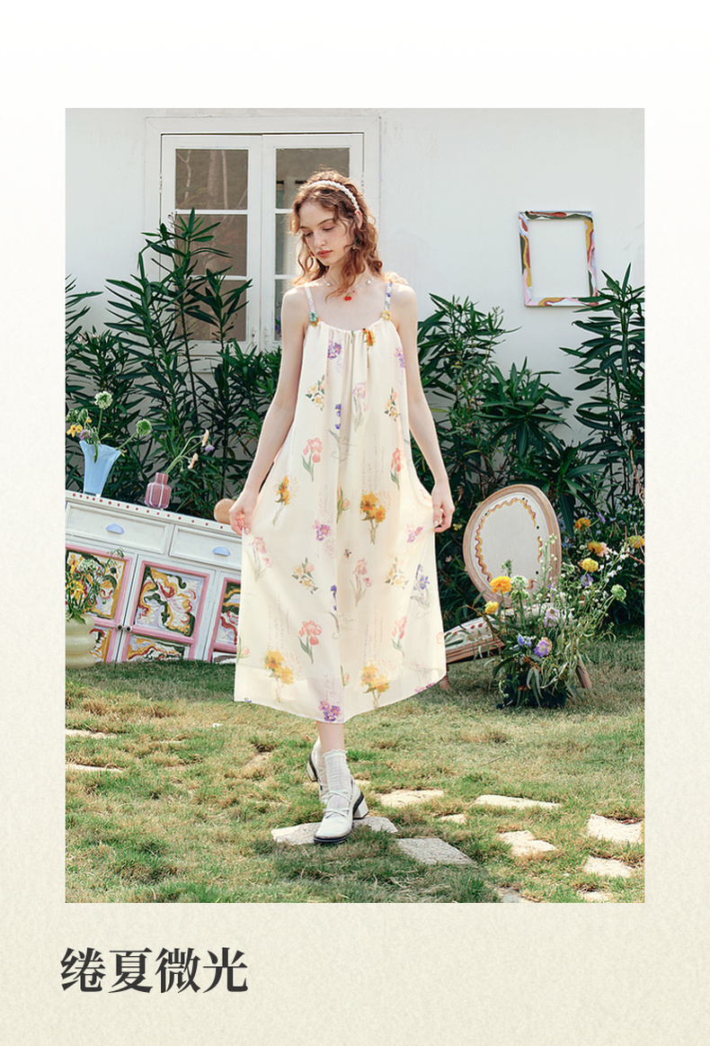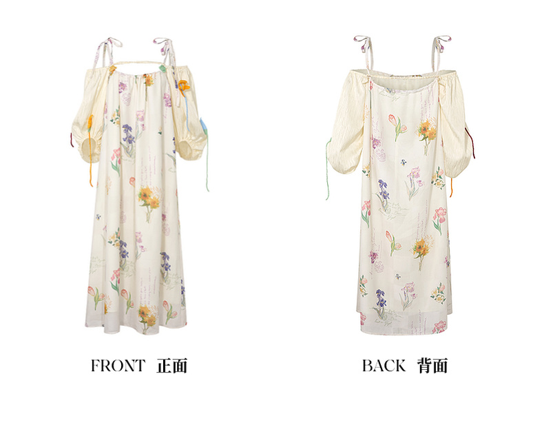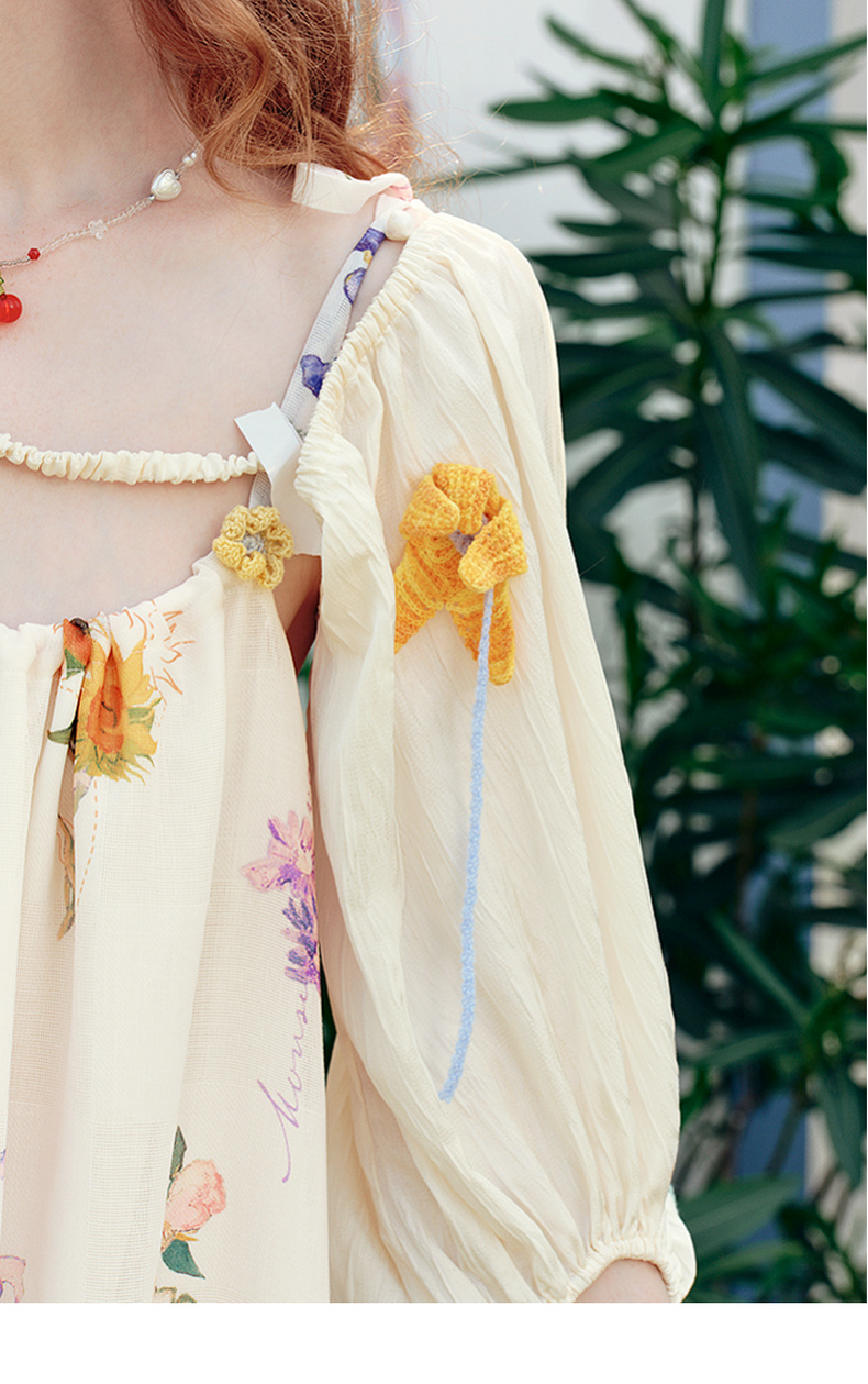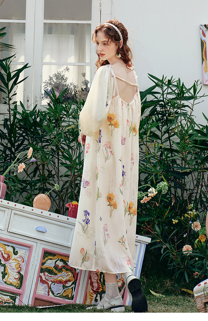 两三事梵高文艺 绻夏微光 2025夏季新款甜美印花泡泡袖两穿连衣裙