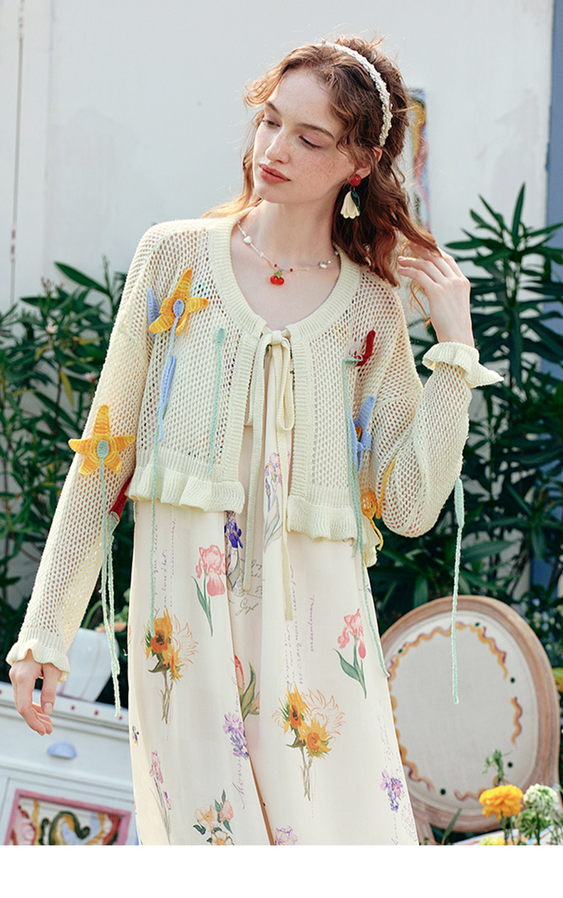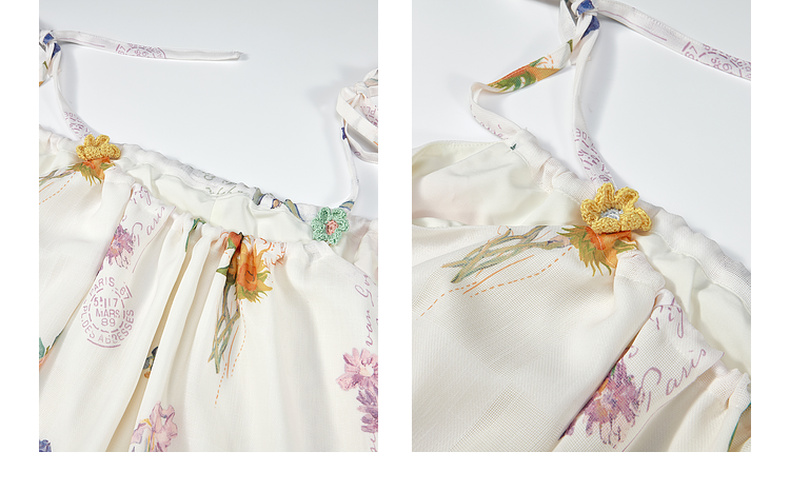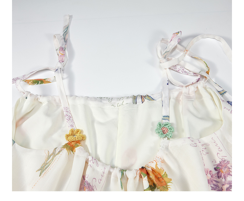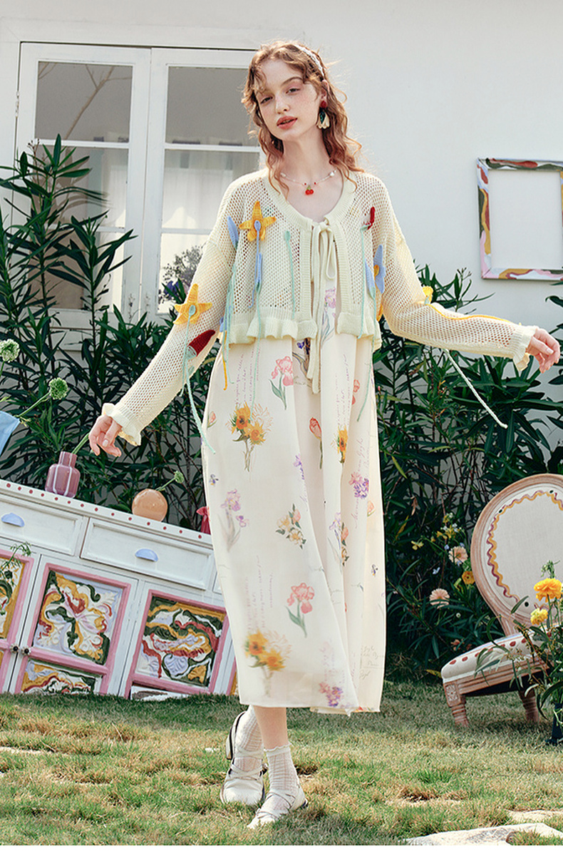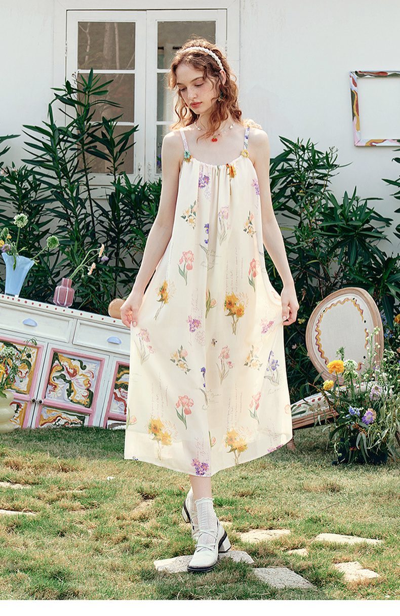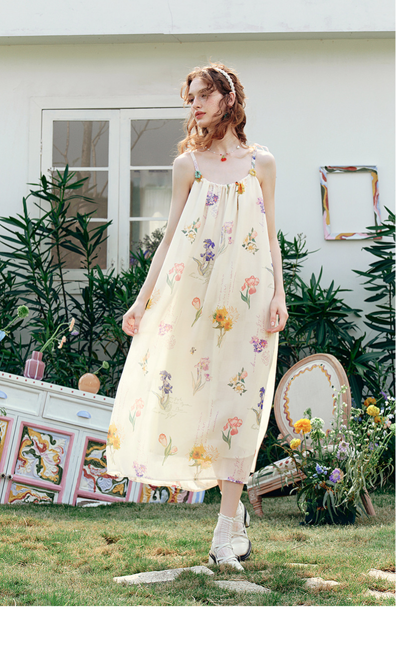 两三事梵高文艺 绻夏微光 2025夏季新款甜美印花泡泡袖两穿连衣裙