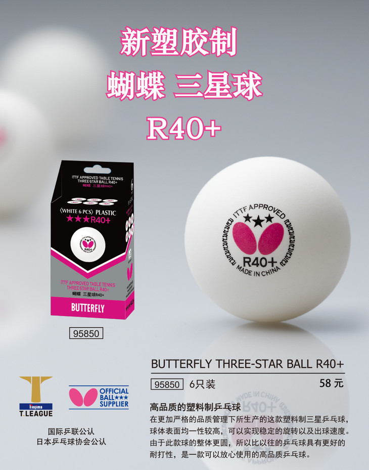 蝴蝶塑料三星R40+乒乓球B95850(6个/盒)