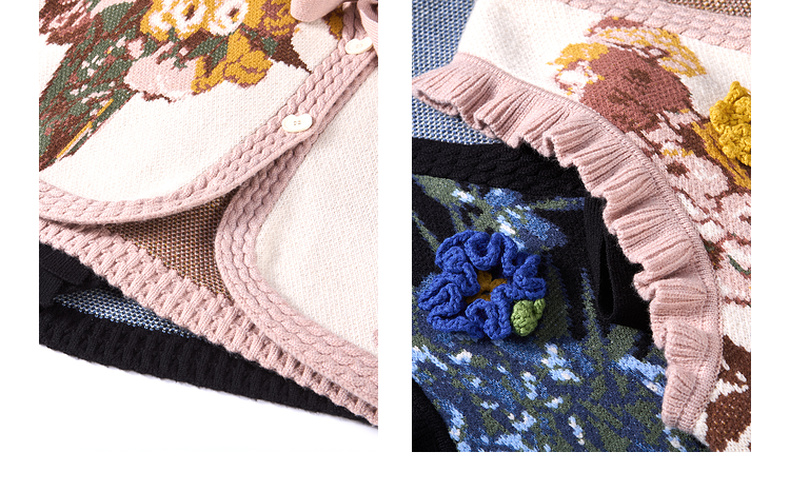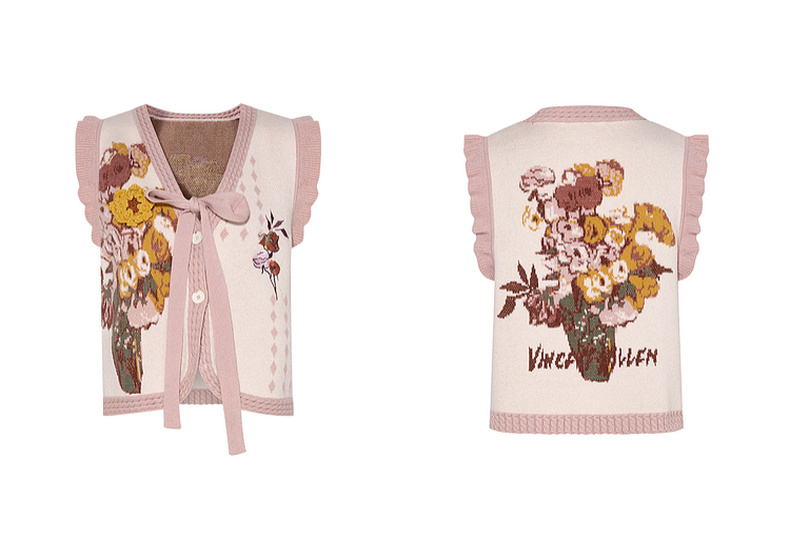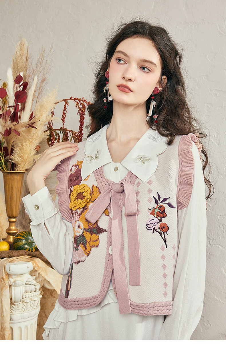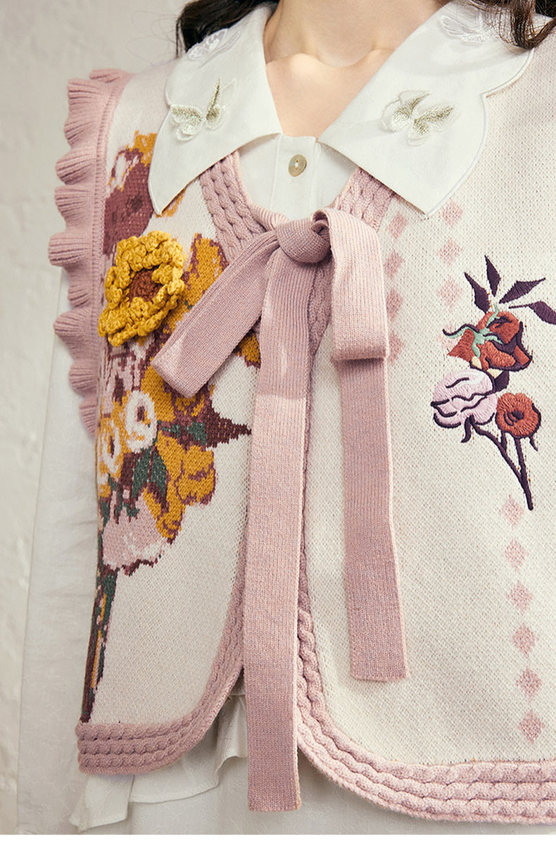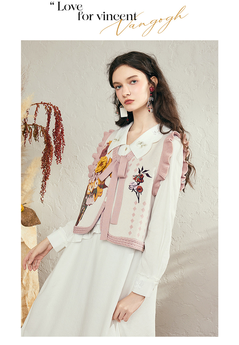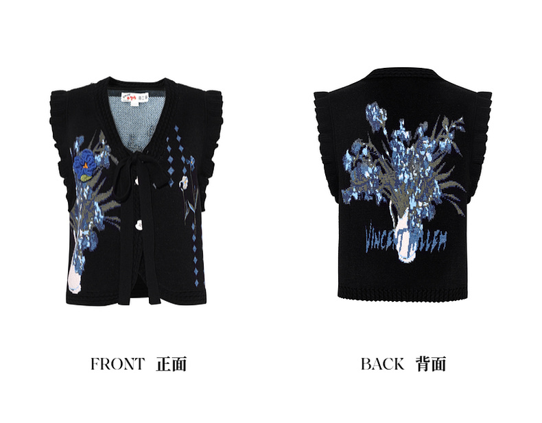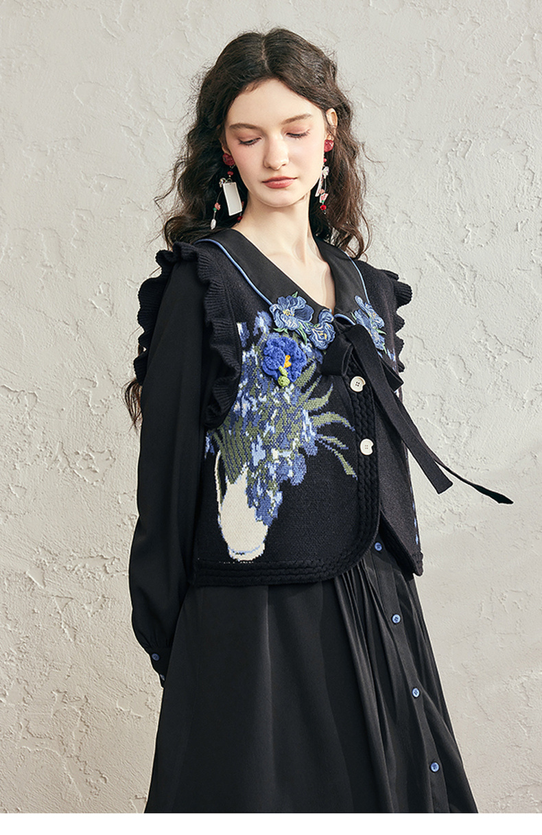 两三事梵高文艺银河甜心2024秋新款花卉图案荷叶边拼接无袖毛衣女