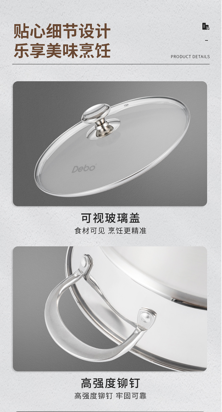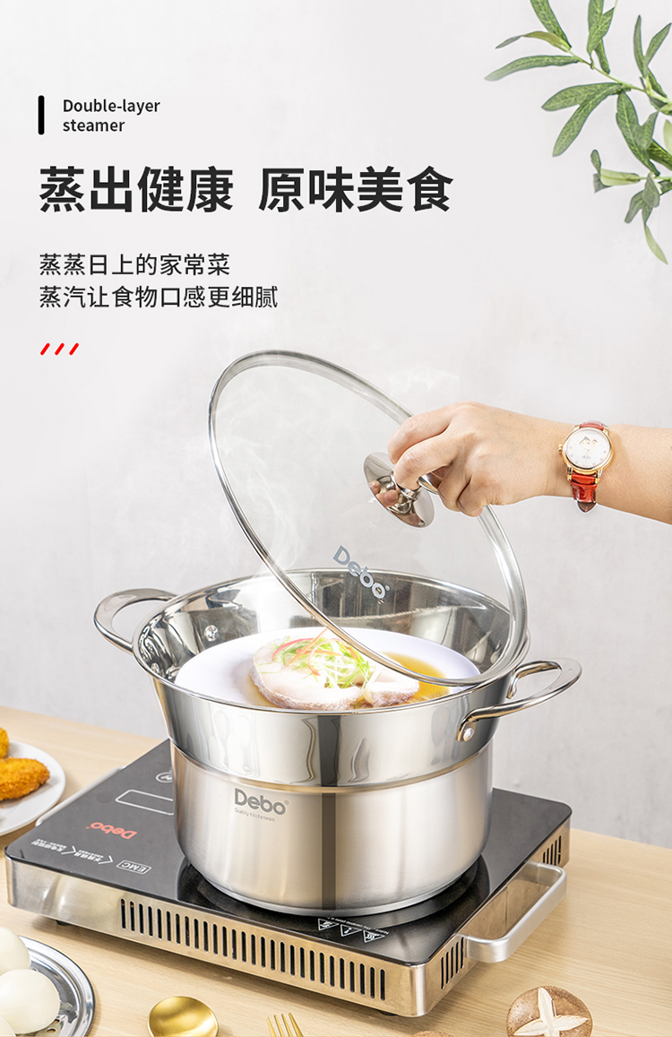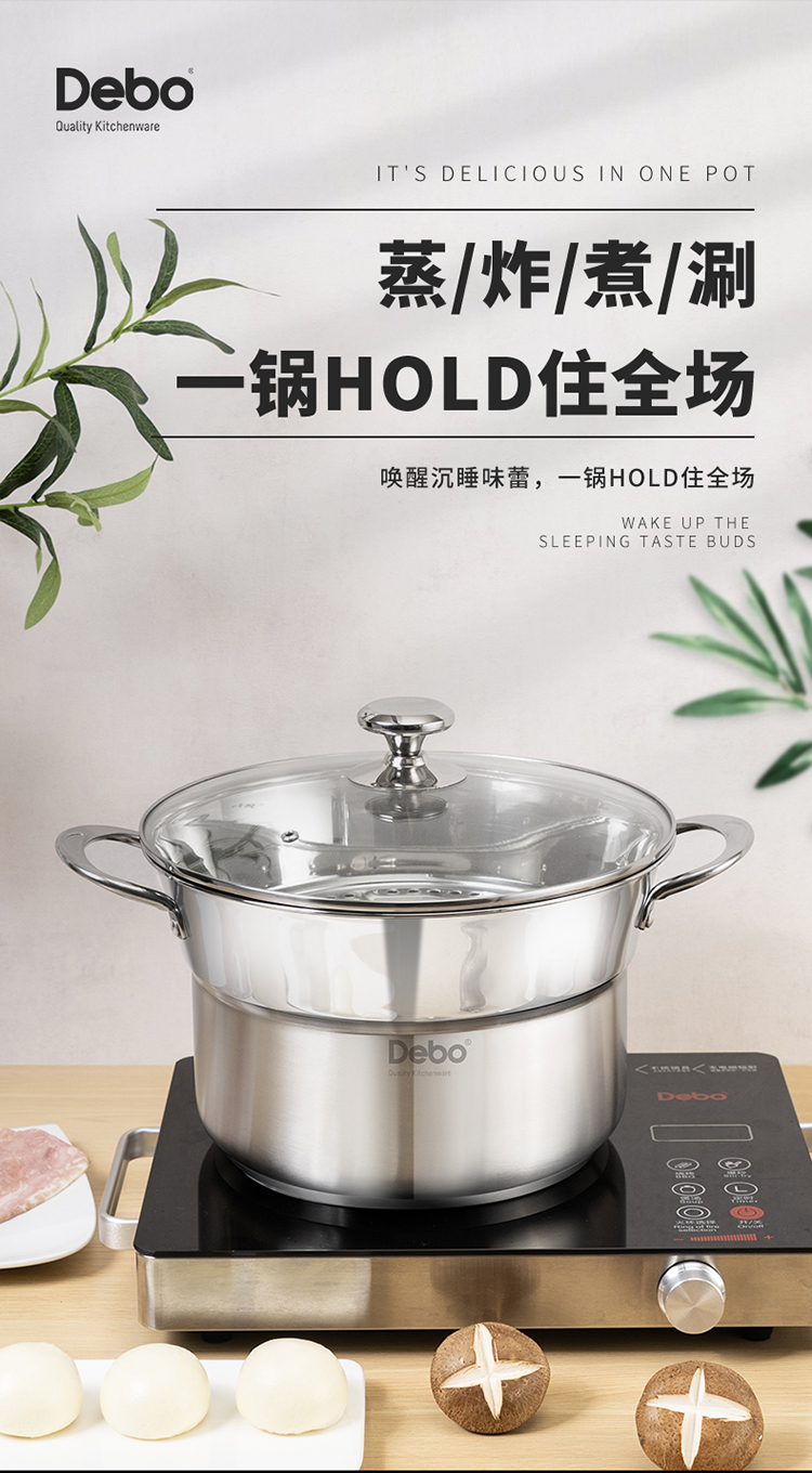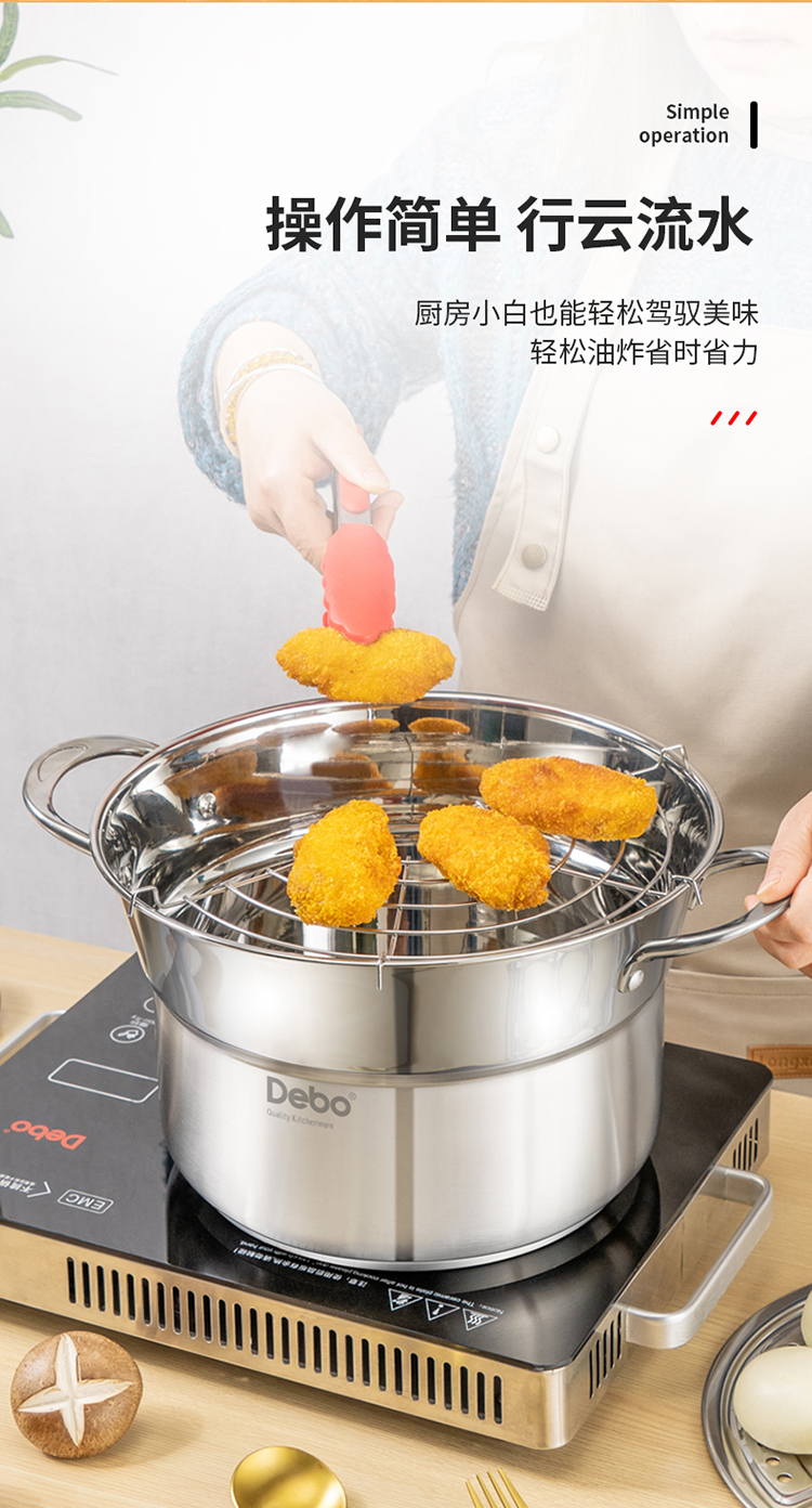 Debo德铂-德勒斯汤锅4L 汤、蒸、炸、煮、滤一锅Hold住全场(配玻璃锅盖、滤油网、蒸片)