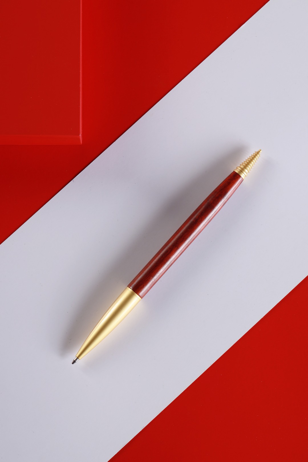 紫檀文昌笔以古朴的黄铜搭配温润的小叶紫檀,简约、质朴,结合了两种材料的优点,既有紫檀木的高贵典雅,又有黄铜的金属质感。