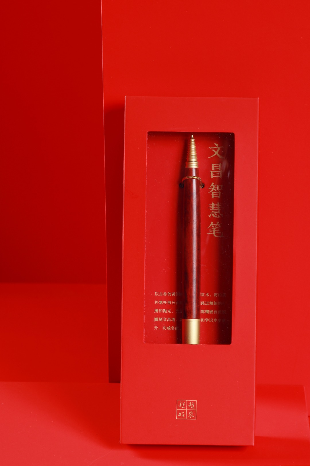 紫檀文昌笔的设计独特而精美。它的笔杆部分由紫檀木制成,经过精细的打磨和抛光,光滑而细腻。笔杆上部镶嵌有黄铜雕刻文昌塔,寓意着智慧和学识。黄铜的金属质感和紫檀木的质感形成了鲜明的对比,使得整支文昌笔更加独特和吸引人。