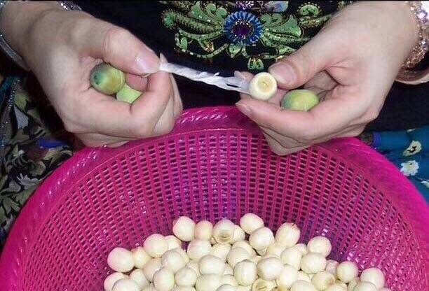 手工去除莲衣莲皮,并取出莲子心,十分费心费力