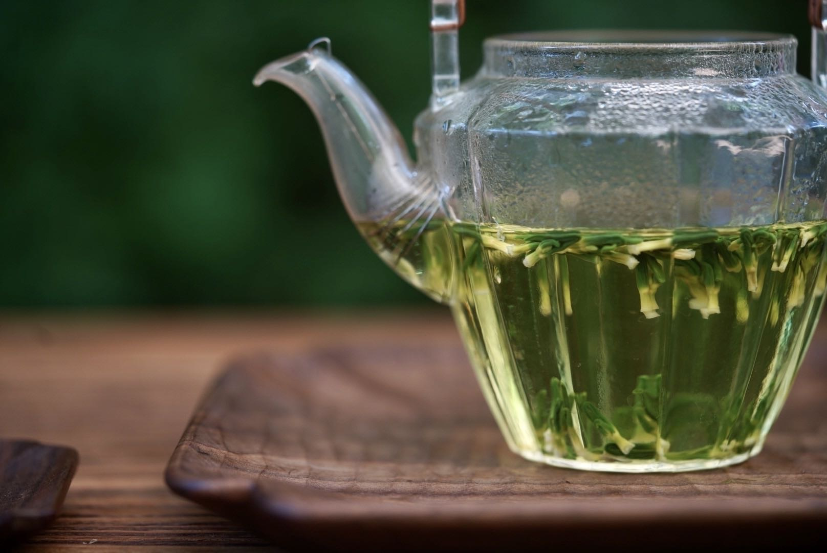 冲泡后的莲子心茶汤,汤色淡绿,晶莹剔透,入口略苦