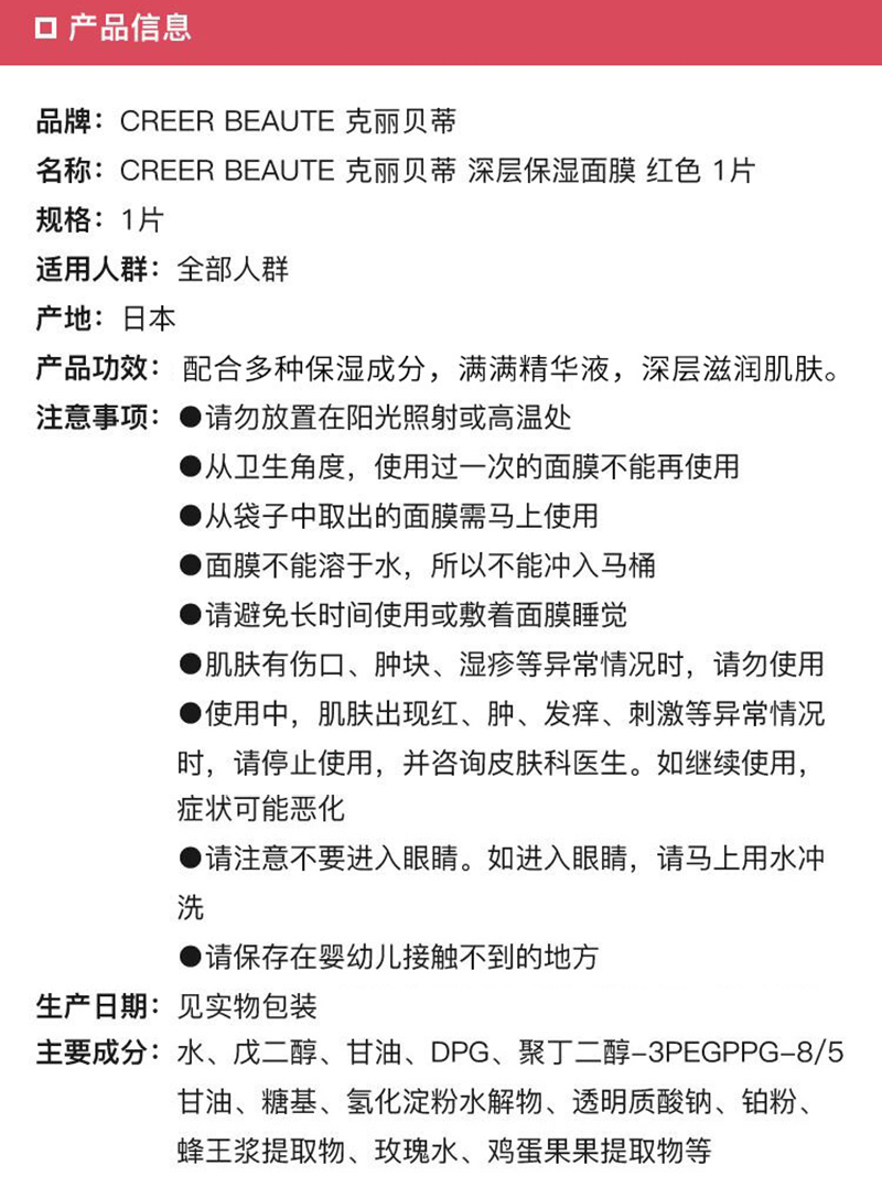 凡尔赛 玫瑰金润透亮保湿面膜 单片(金)