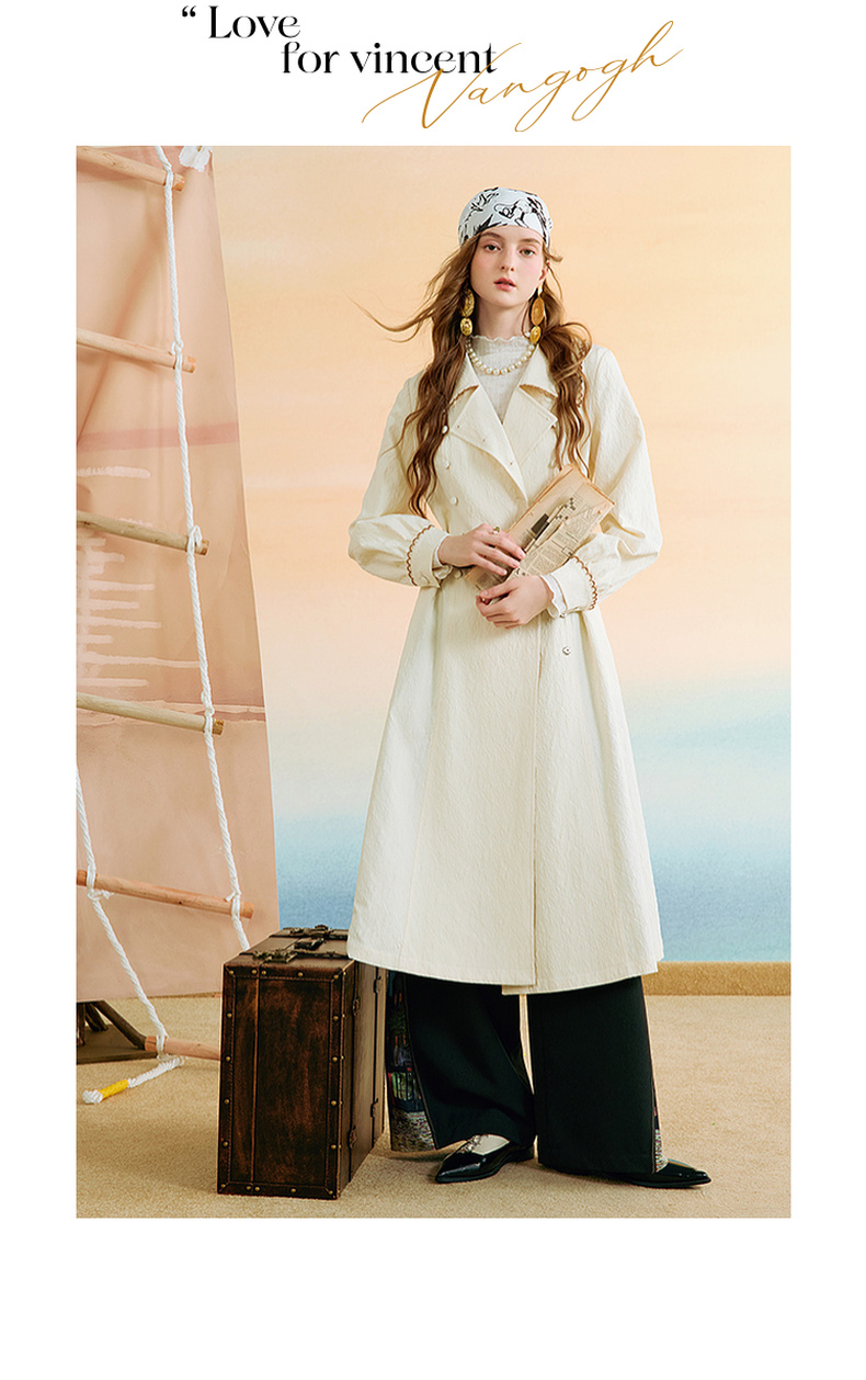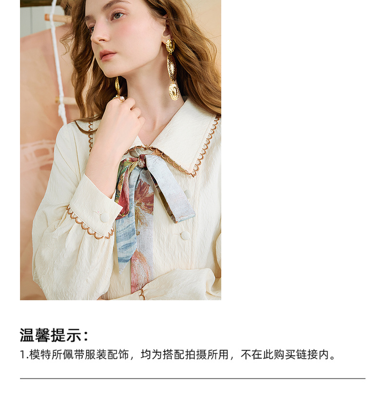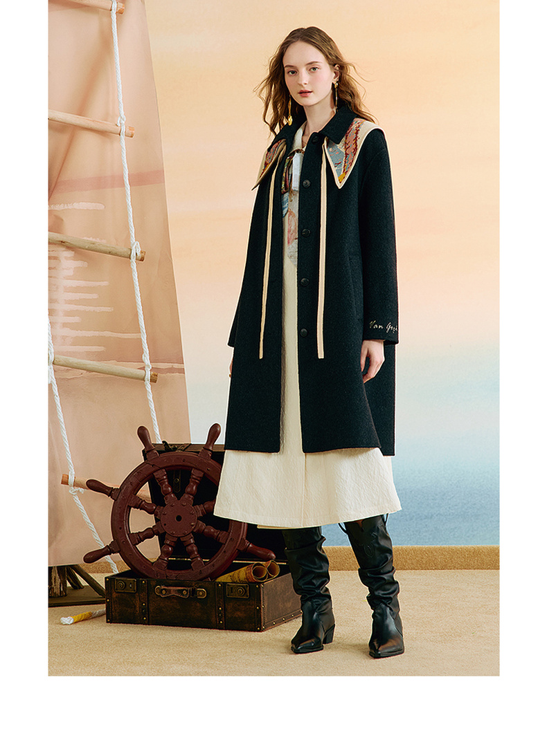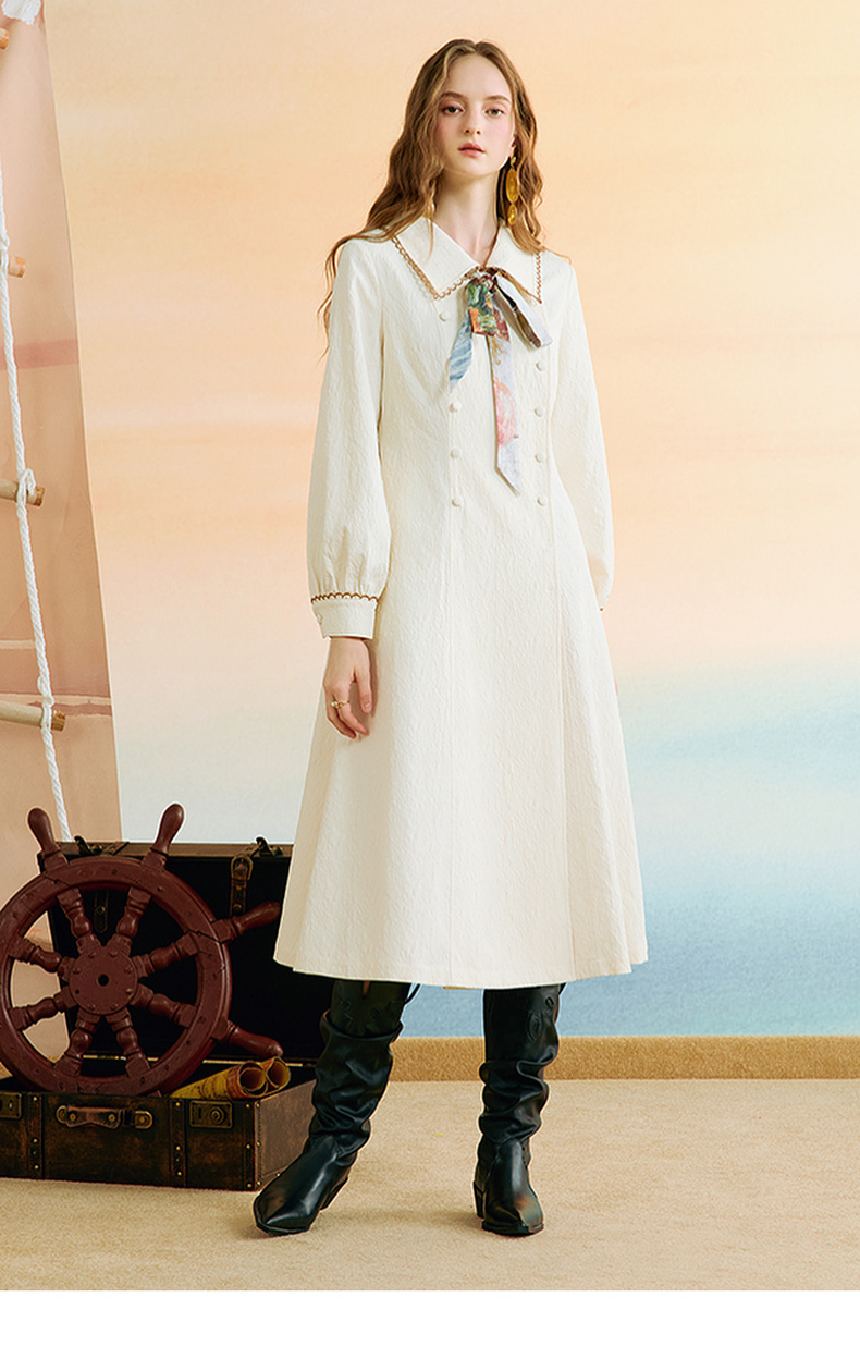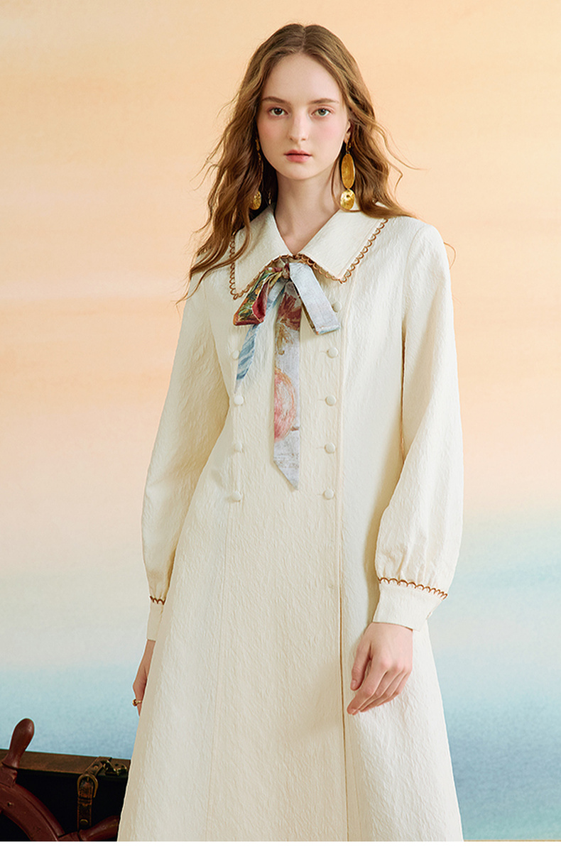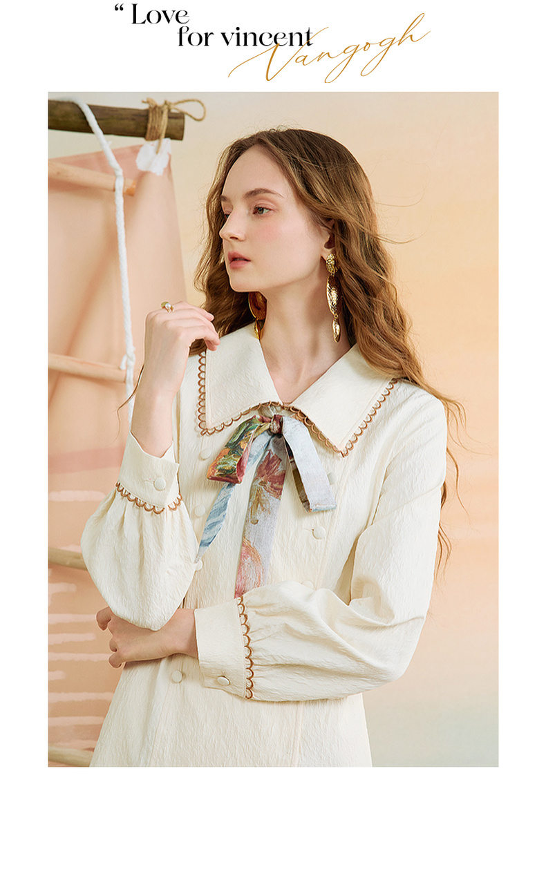 两三事梵高文艺 月落潮汐 2025秋季新款印花可拆领带双排扣连衣裙