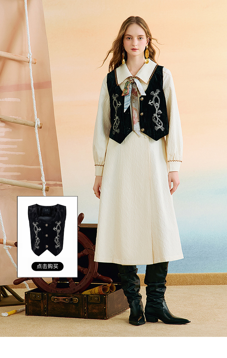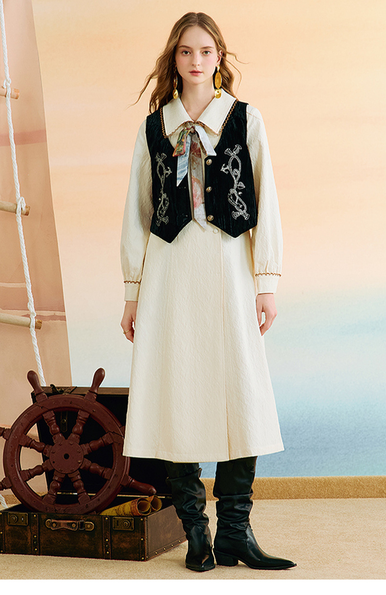 两三事自在如风 春季新款复古公主袖褶皱v领两件套连衣裙长裙