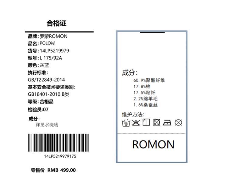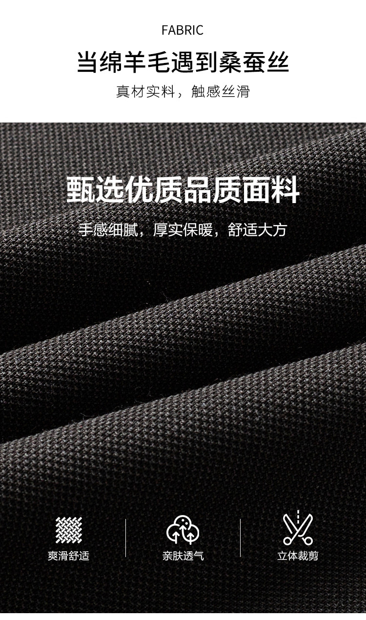 面料:60.9%聚酯纤维 17.8%棉 17.5%粘纤 2.2%绵羊毛 1.6%桑蚕丝