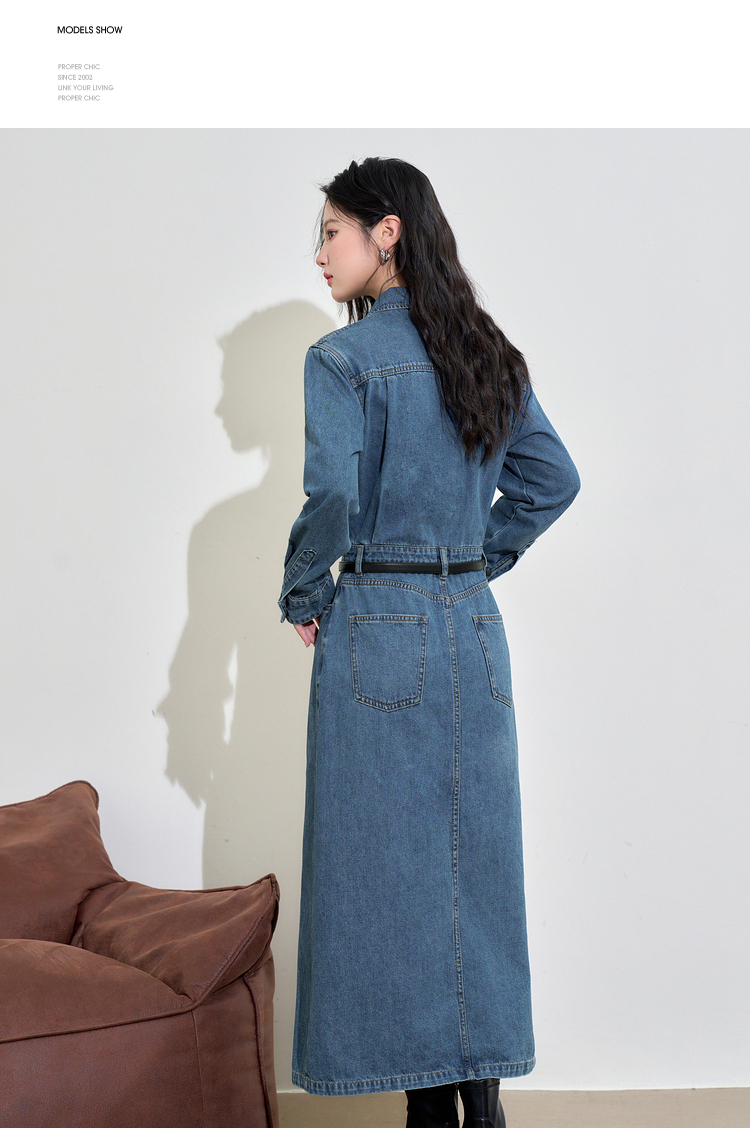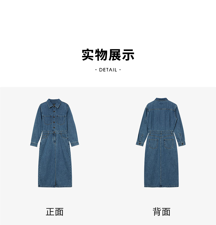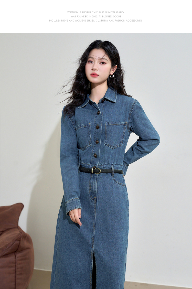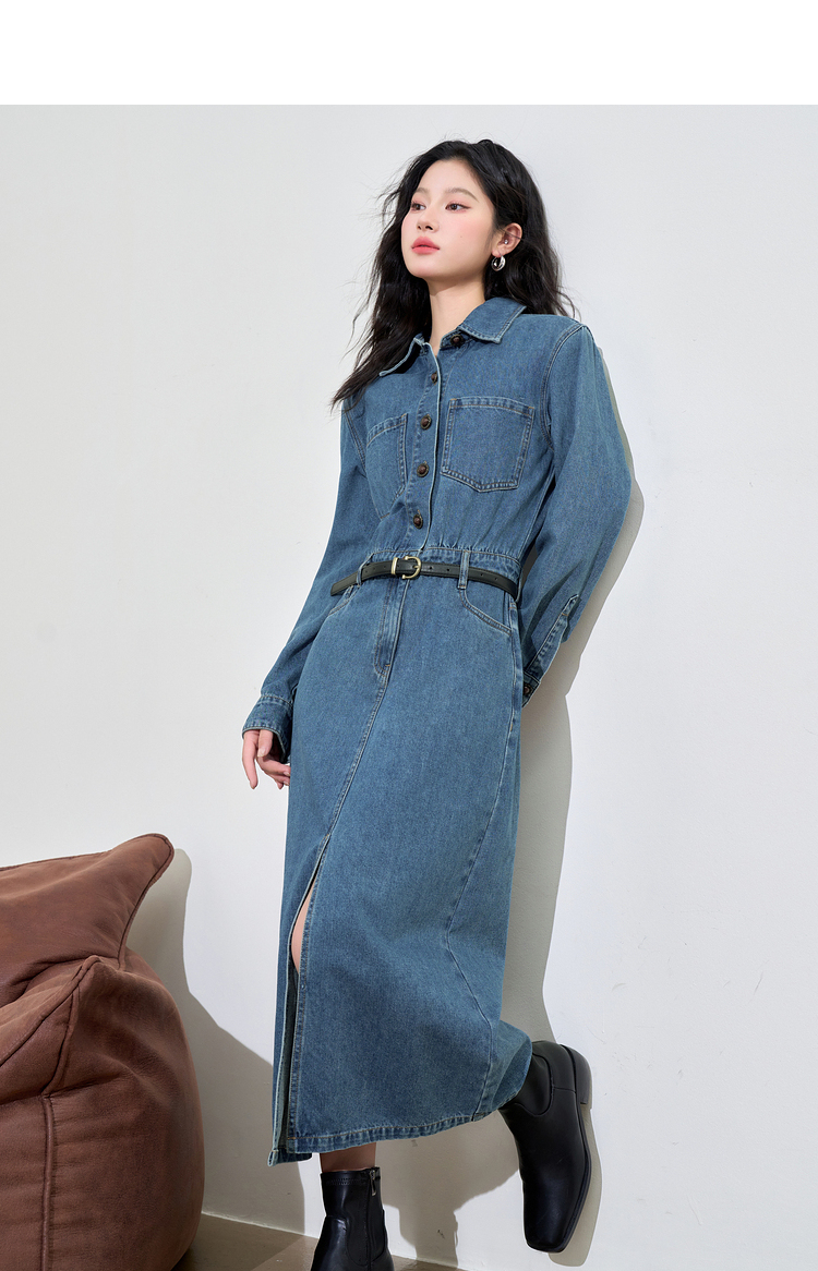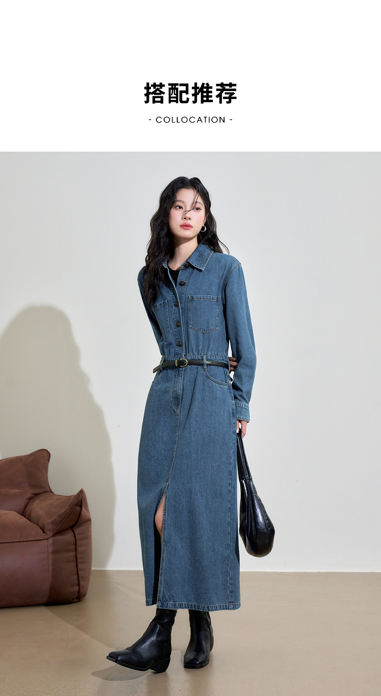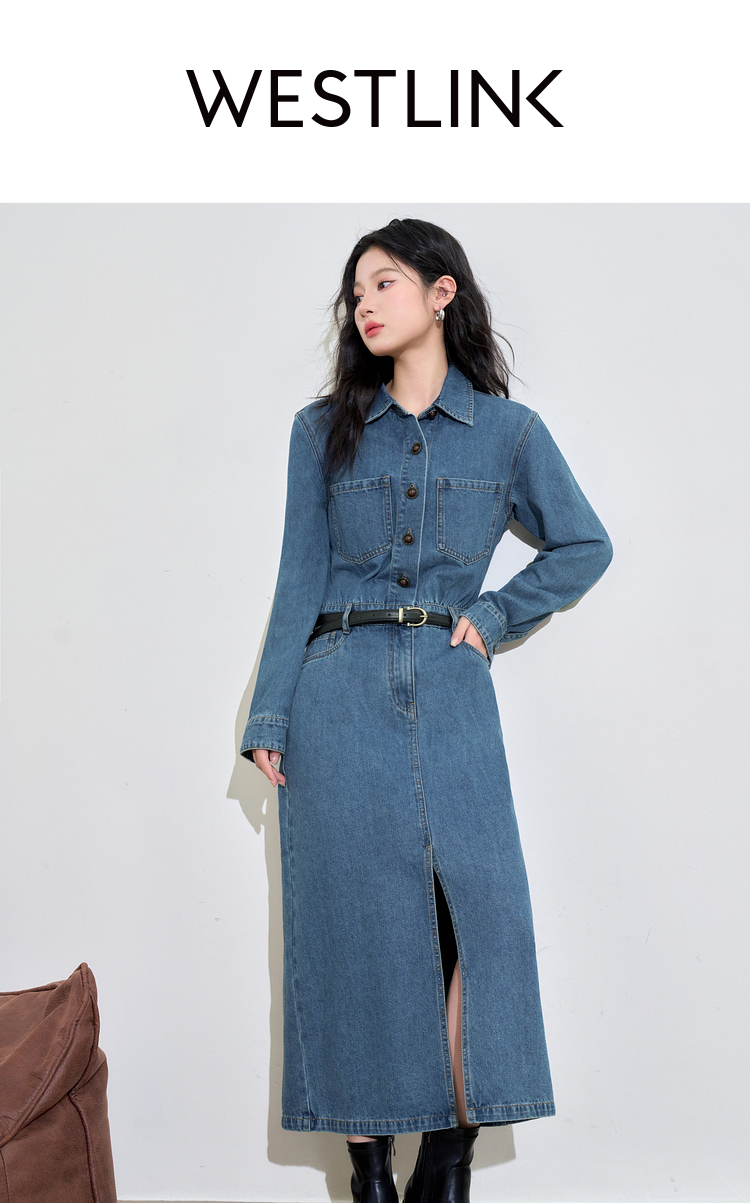 西遇长袖牛仔连衣裙女新款蓝色中长款宽松时尚衬衫裙D3342298