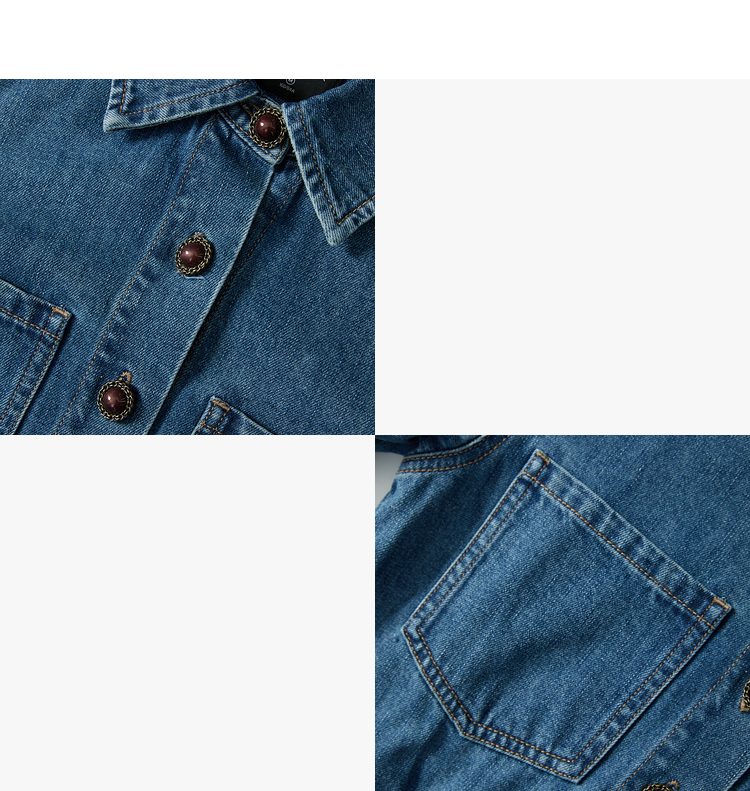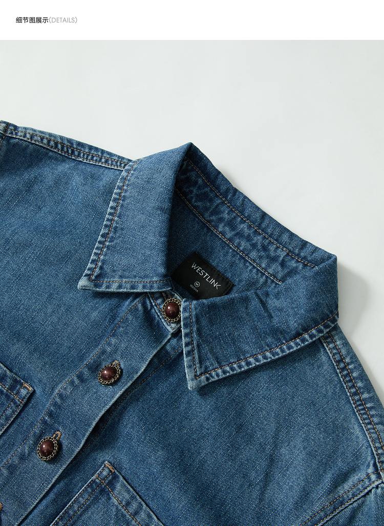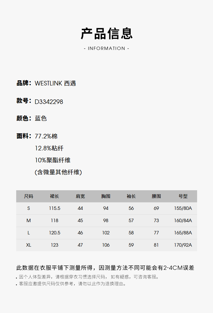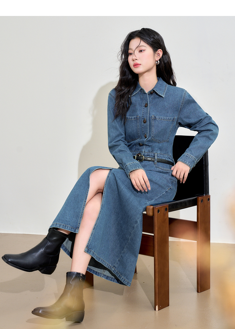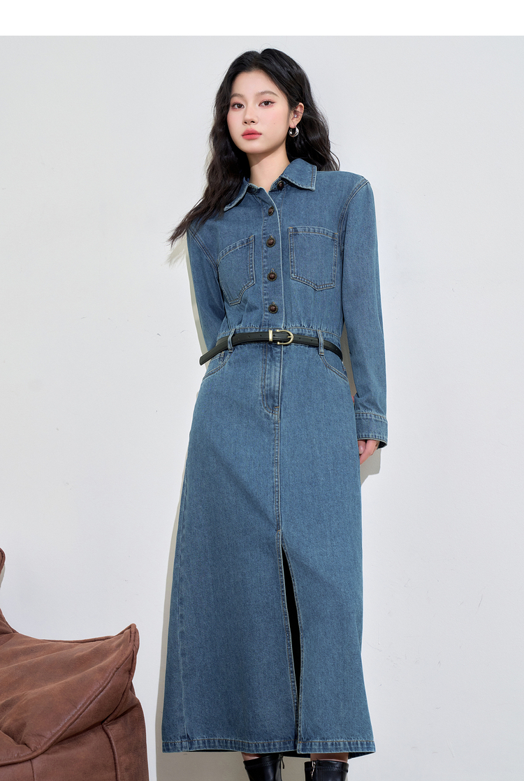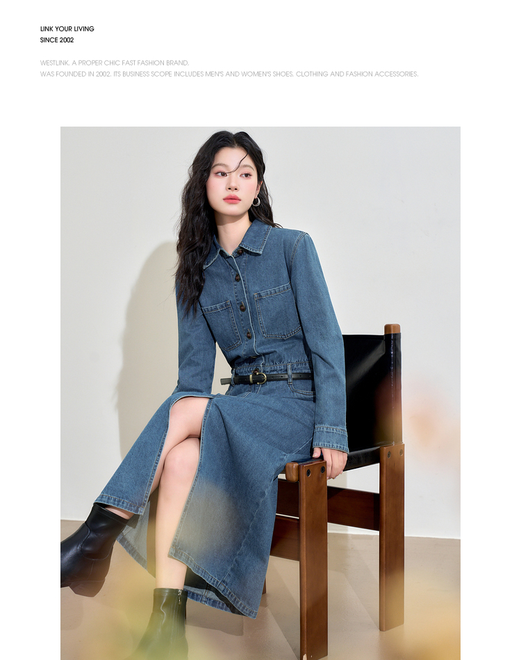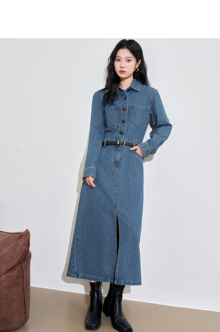 西遇长袖牛仔连衣裙女新款蓝色中长款宽松时尚衬衫裙D3342298