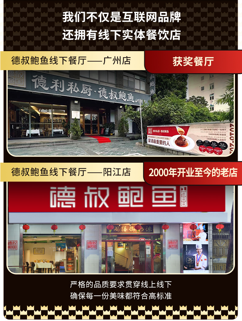 德叔鲍鱼官方商城,客服热线:4006111977 德叔鲍鱼创始于1988年,专注鲍鱼研究34年。线下粤菜餐厅,主打溏心干鲍,荣获米其林和黑珍珠等称号。线上全平台推广,本商城提供微信端的便捷购买。